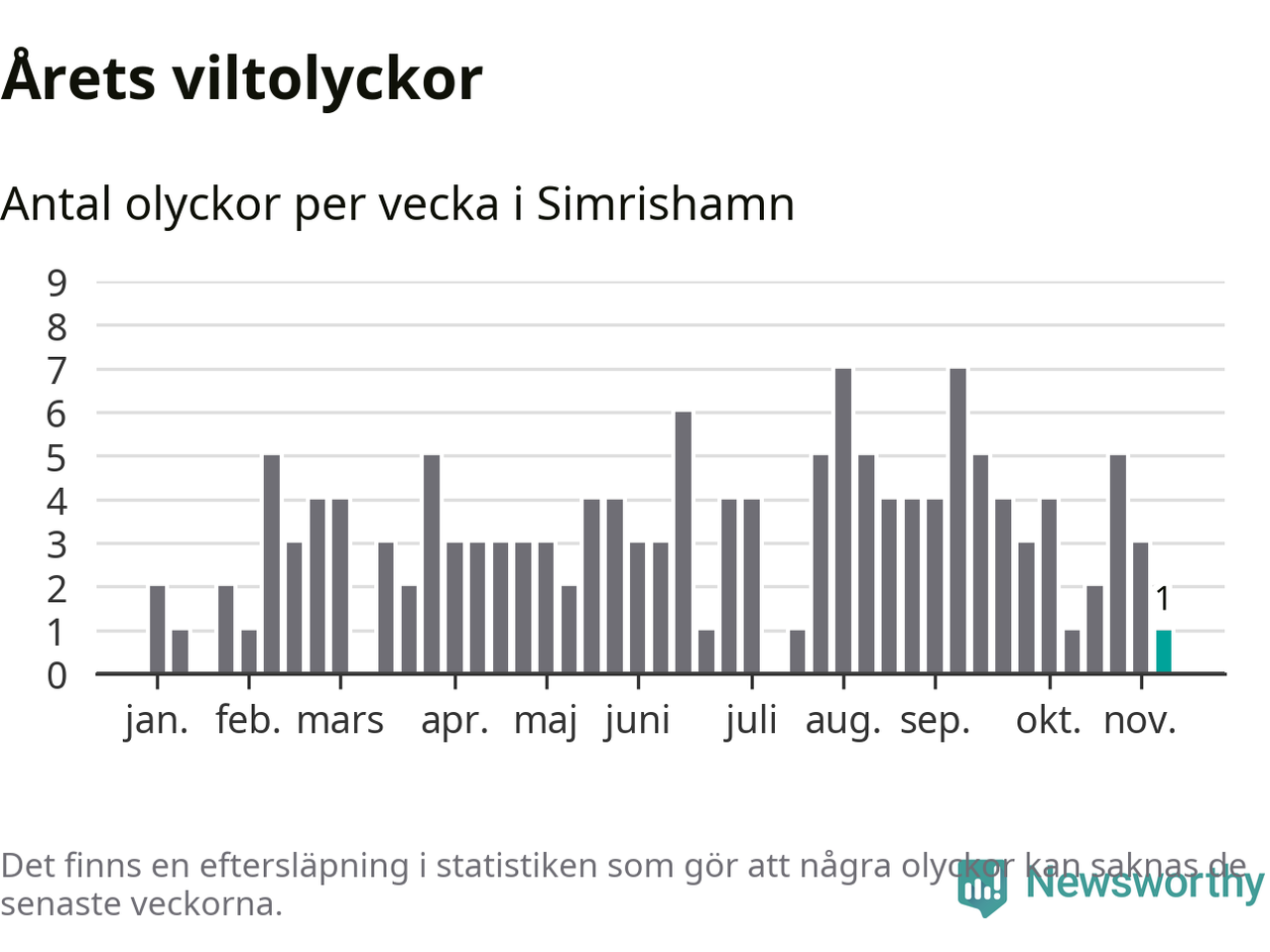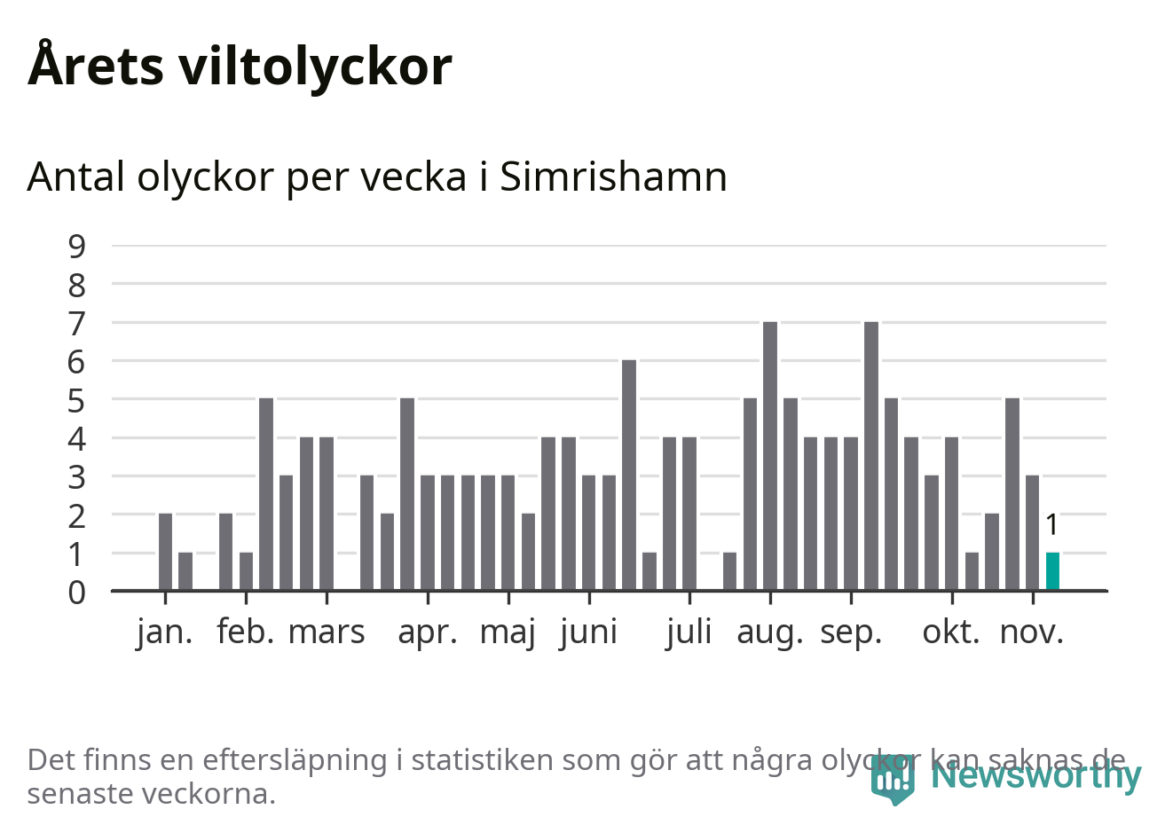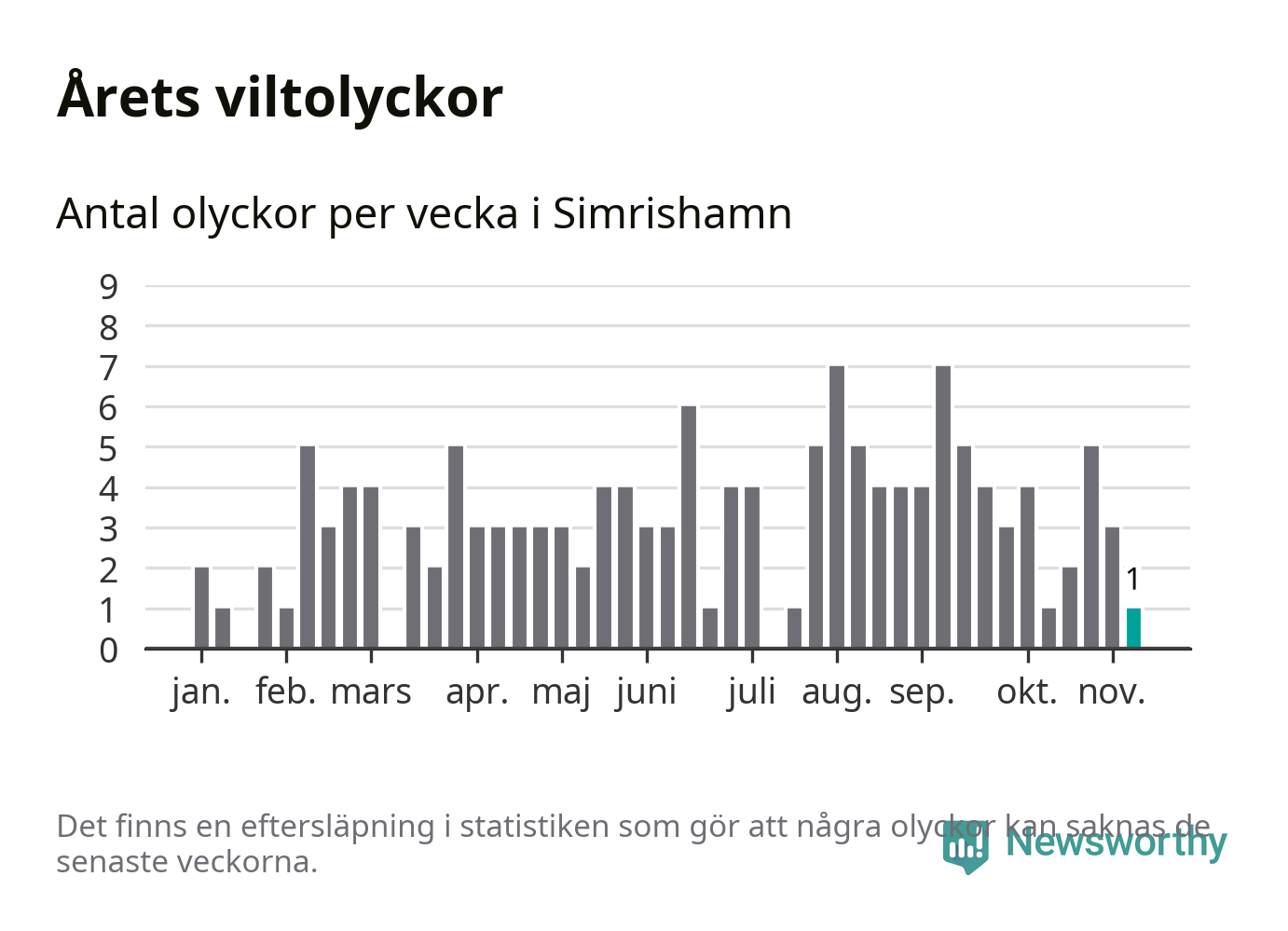 Från förra veckan (vecka 46) har hittills en viltolycka rapporterats in i Simrishamns kommun.