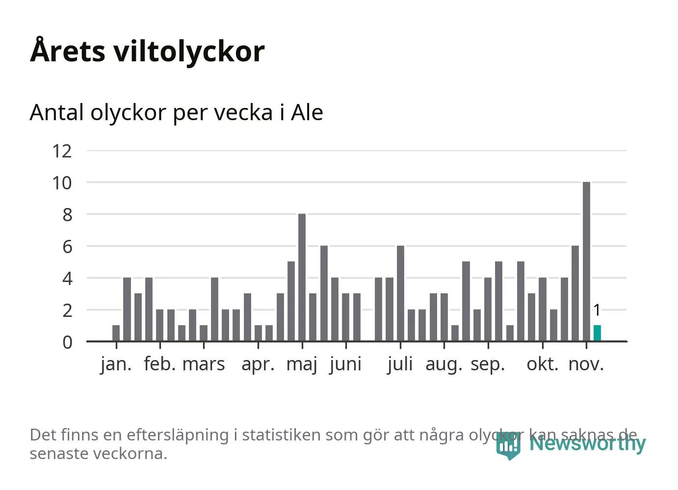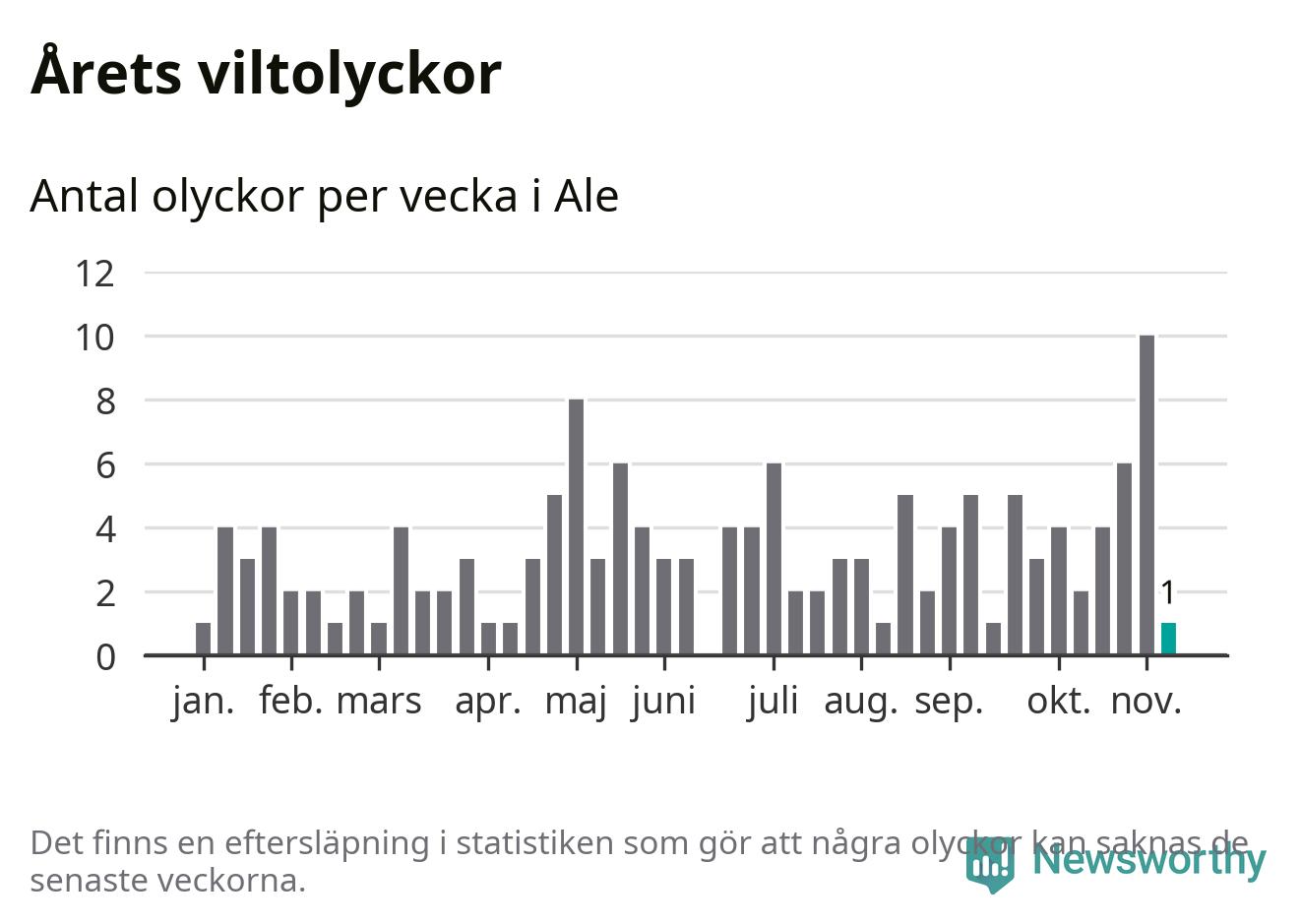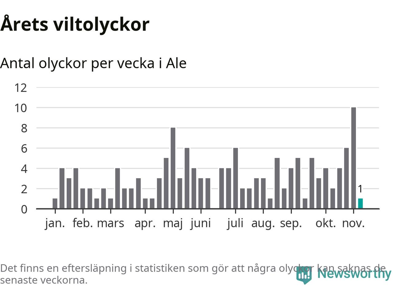 Från förra veckan (vecka 46) har hittills en viltolycka rapporterats in i Ale kommun.