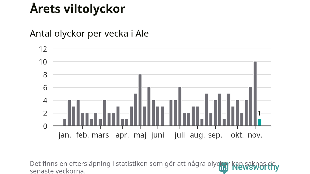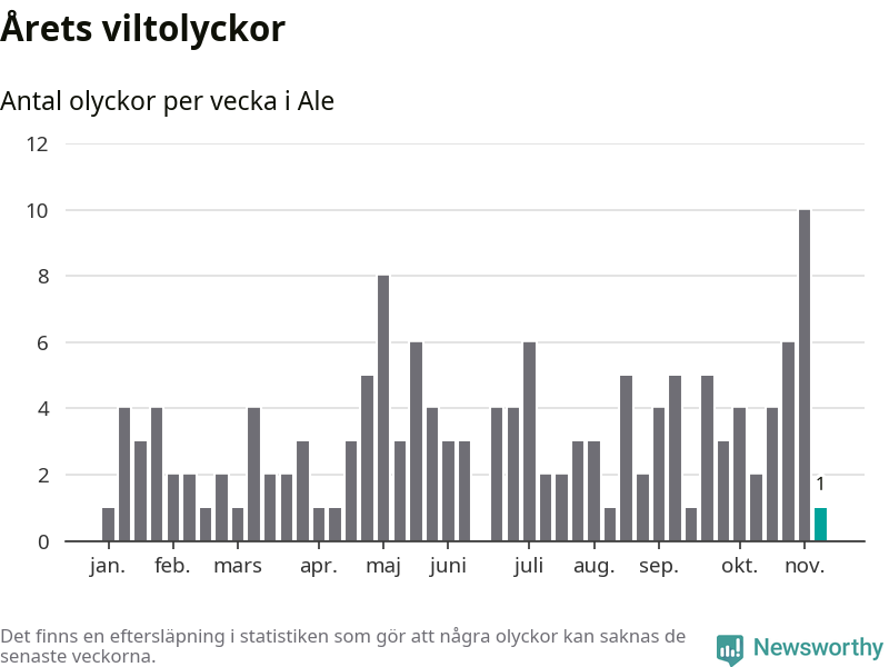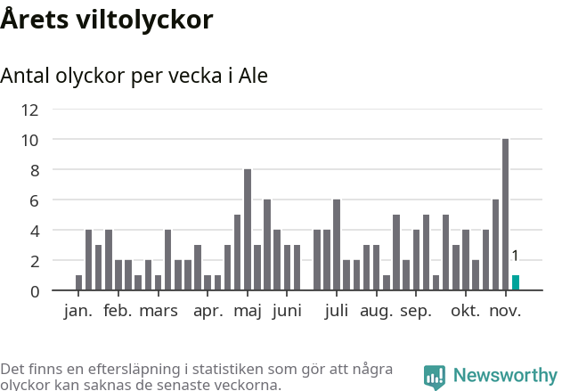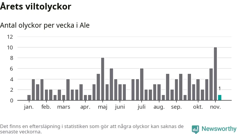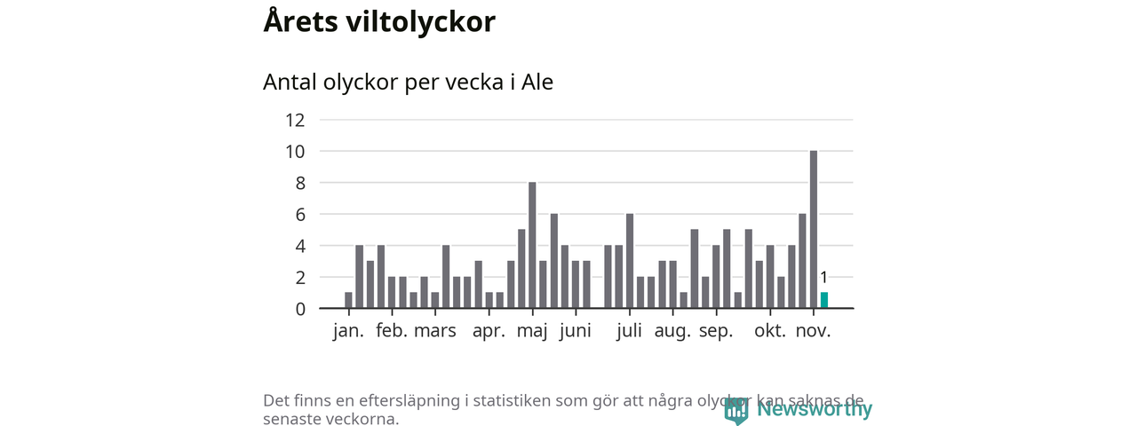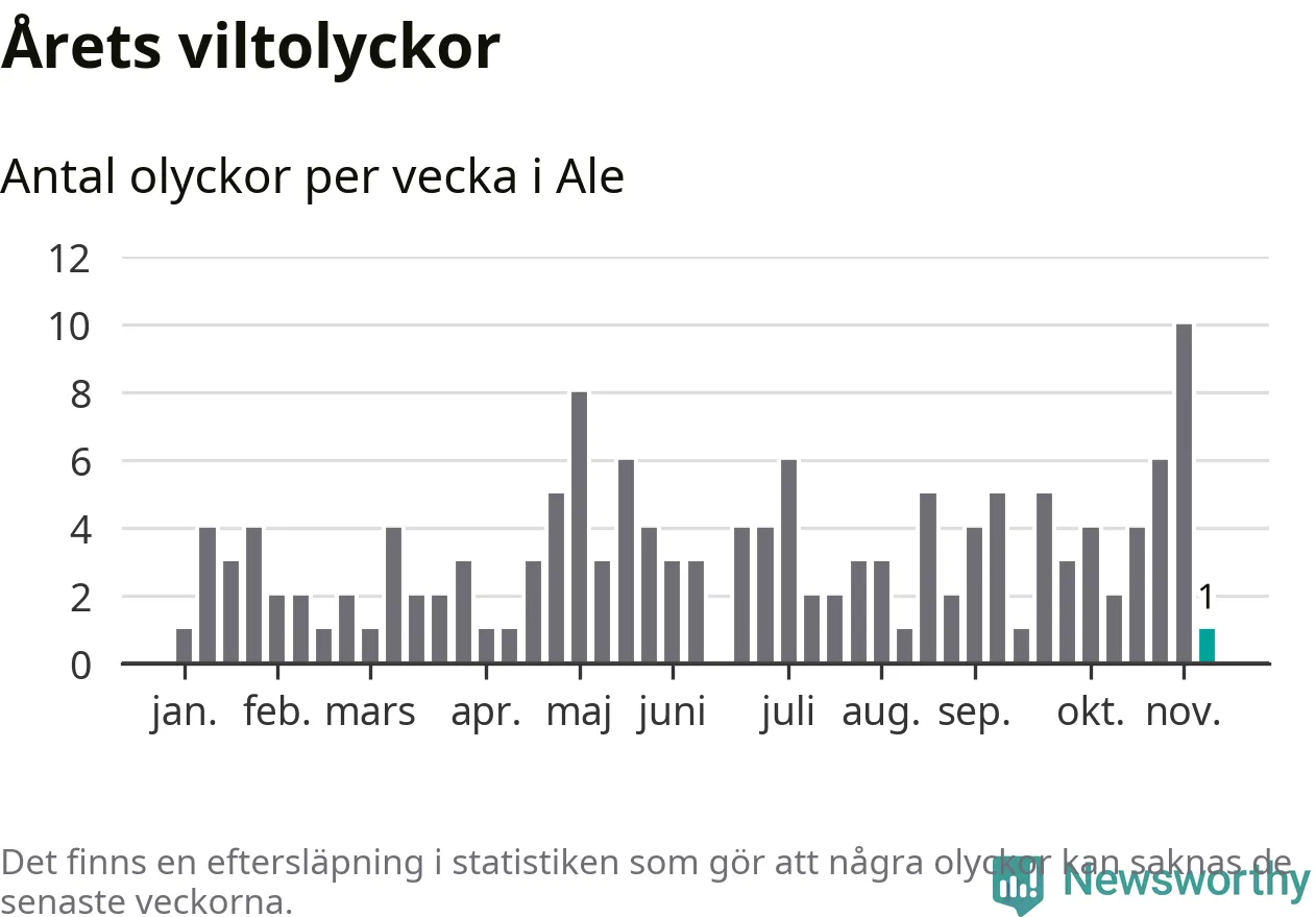 Från förra veckan (vecka 46) har hittills en viltolycka rapporterats in i Ale kommun.