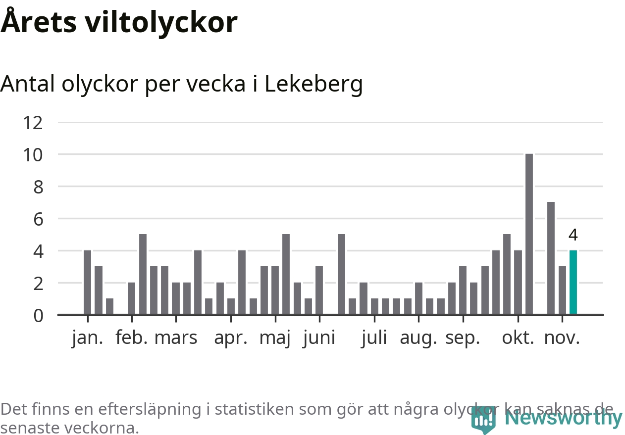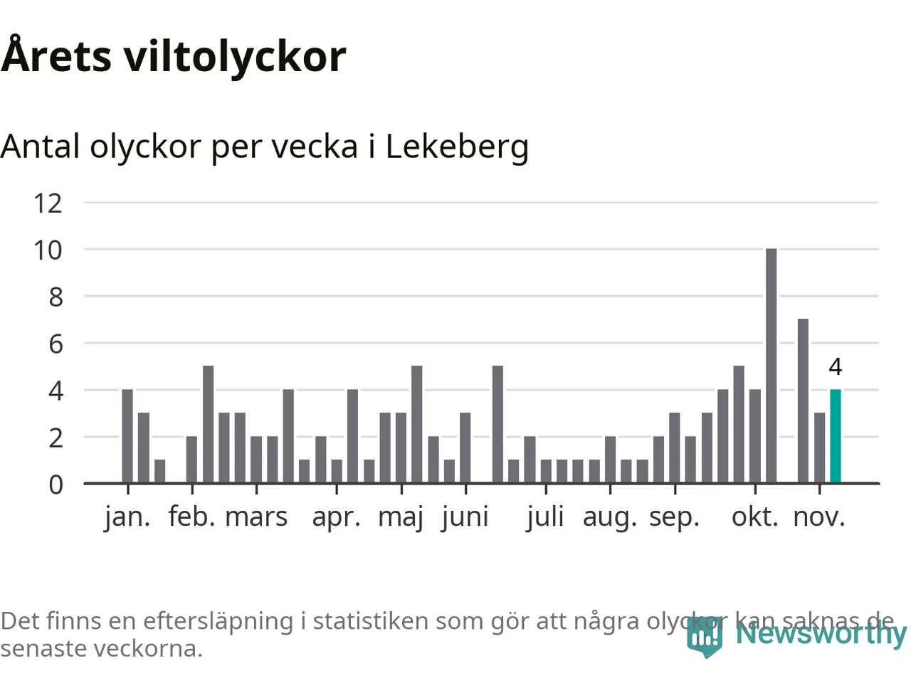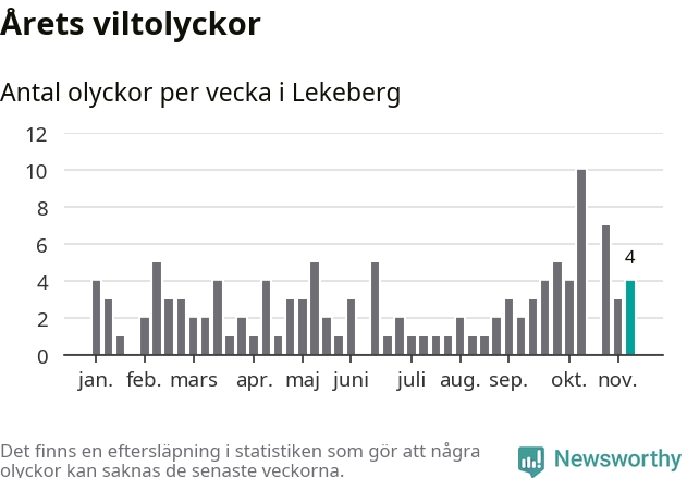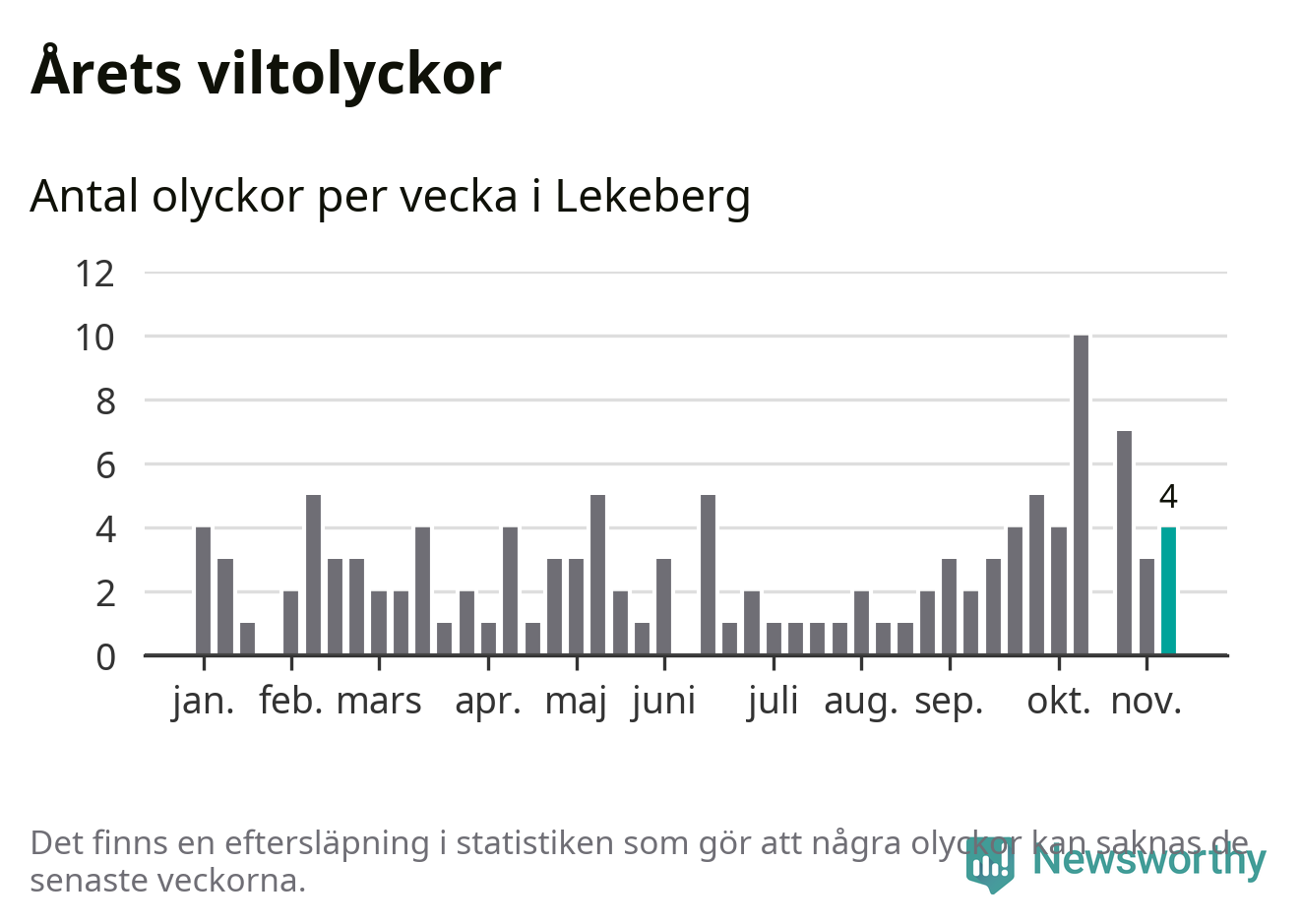 Hittills har fyra viltolyckor rapporterats in i Lekebergs kommun från vecka 46. Se listan här.