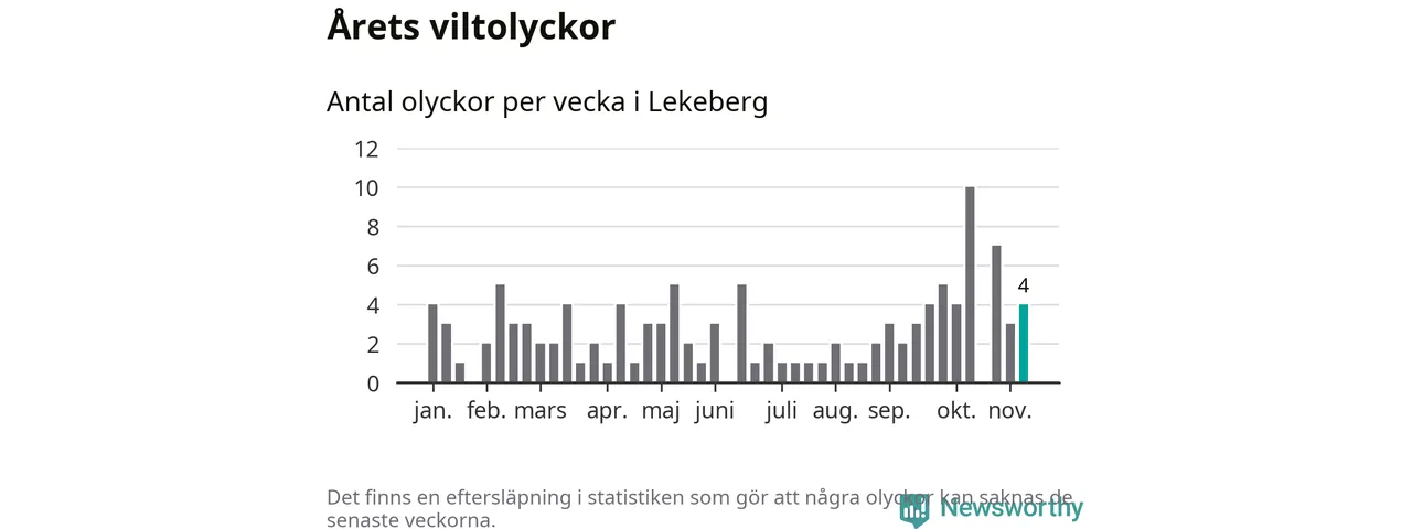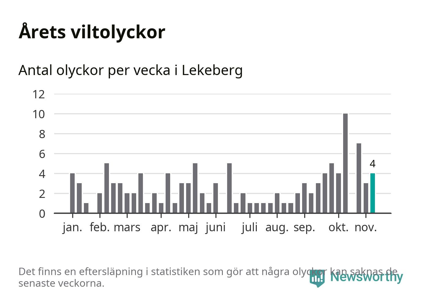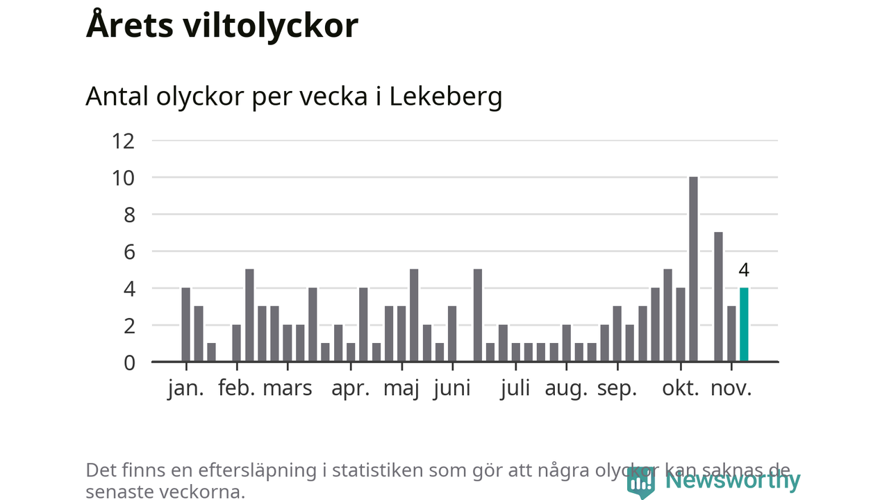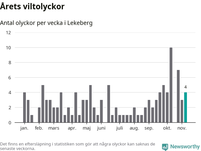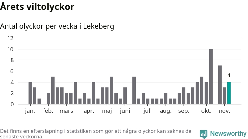 Hittills har fyra viltolyckor rapporterats in i Lekebergs kommun från vecka 46. Se listan här.