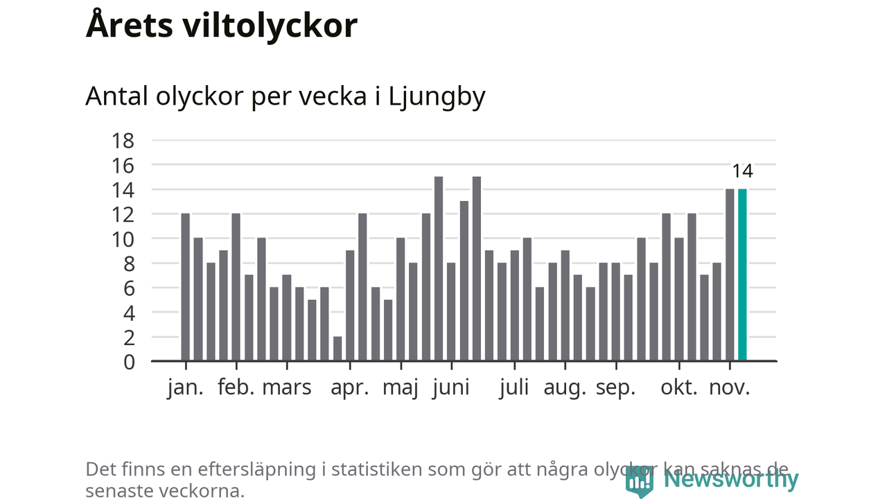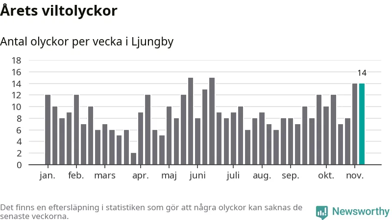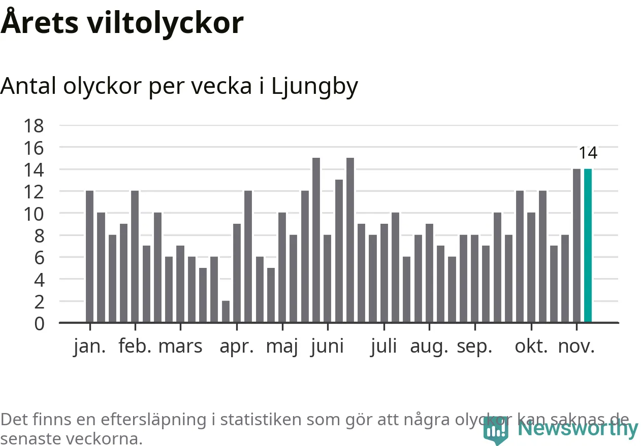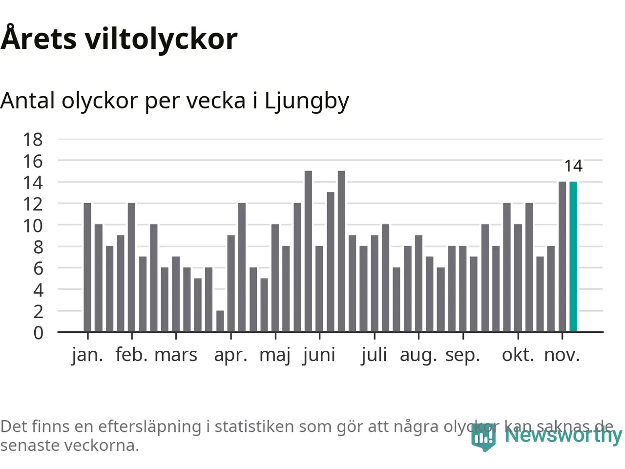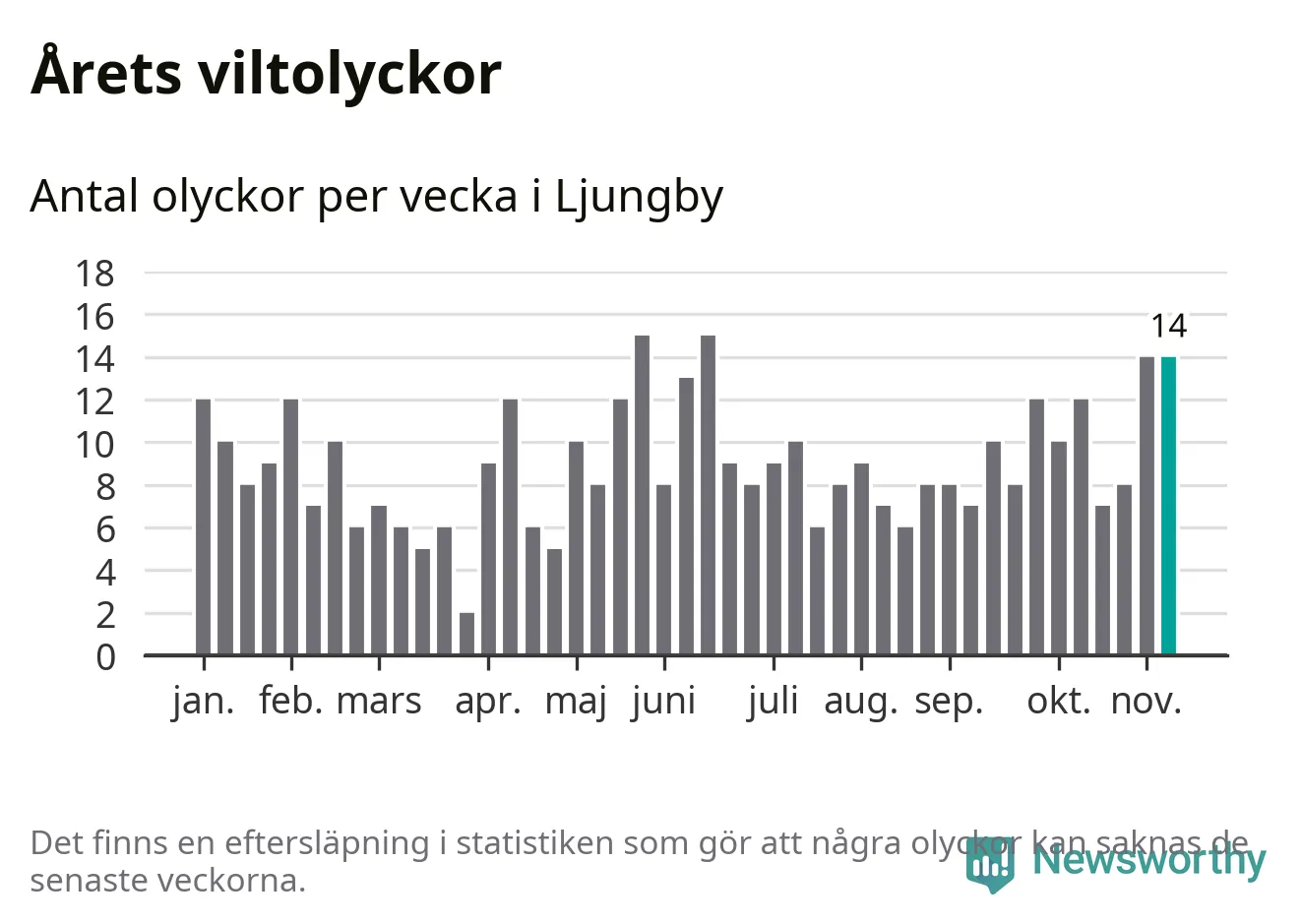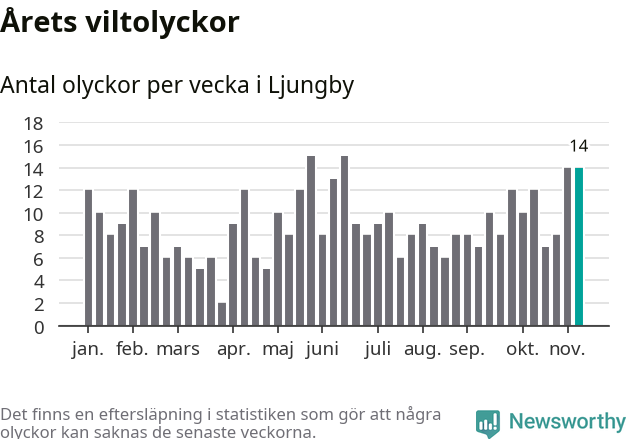 Hittills har 14 viltolyckor rapporterats in i Ljungby kommun från vecka 46. Se listan här.