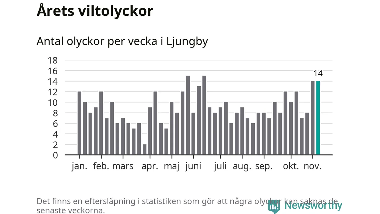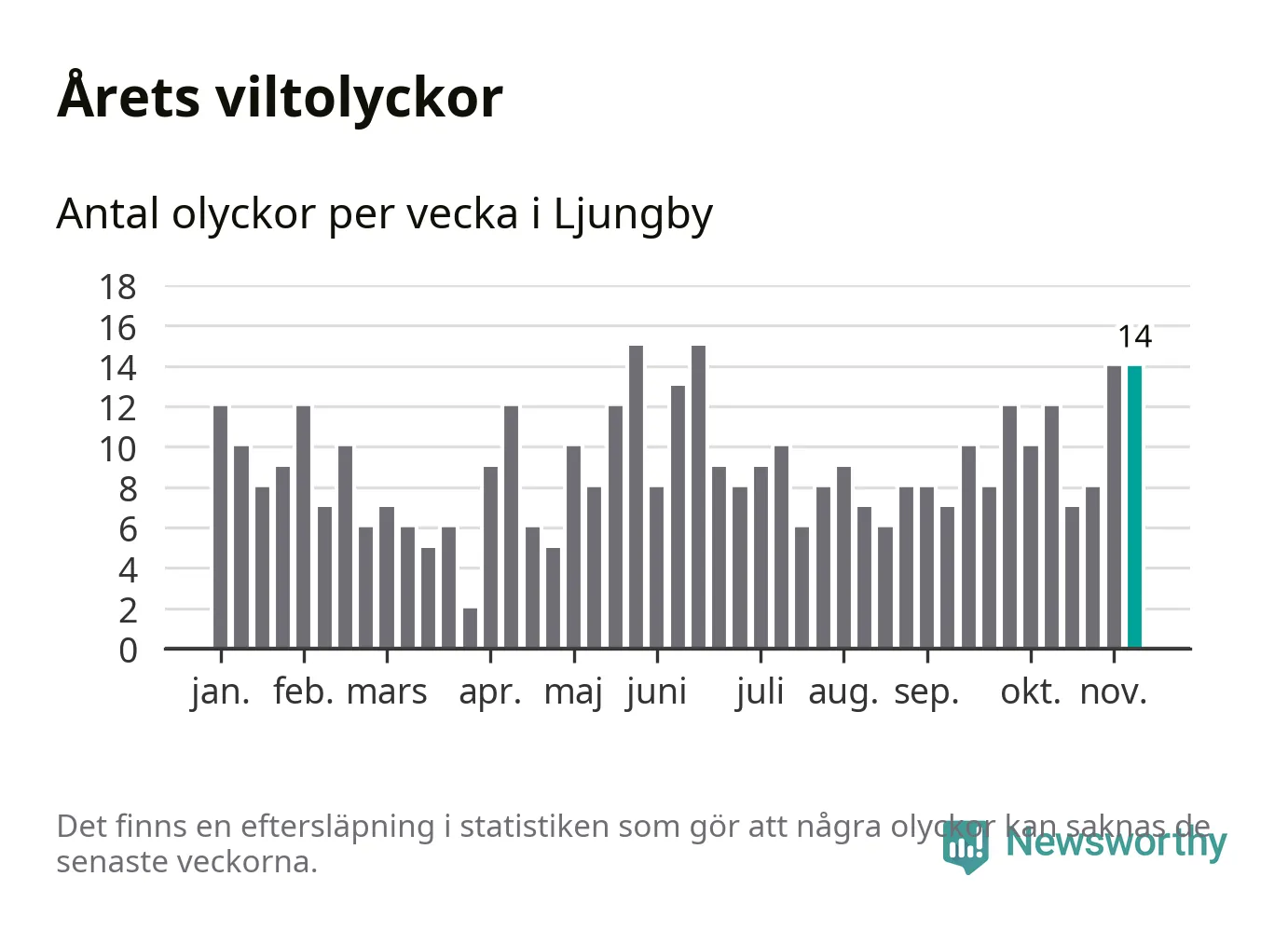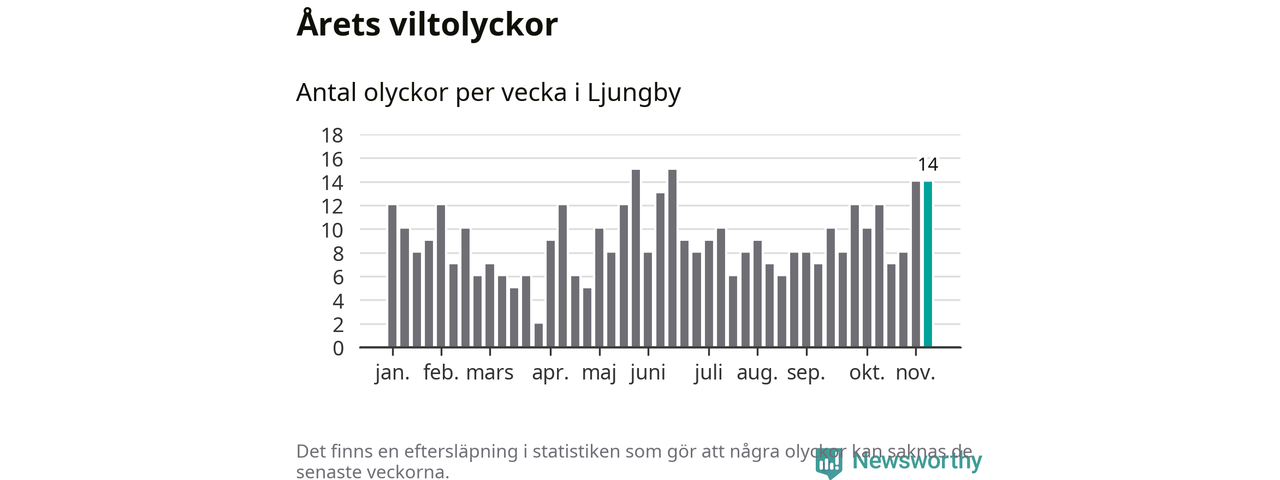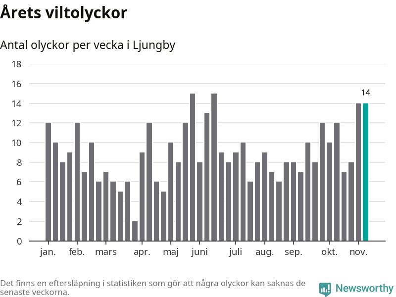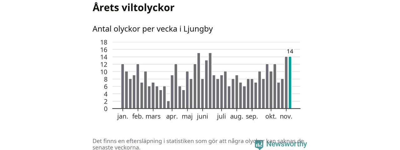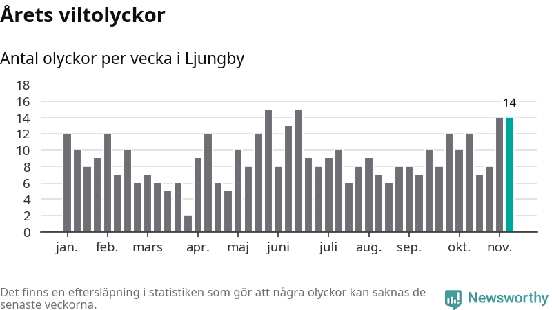 Hittills har 14 viltolyckor rapporterats in i Ljungby kommun från vecka 46. Se listan här.