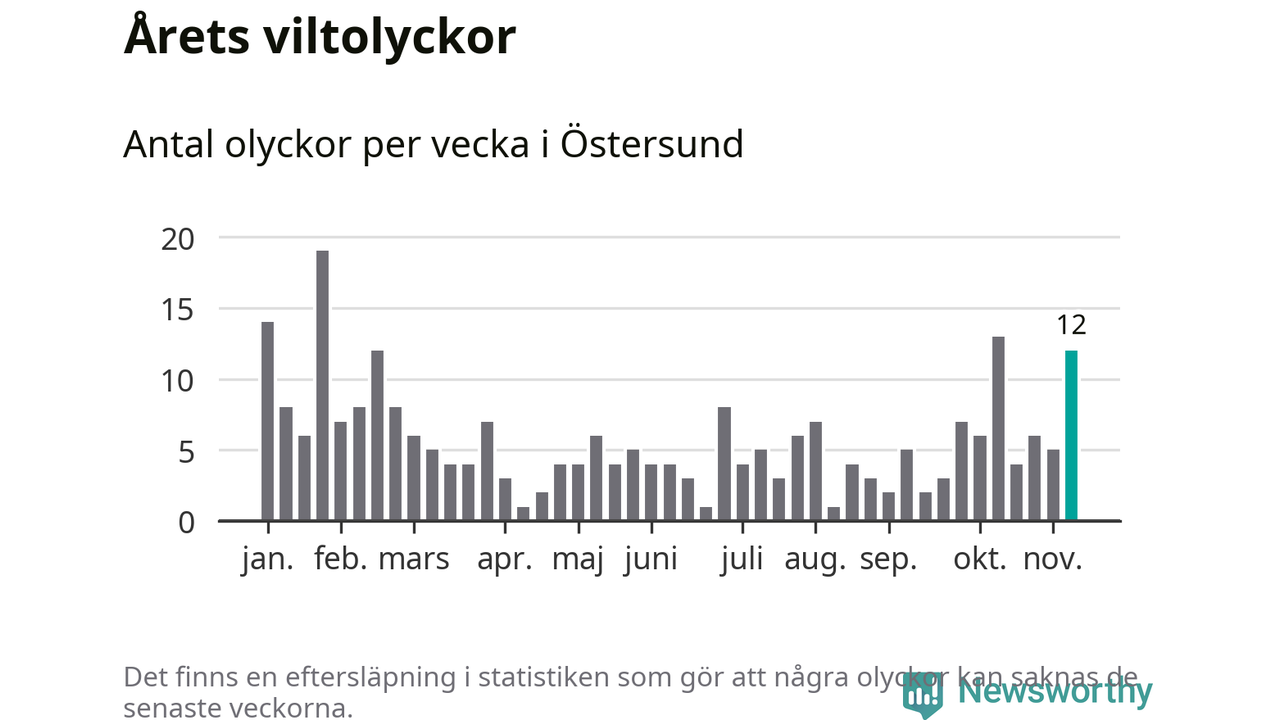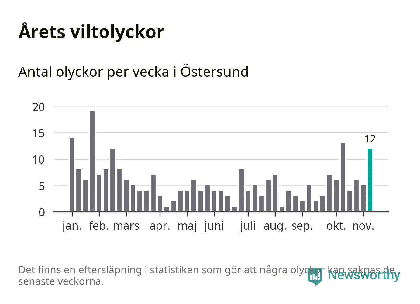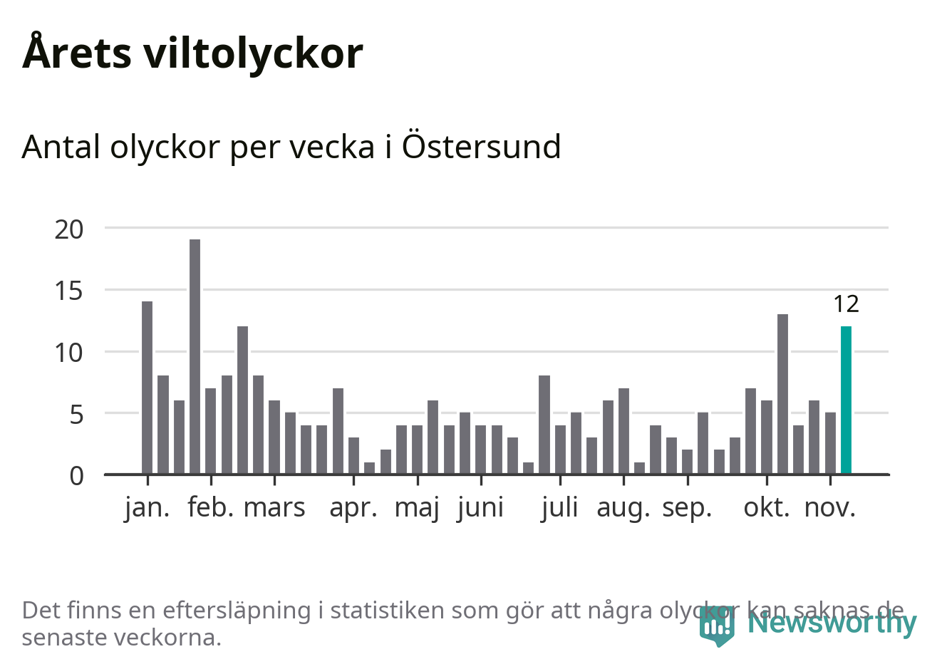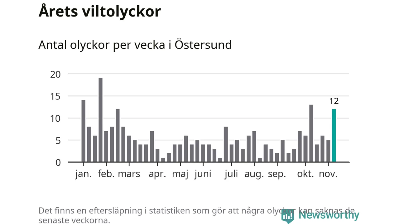 264 viltolyckor i kommunen. Det är mindre än genomsnittet för motsvarande period (omkring 310) de senaste tio åren.