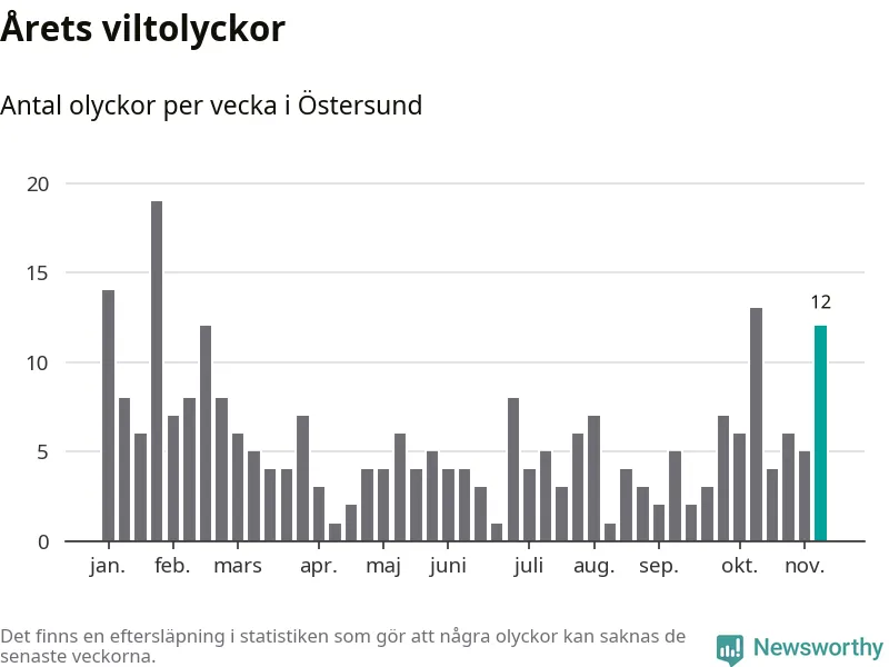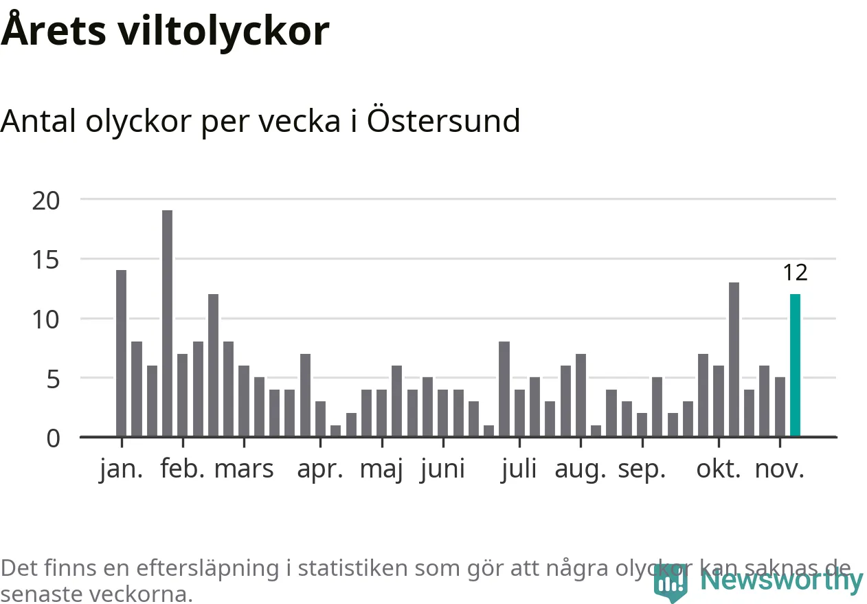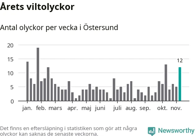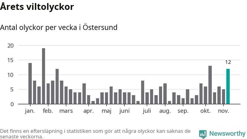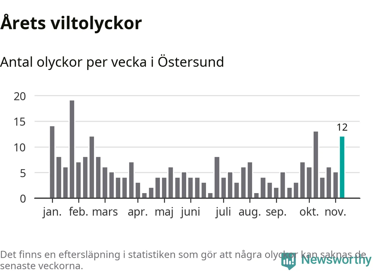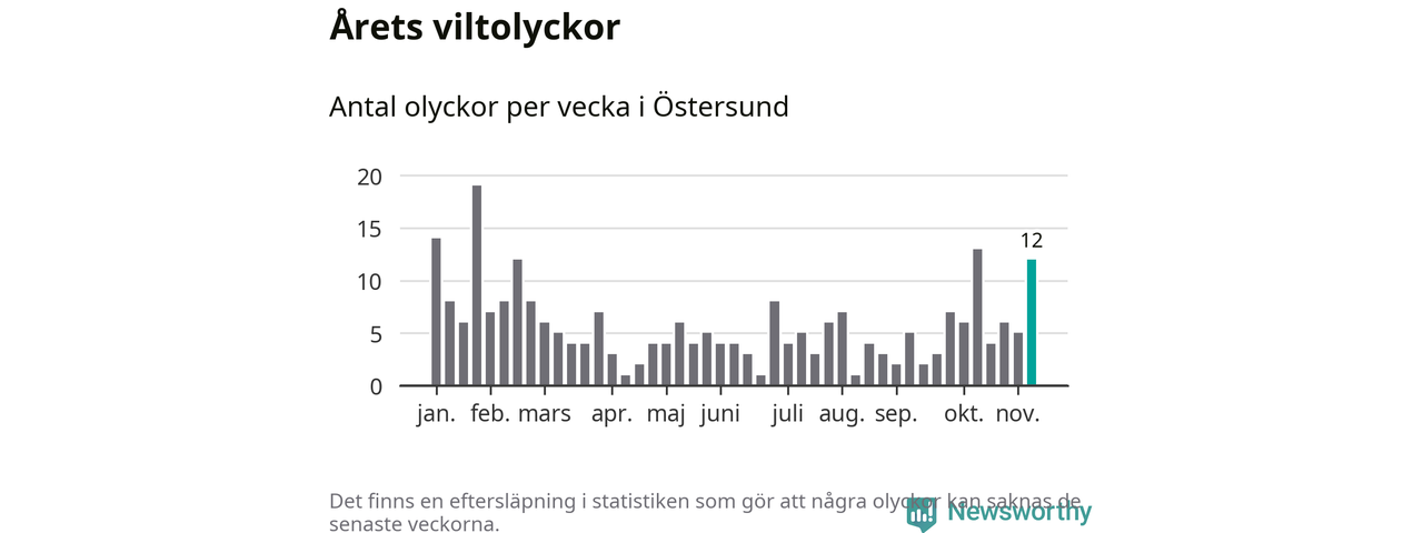 264 viltolyckor i kommunen. Det är mindre än genomsnittet för motsvarande period (omkring 310) de senaste tio åren.
