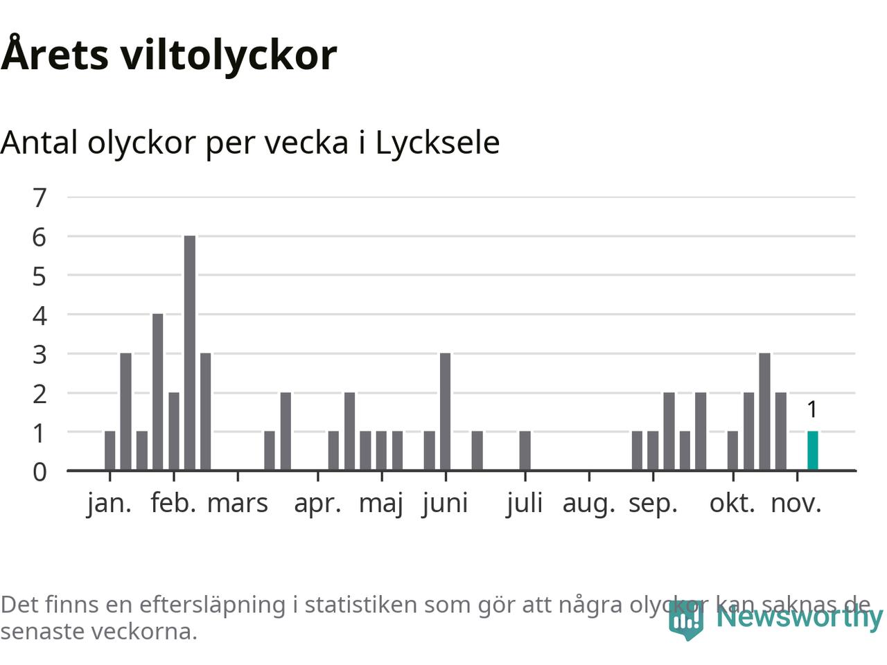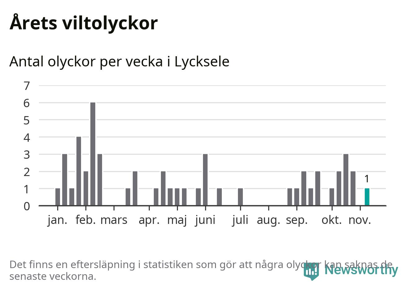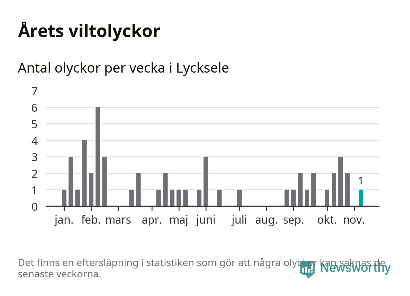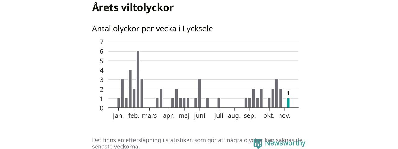 Från förra veckan (vecka 46) har hittills en viltolycka rapporterats in i Lycksele kommun.