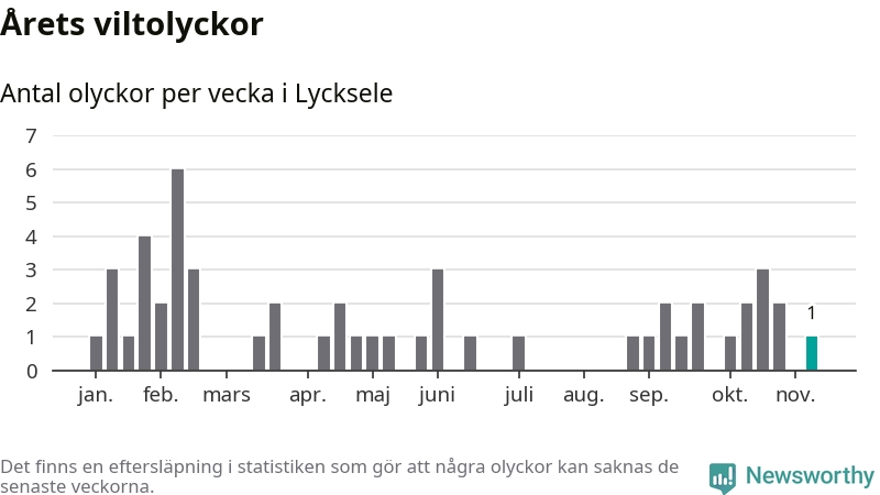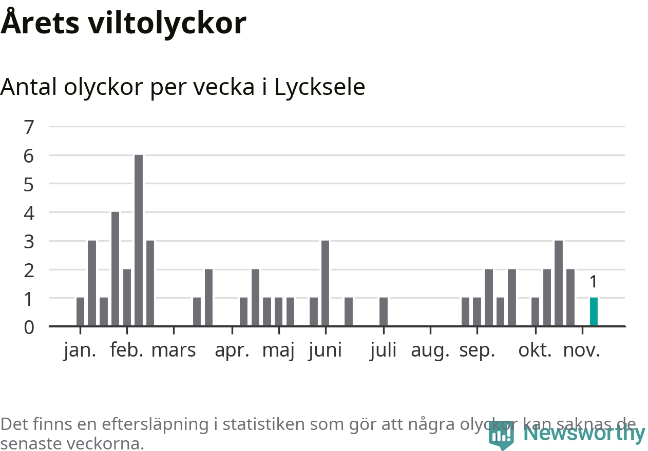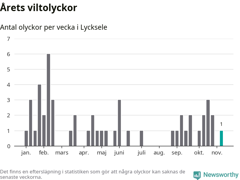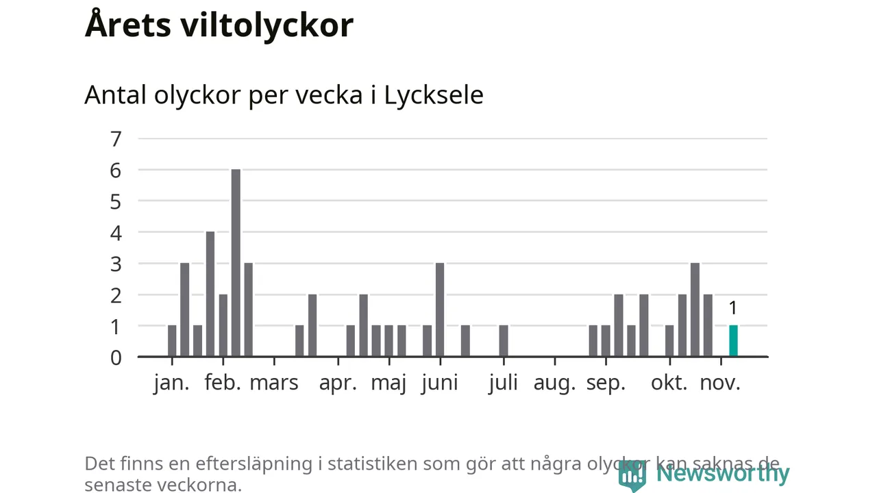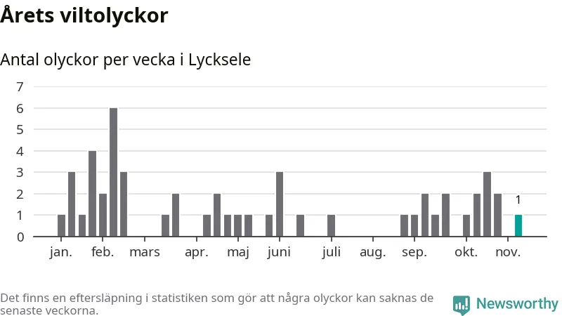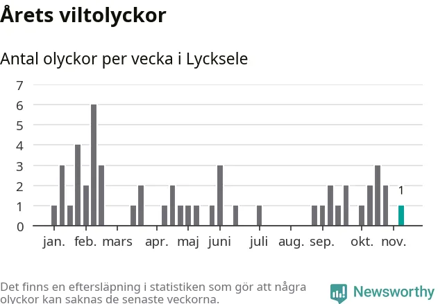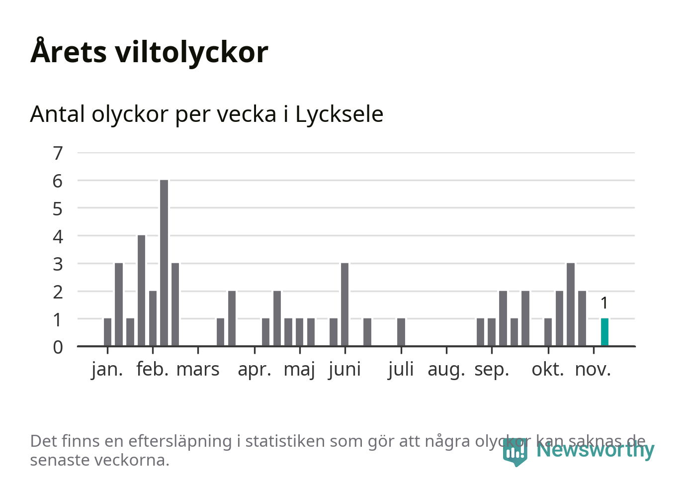 Från förra veckan (vecka 46) har hittills en viltolycka rapporterats in i Lycksele kommun.