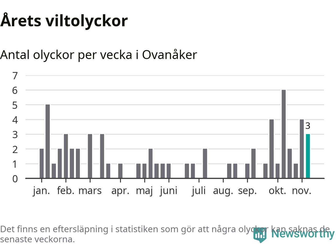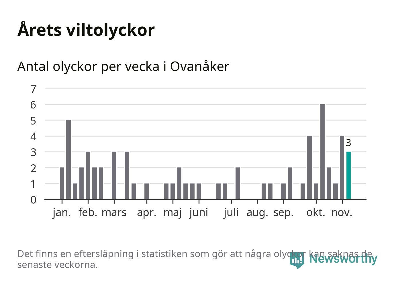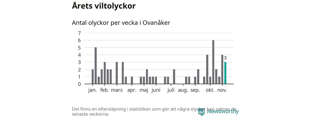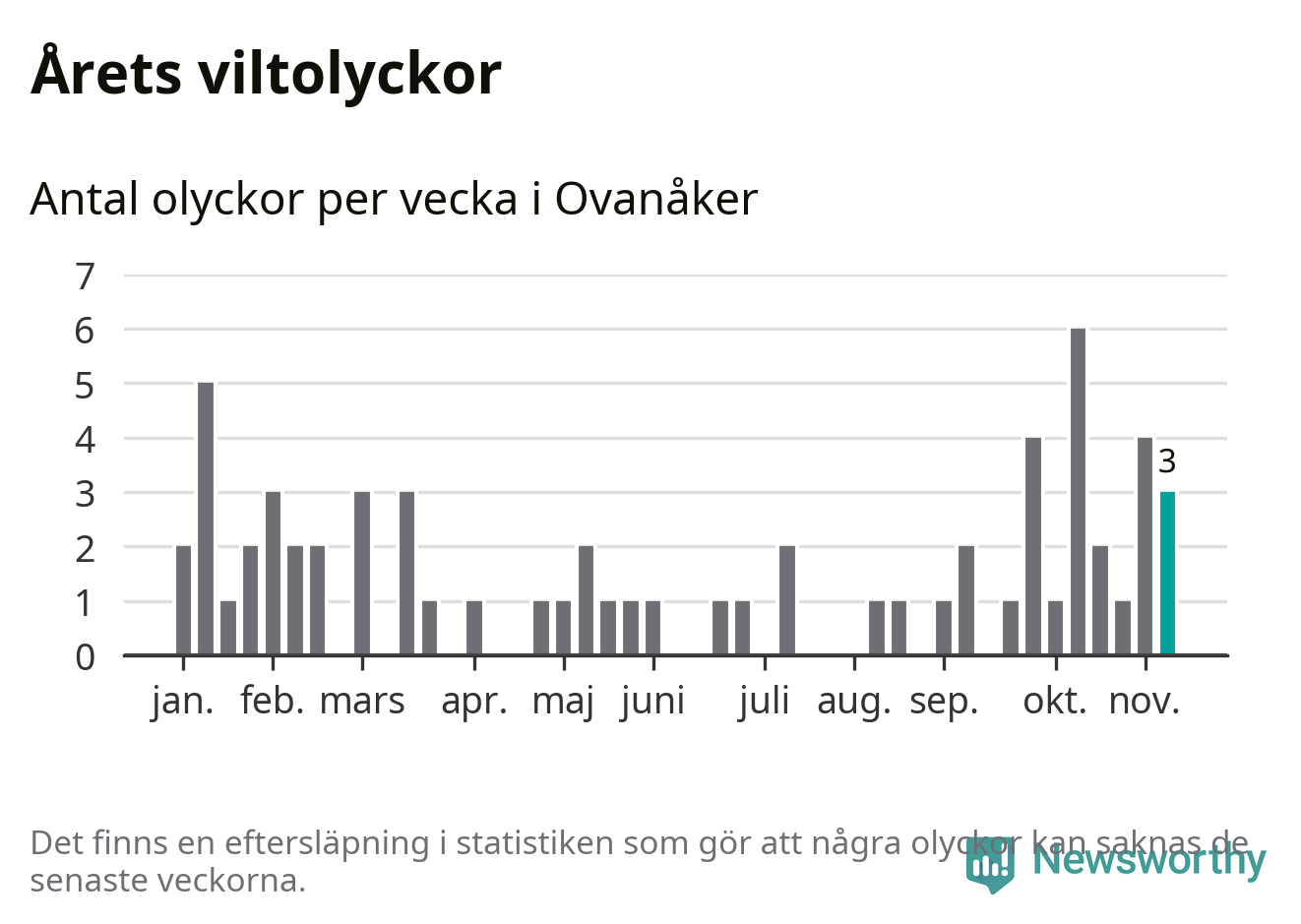 Hittills har tre viltolyckor rapporterats in i Ovanåkers kommun från vecka 46. Se listan här.