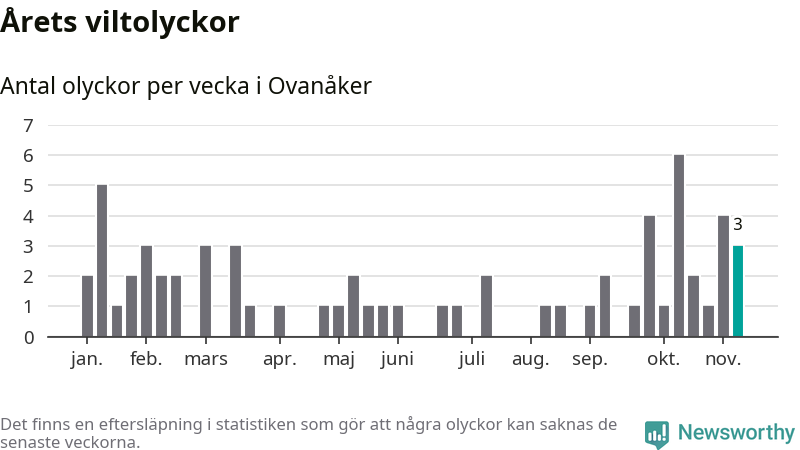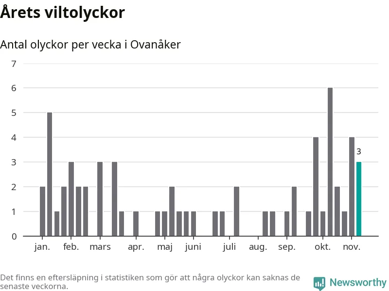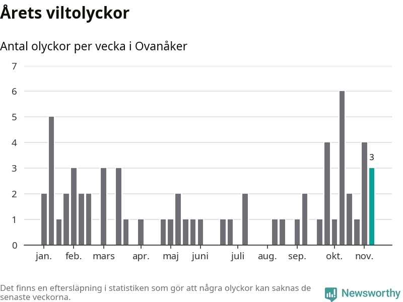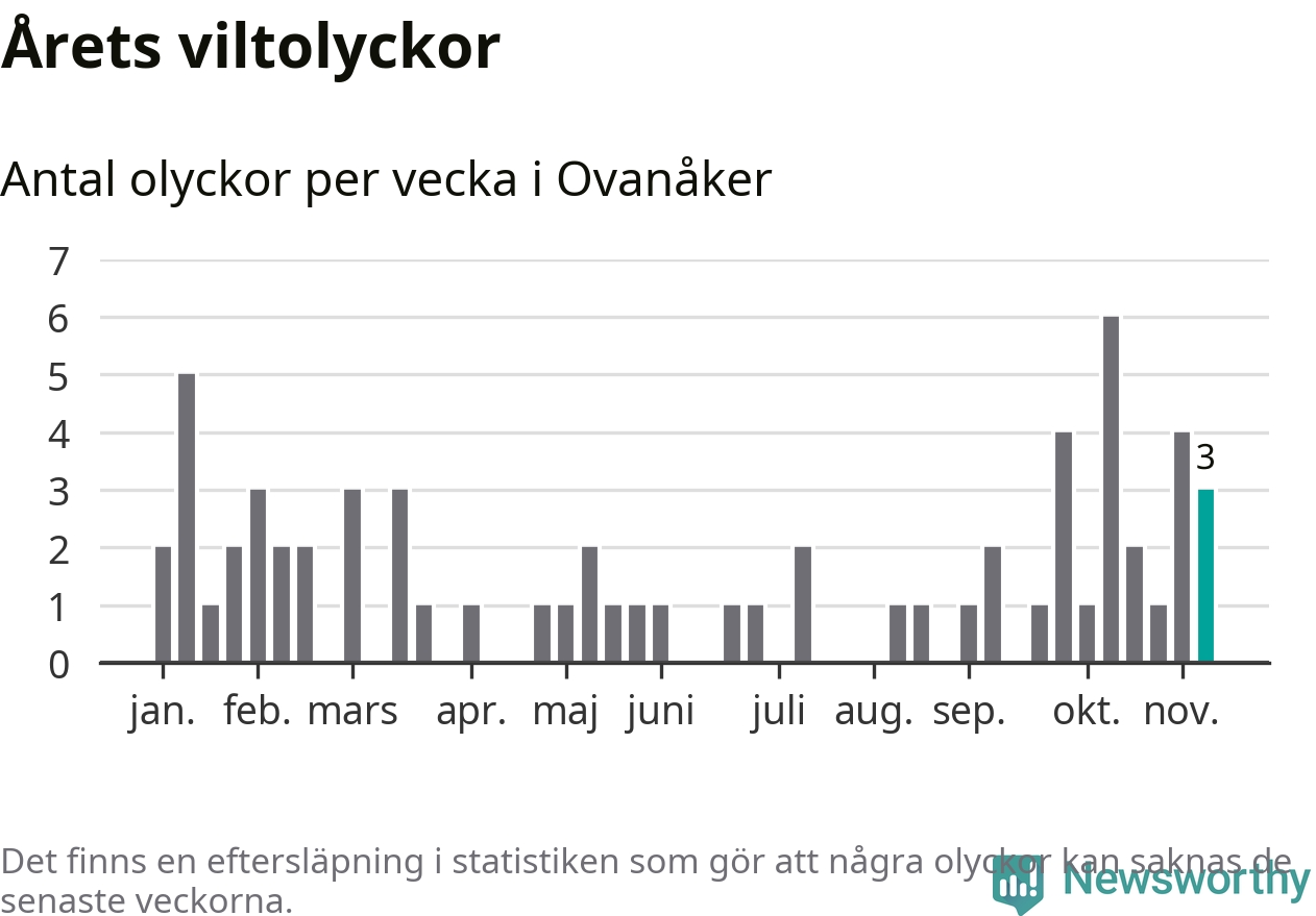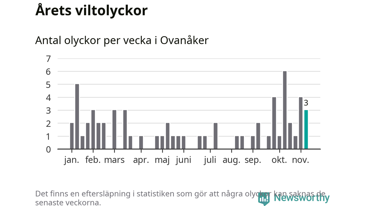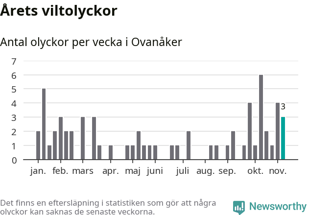Hittills har tre viltolyckor rapporterats in i Ovanåkers kommun från vecka 46. Se listan här.