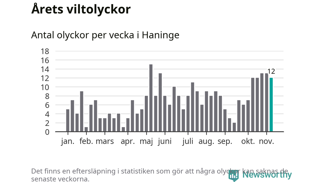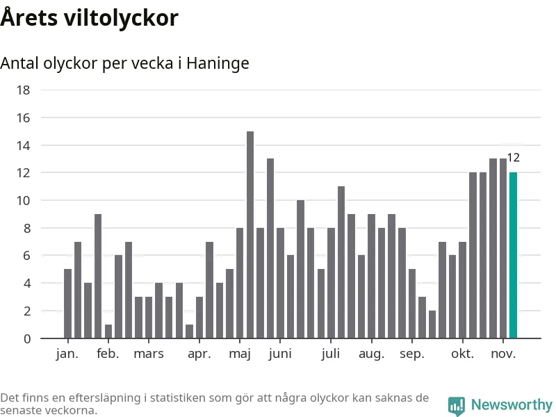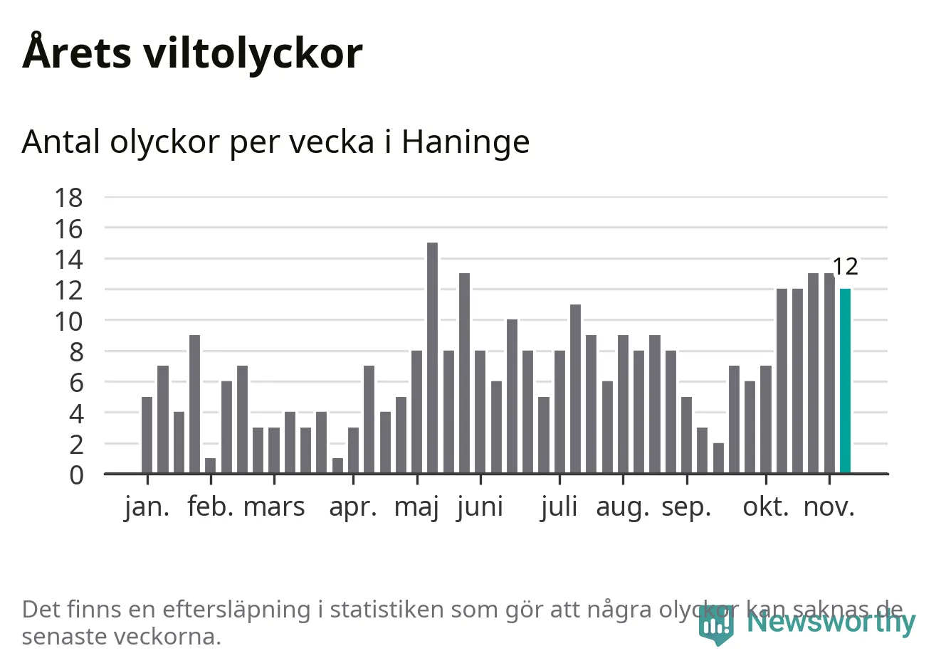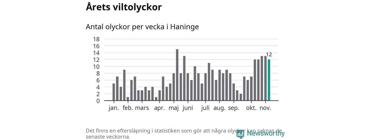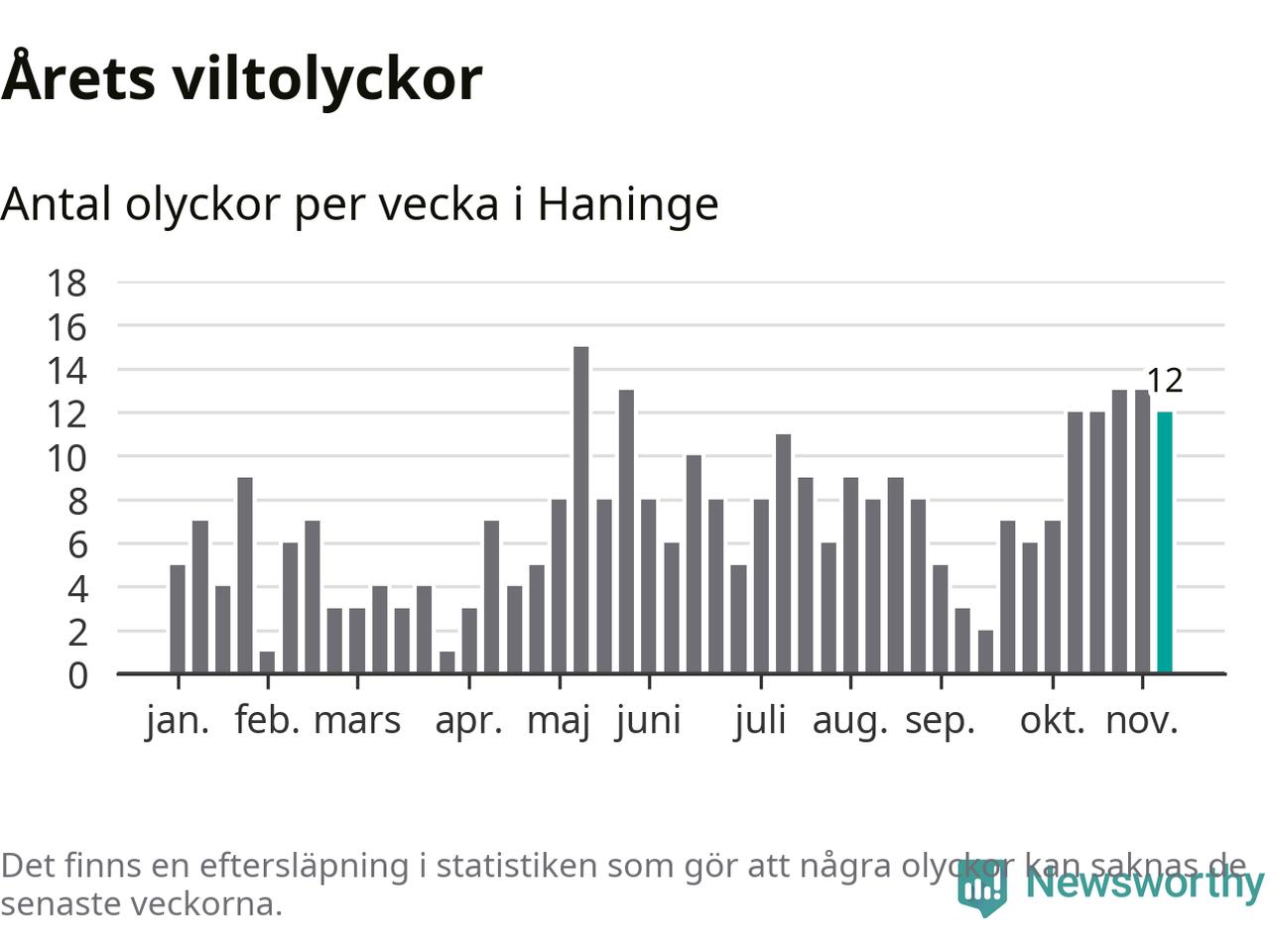 Hittills har tolv viltolyckor rapporterats in i Haninge kommun från vecka 46. Se listan här.