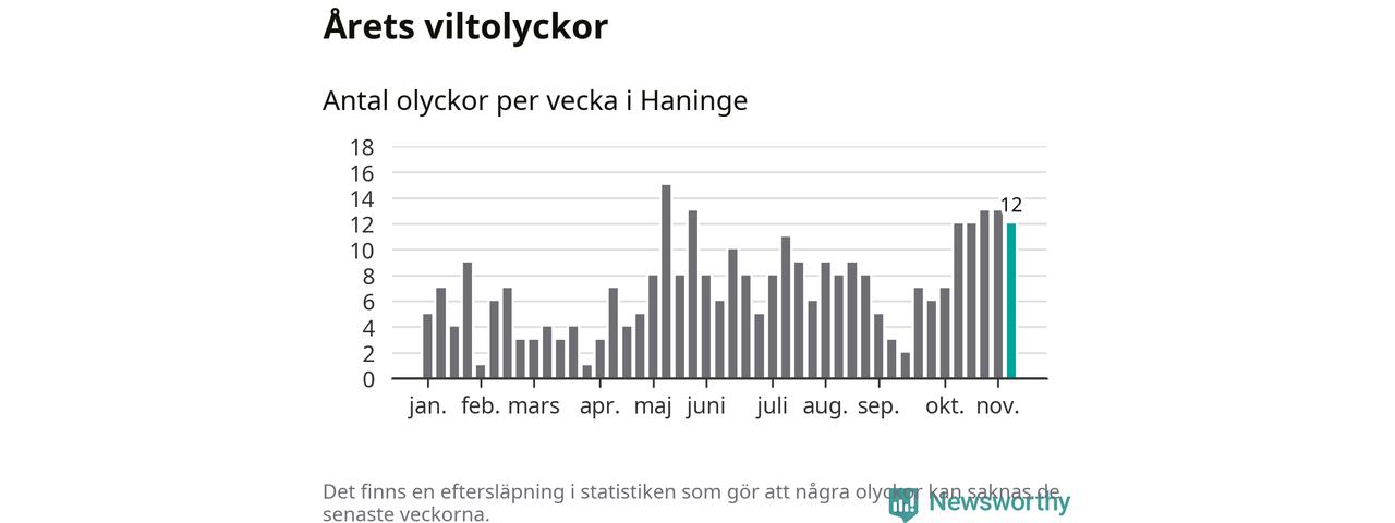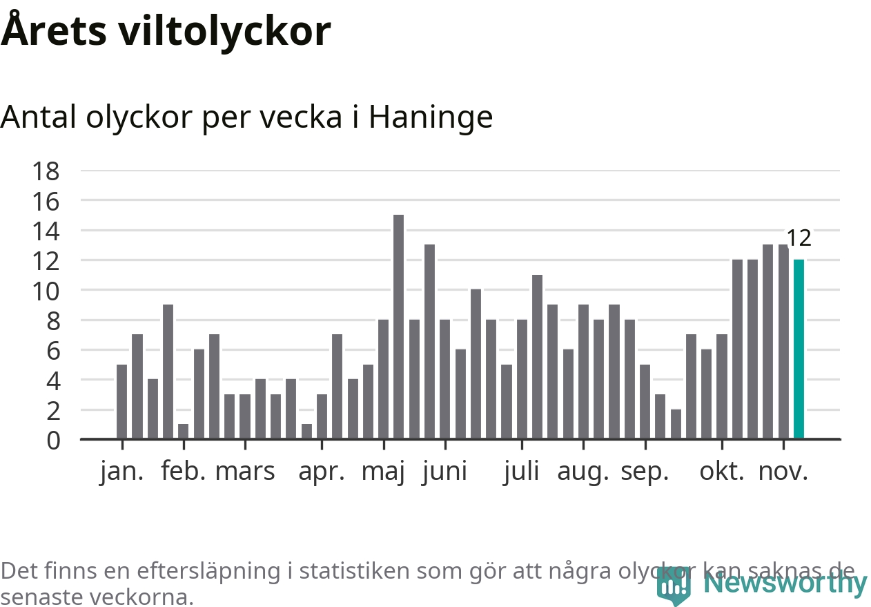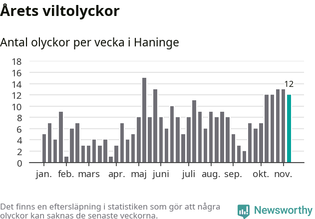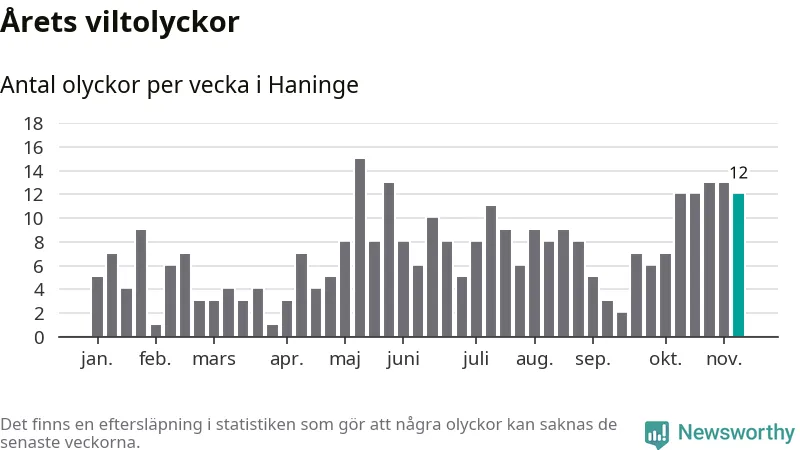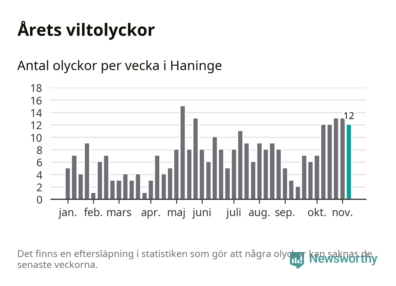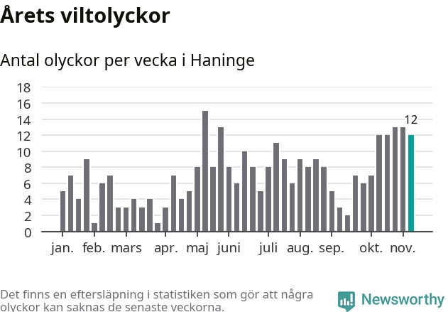 Hittills har tolv viltolyckor rapporterats in i Haninge kommun från vecka 46. Se listan här.