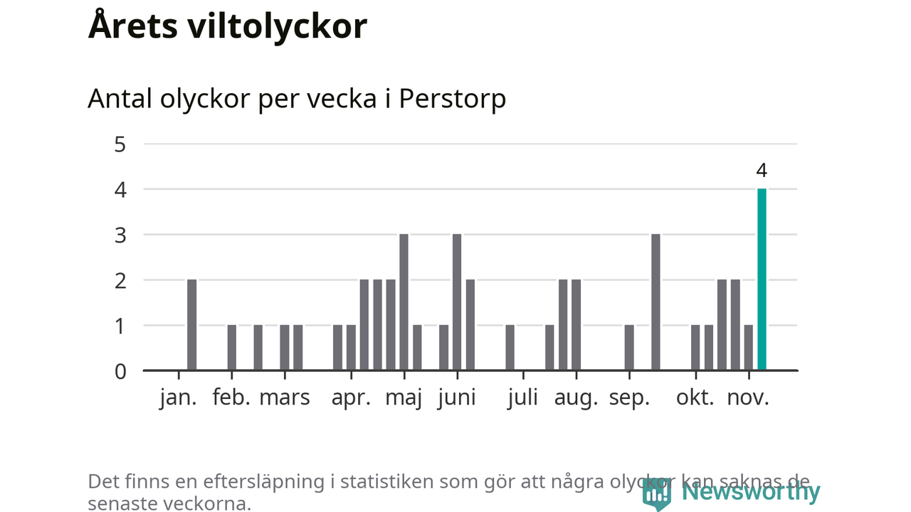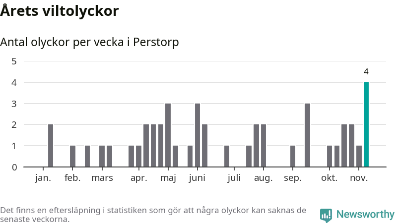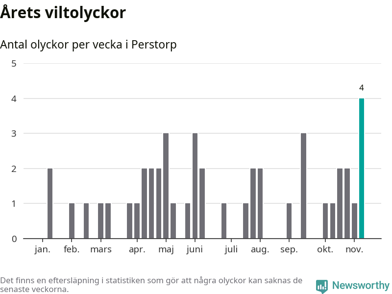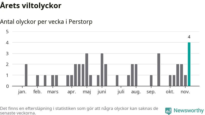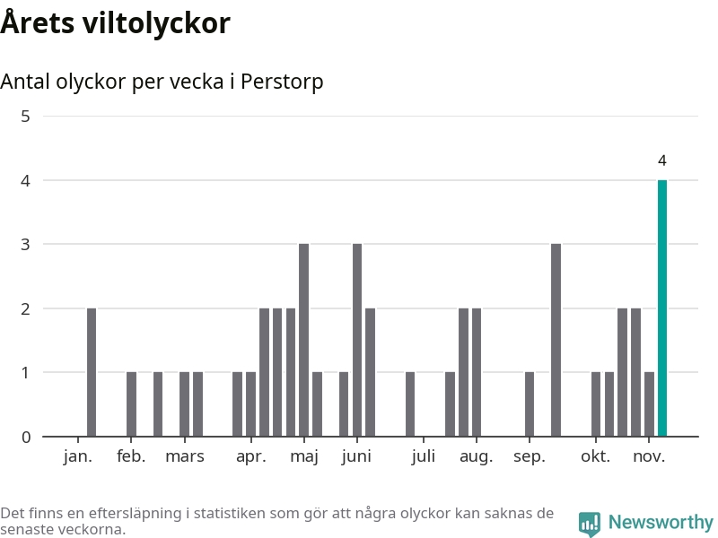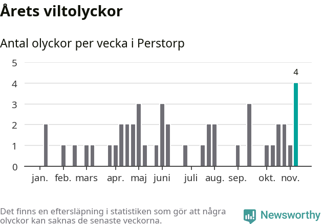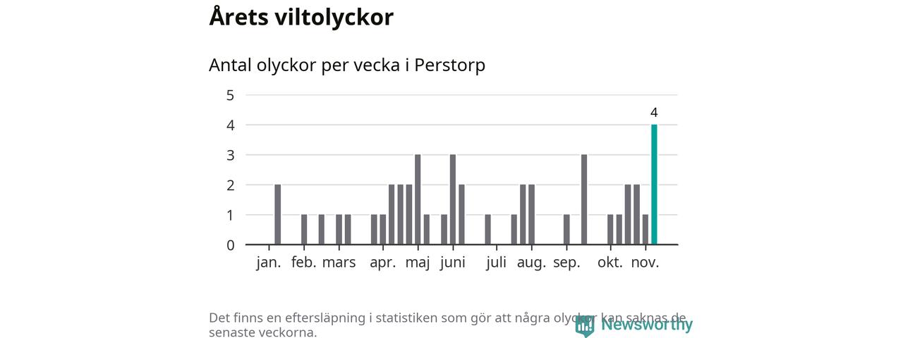 Hittills har fyra viltolyckor rapporterats in i Perstorps kommun från vecka 46. Se listan här.