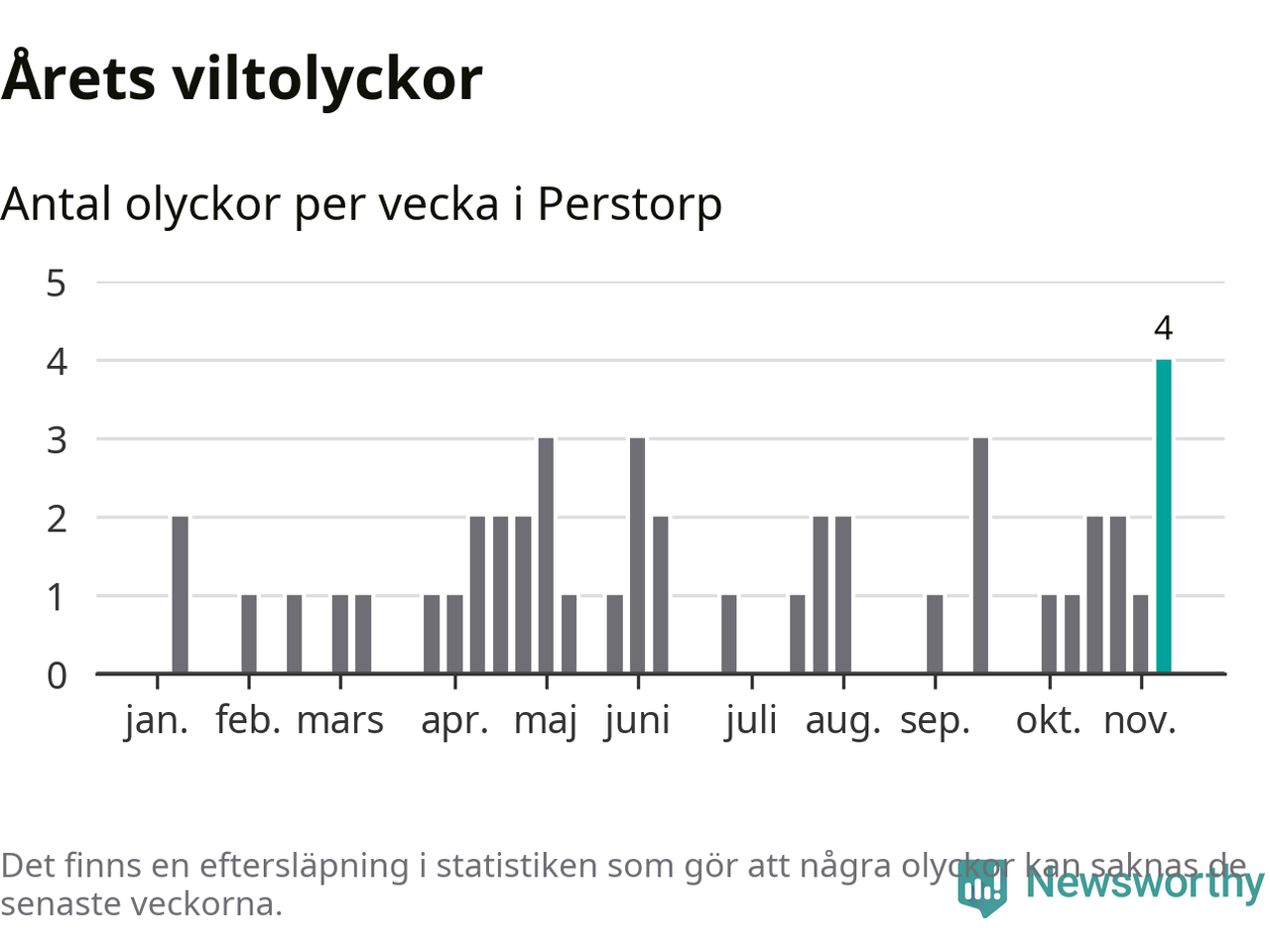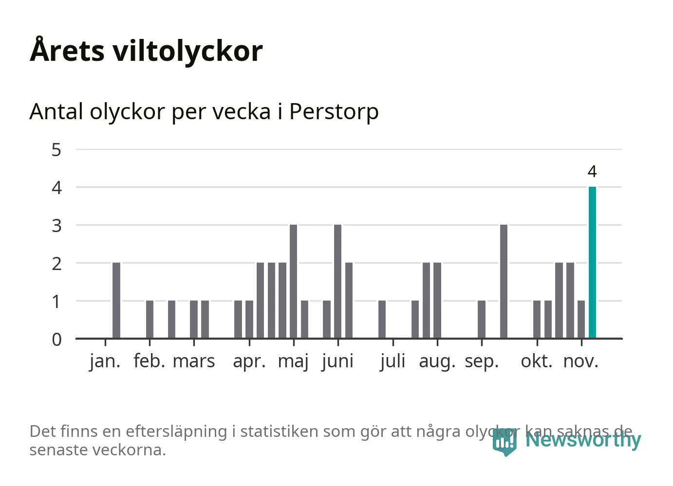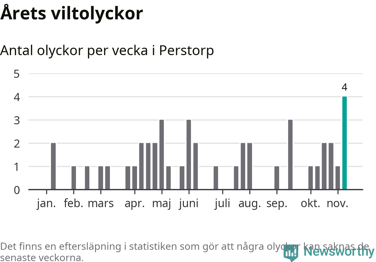 Hittills har fyra viltolyckor rapporterats in i Perstorps kommun från vecka 46. Se listan här.