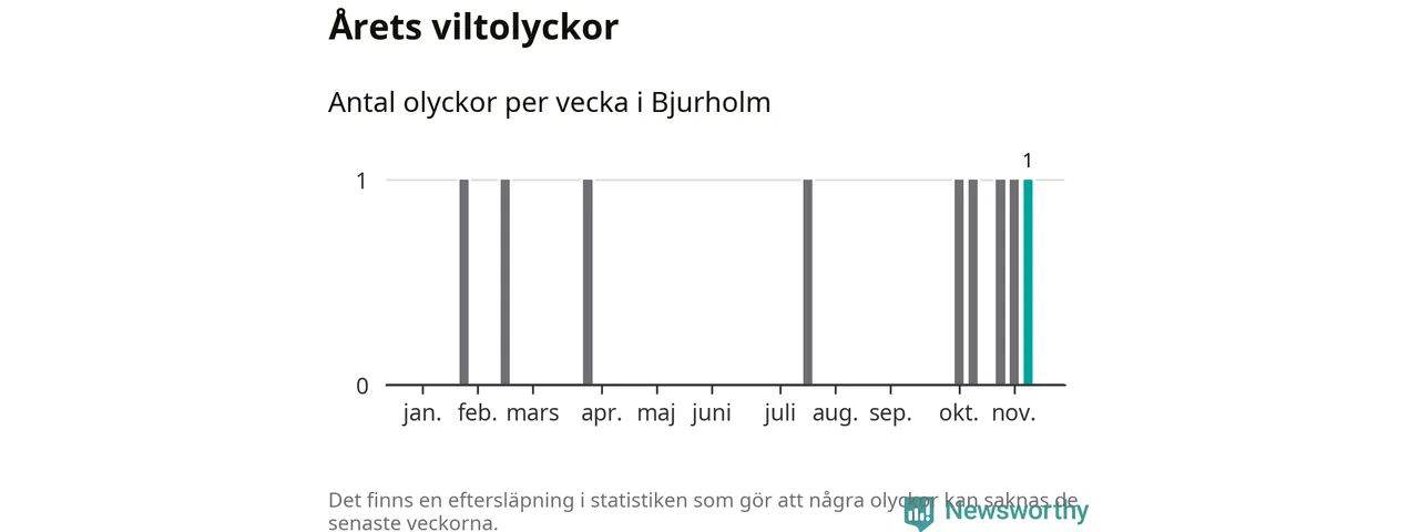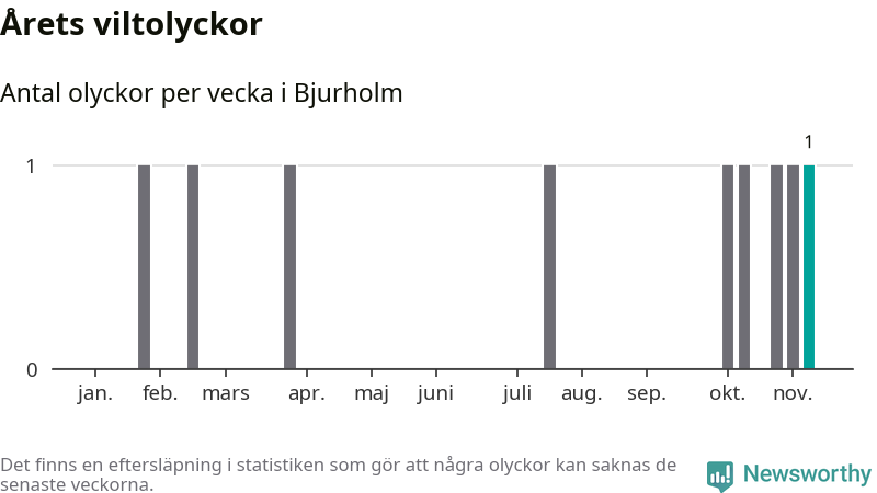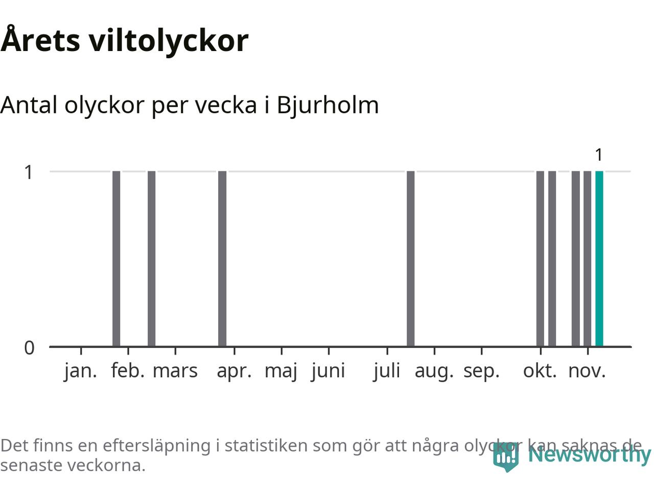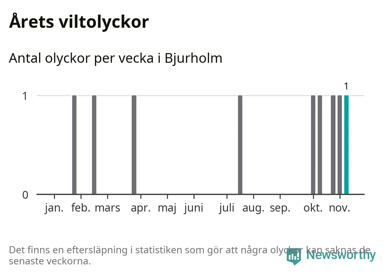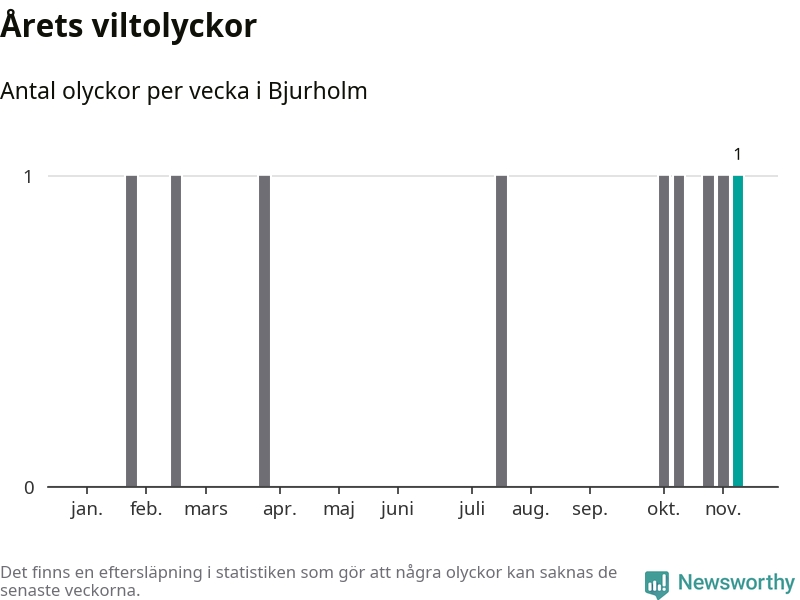 Från förra veckan (vecka 46) har hittills en viltolycka rapporterats in i Bjurholms kommun.