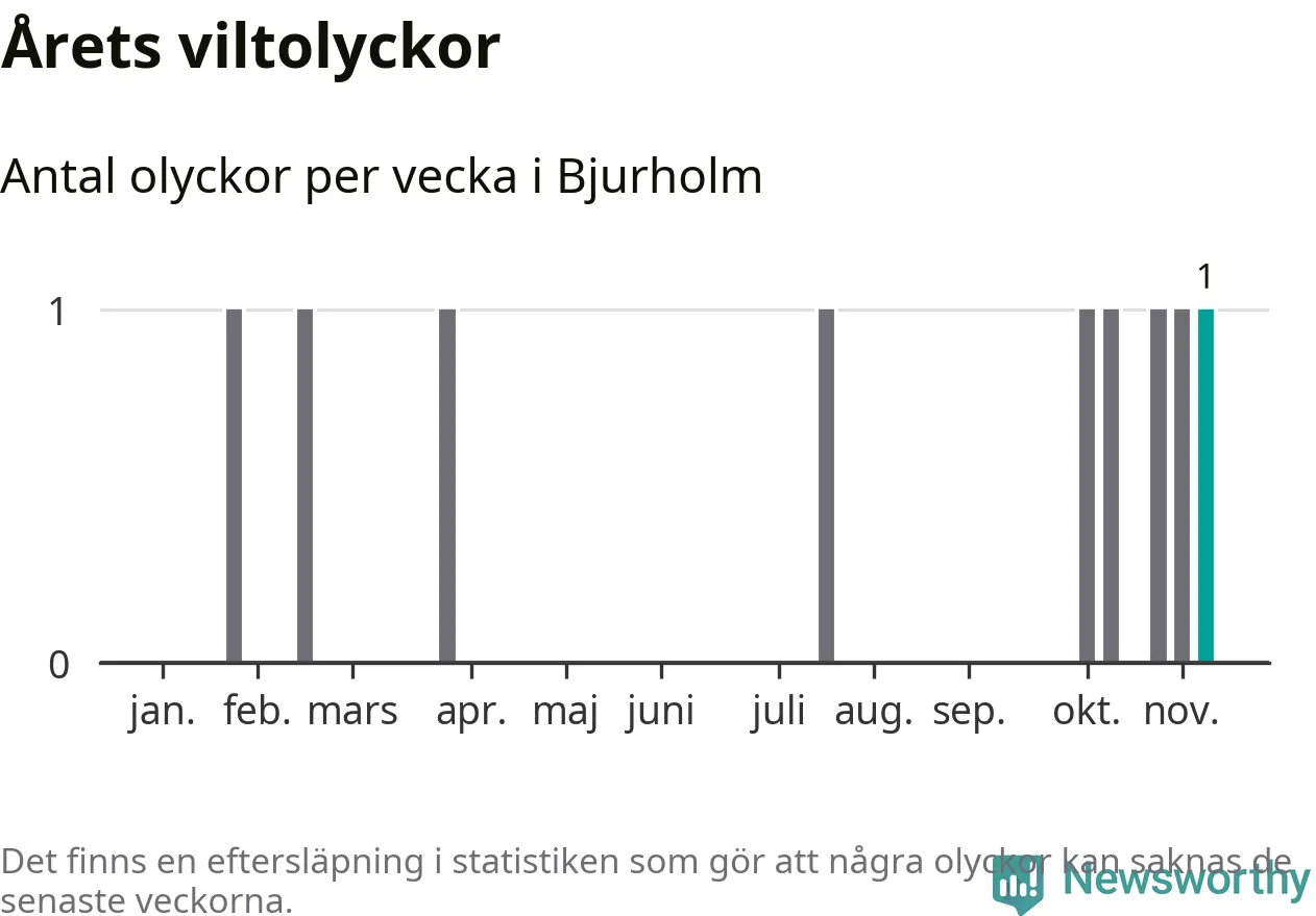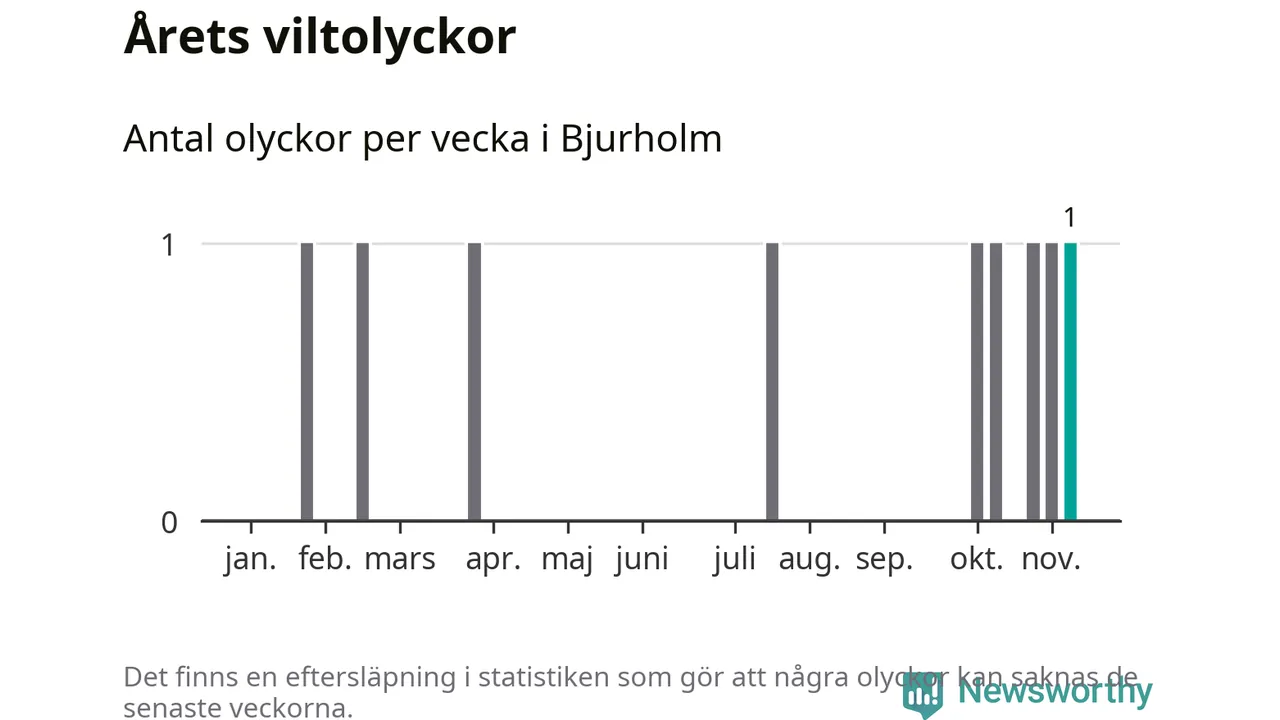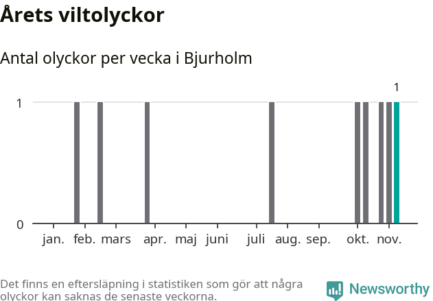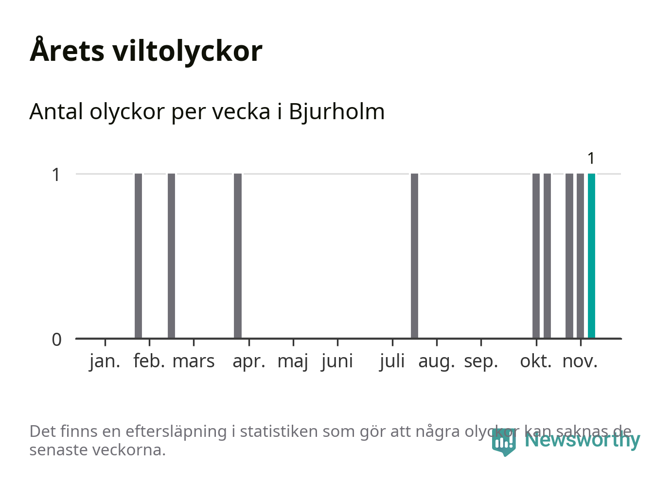 Från förra veckan (vecka 46) har hittills en viltolycka rapporterats in i Bjurholms kommun.