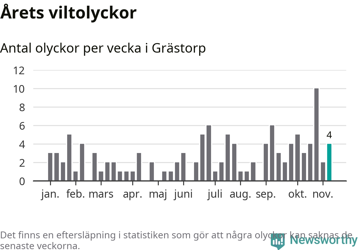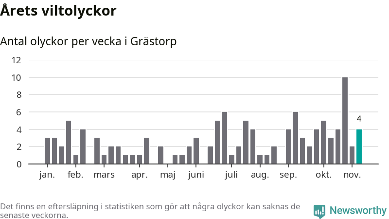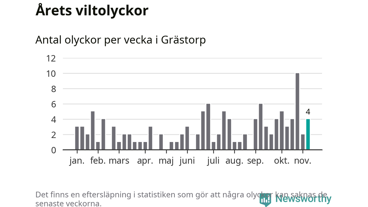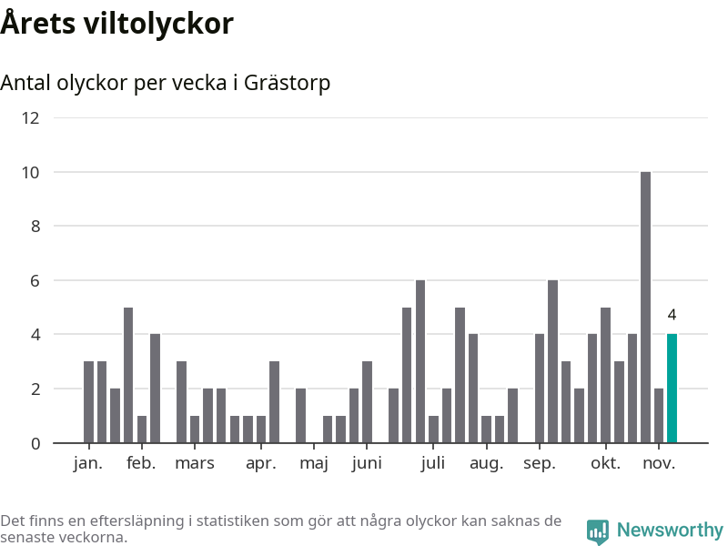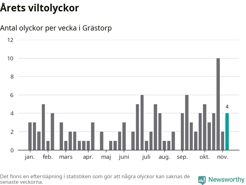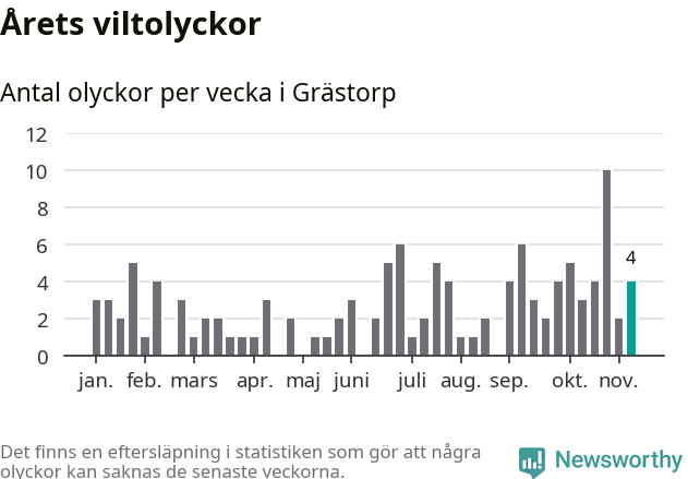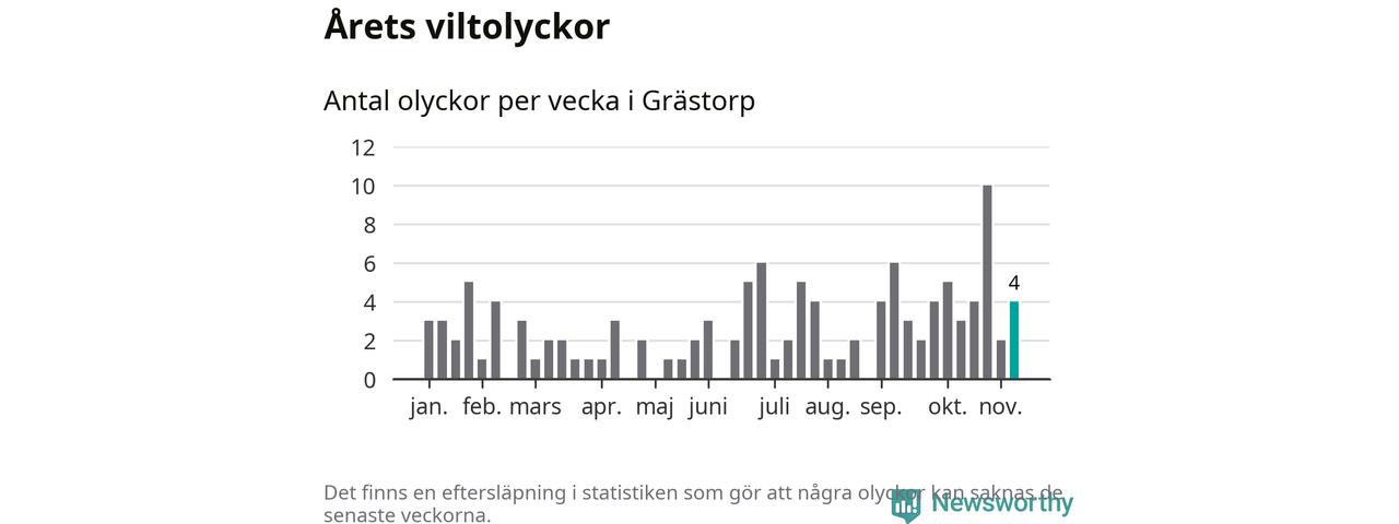 Hittills har fyra viltolyckor rapporterats in i Grästorps kommun från vecka 46. Se listan här.