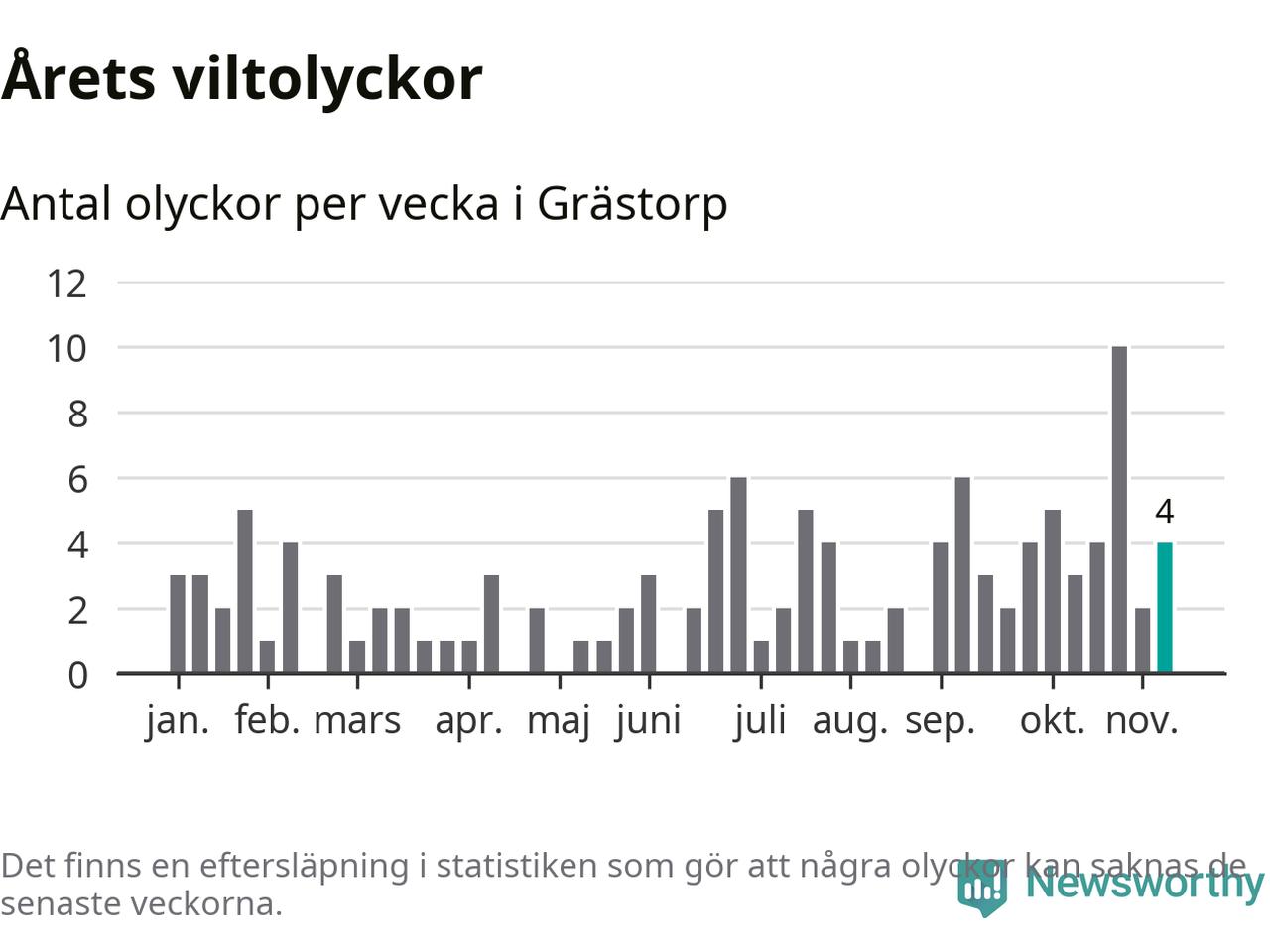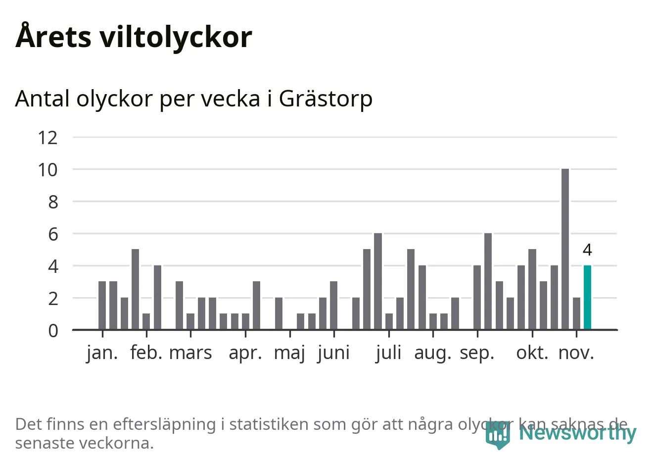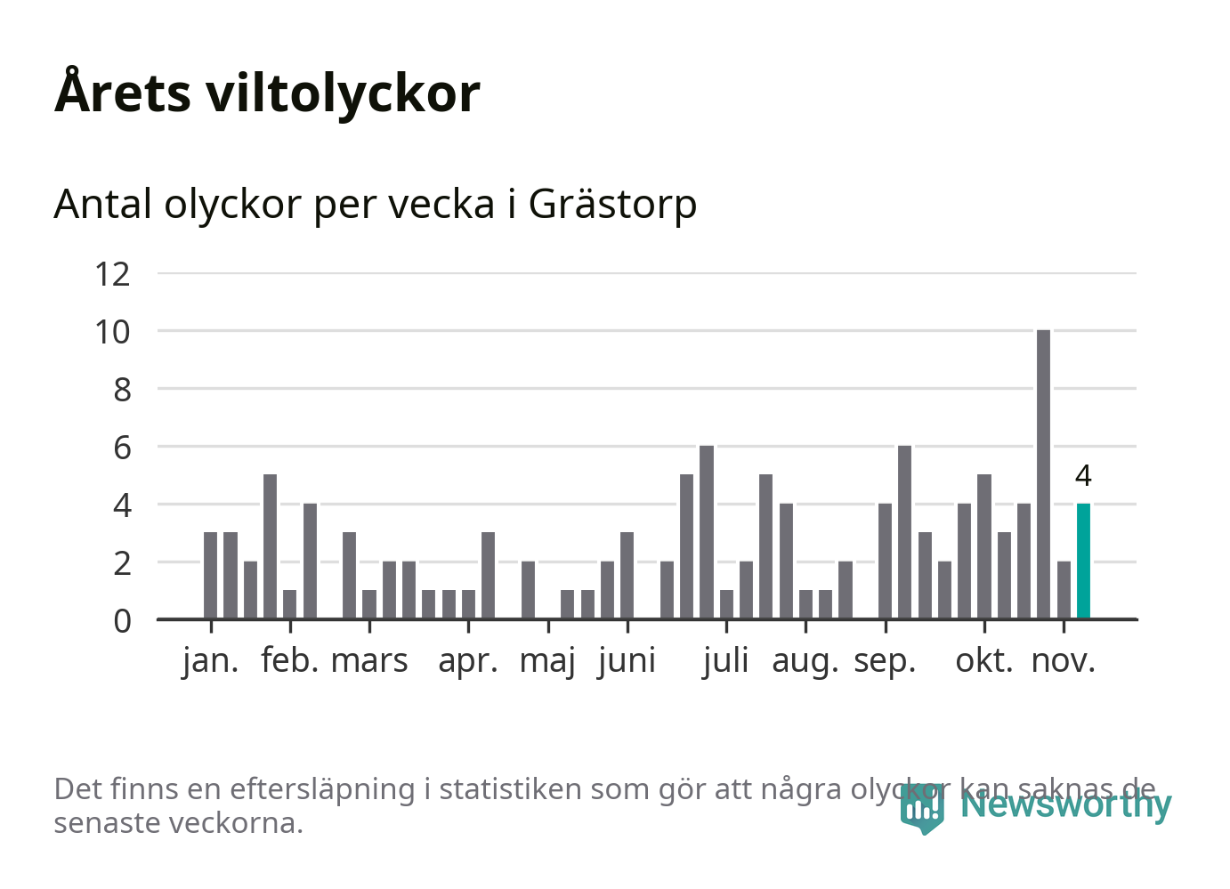 Hittills har fyra viltolyckor rapporterats in i Grästorps kommun från vecka 46. Se listan här.