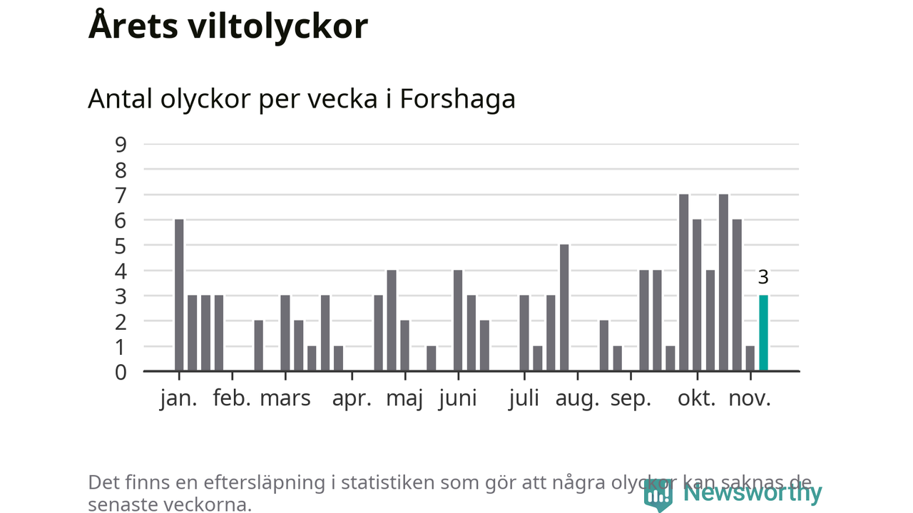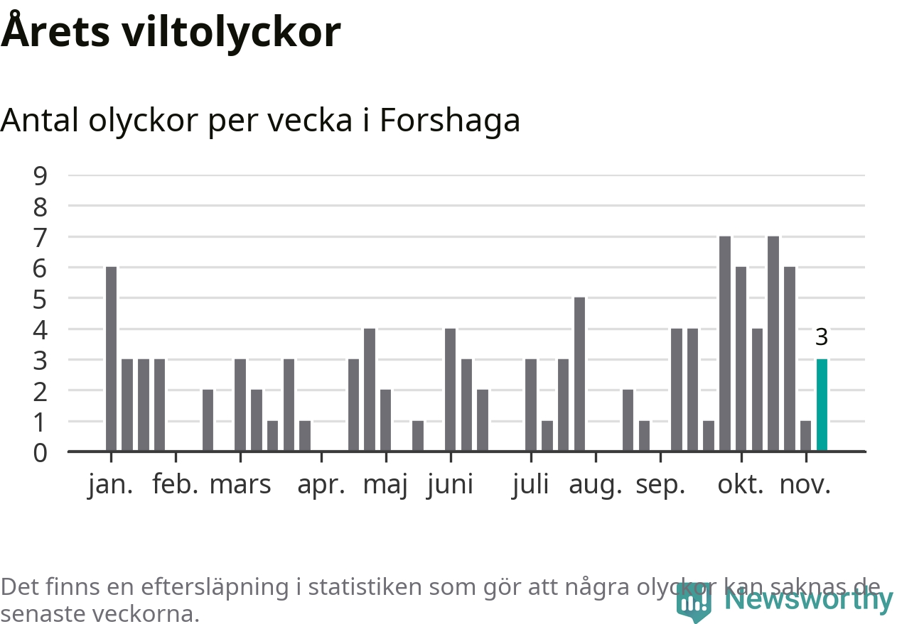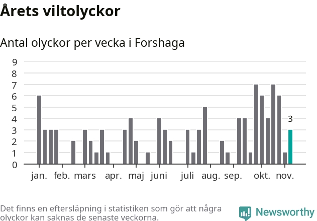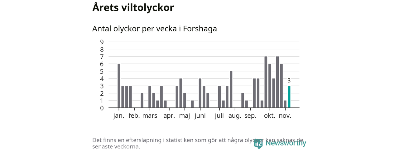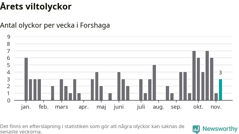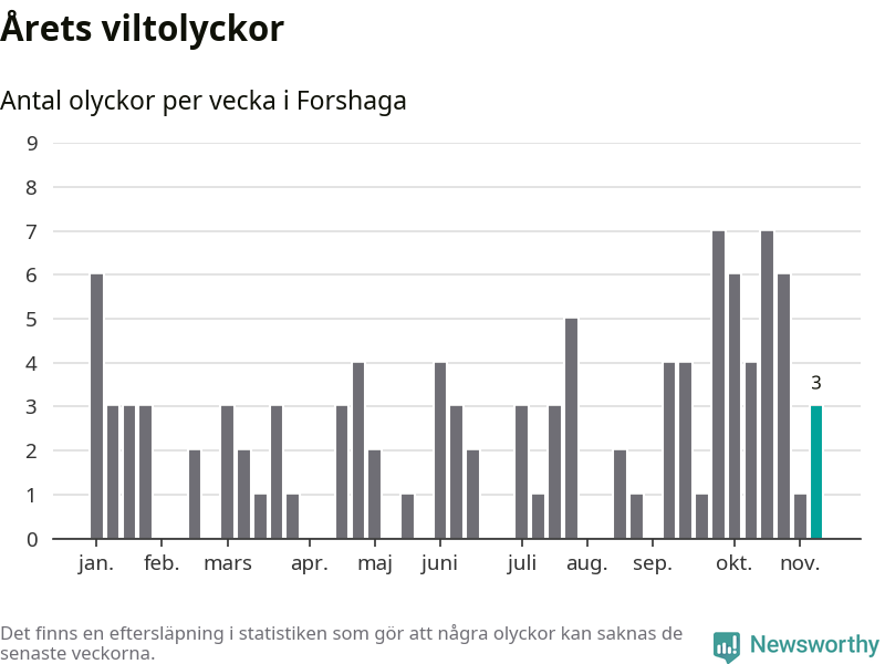 Hittills har tre viltolyckor rapporterats in i Forshaga kommun från vecka 46. Se listan här.