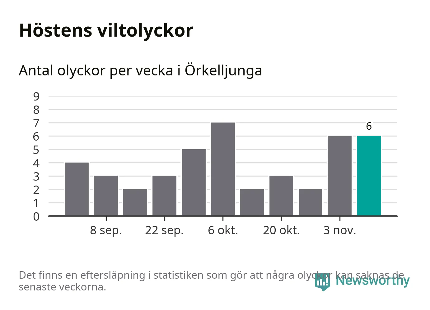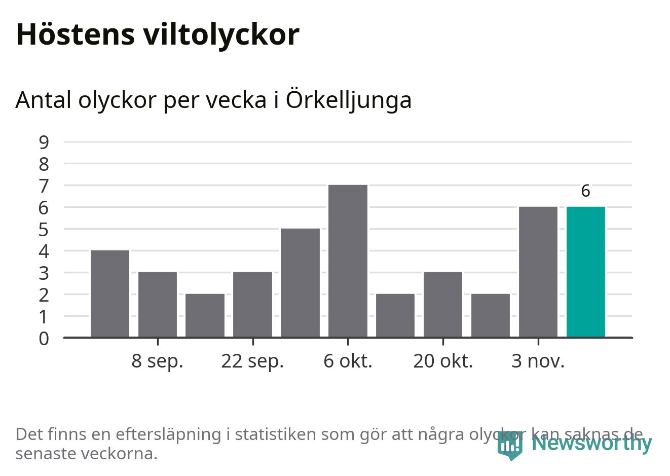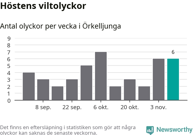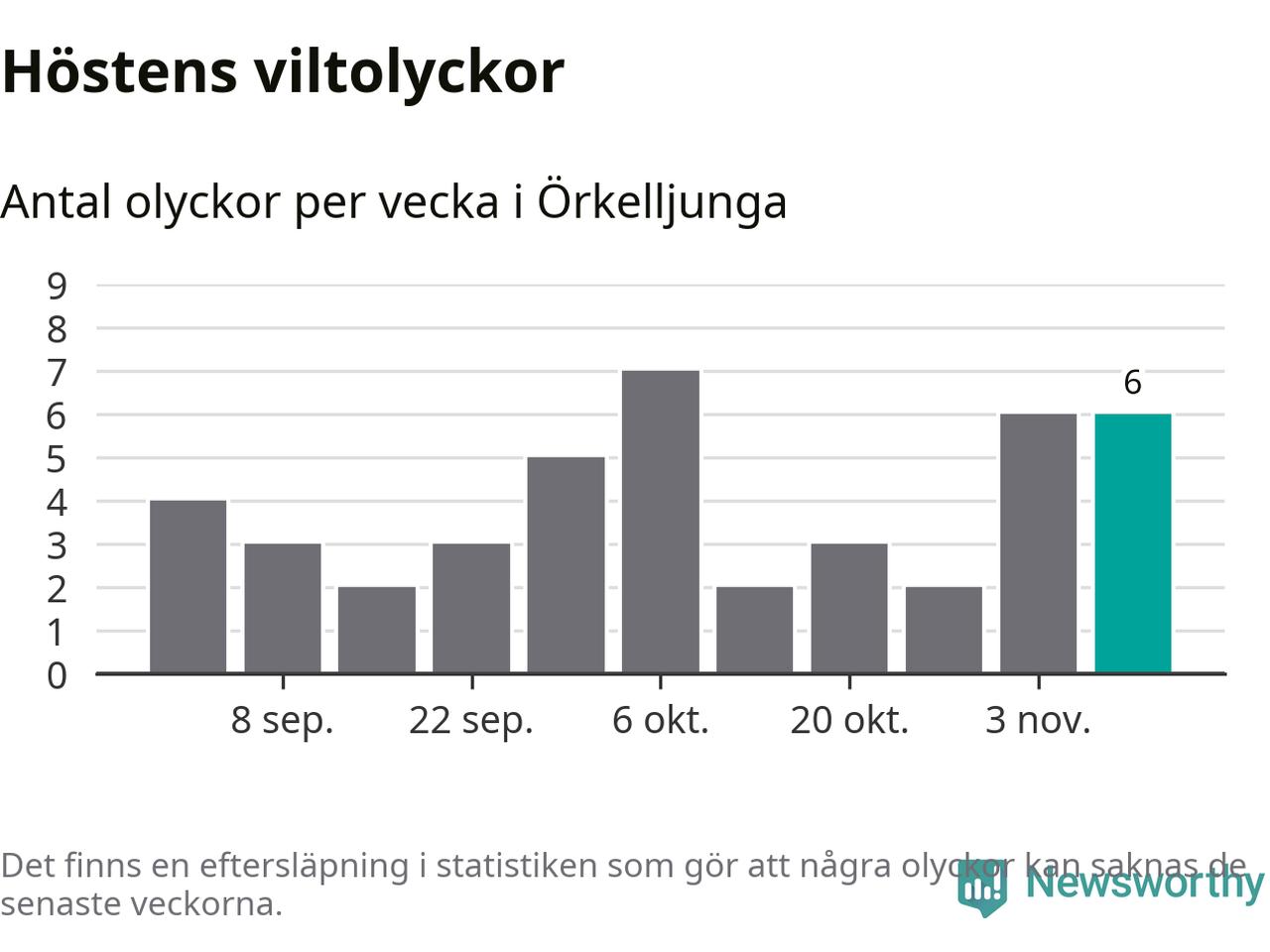 Under vecka 46 rapporterades sex viltolyckor in i Örkelljunga kommun. Därmed har det inträffat fler viltolyckor hittills den här hösten, än det brukar göra en hel genomsnittlig höst.