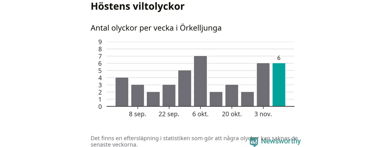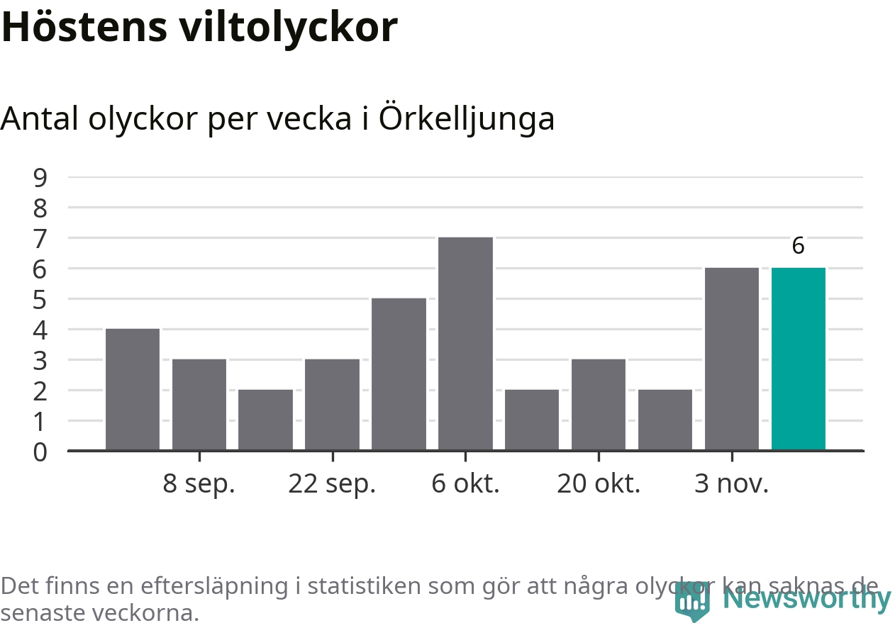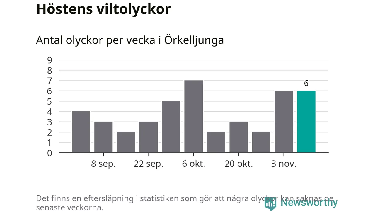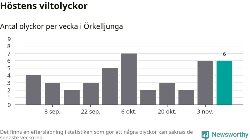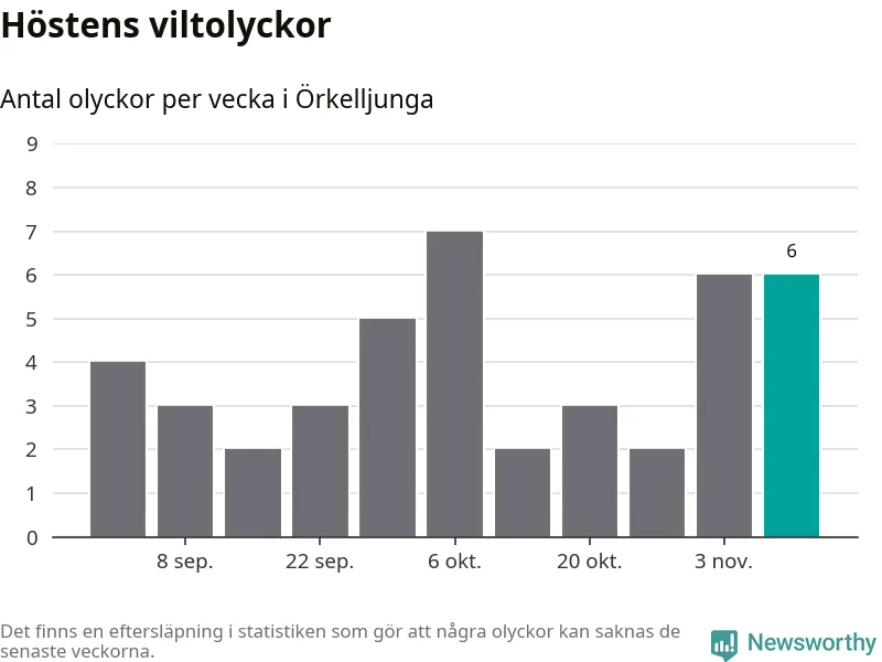 Under vecka 46 rapporterades sex viltolyckor in i Örkelljunga kommun. Därmed har det inträffat fler viltolyckor hittills den här hösten, än det brukar göra en hel genomsnittlig höst.