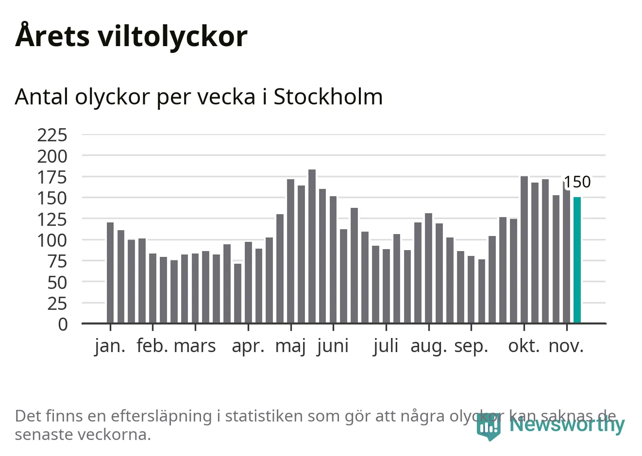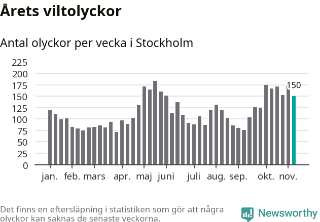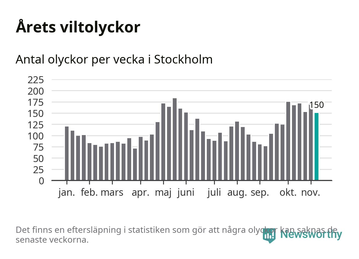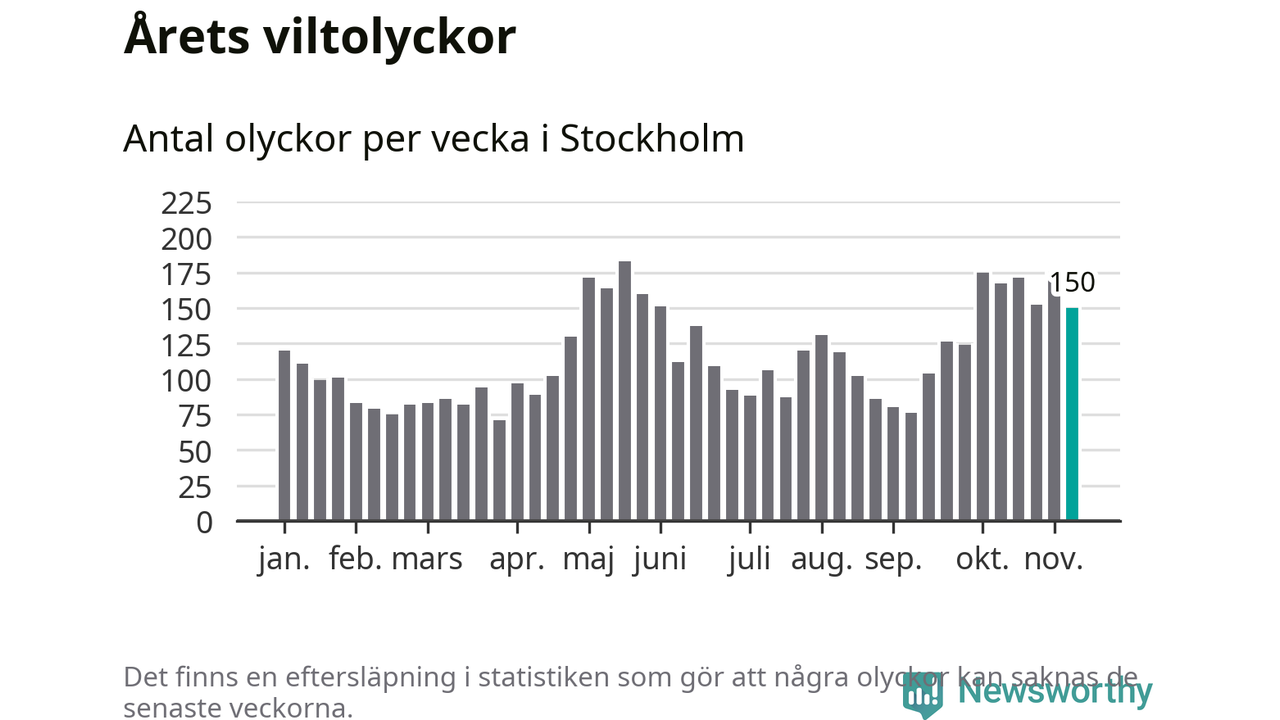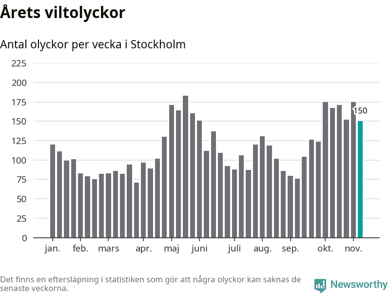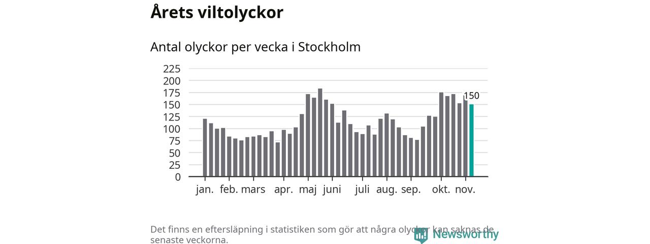 Hittills har 150 viltolyckor rapporterats in i Stockholms län från vecka 46. Se listan här.