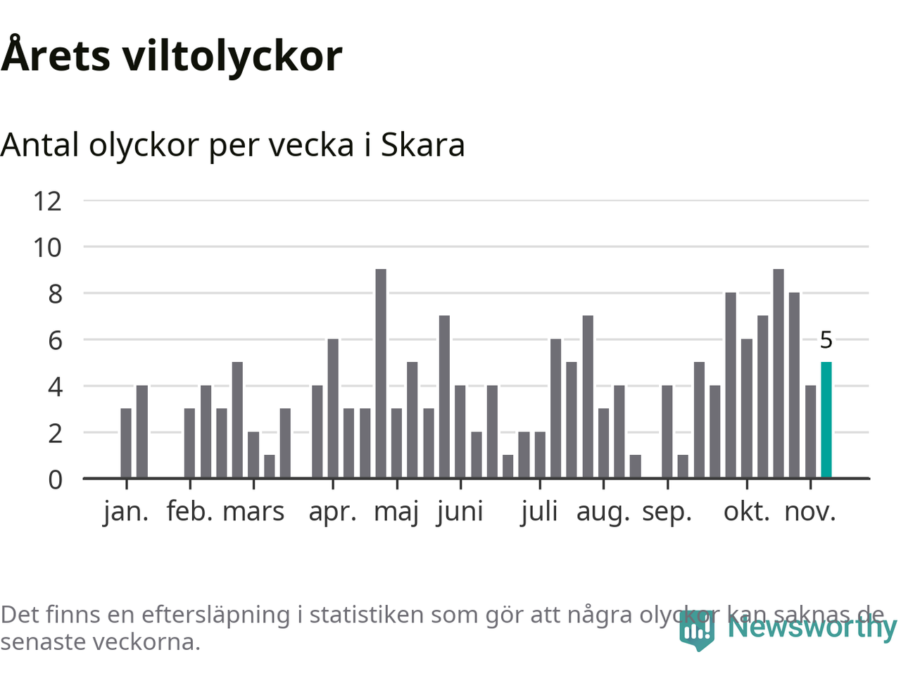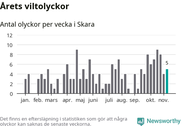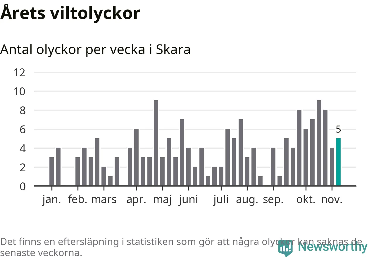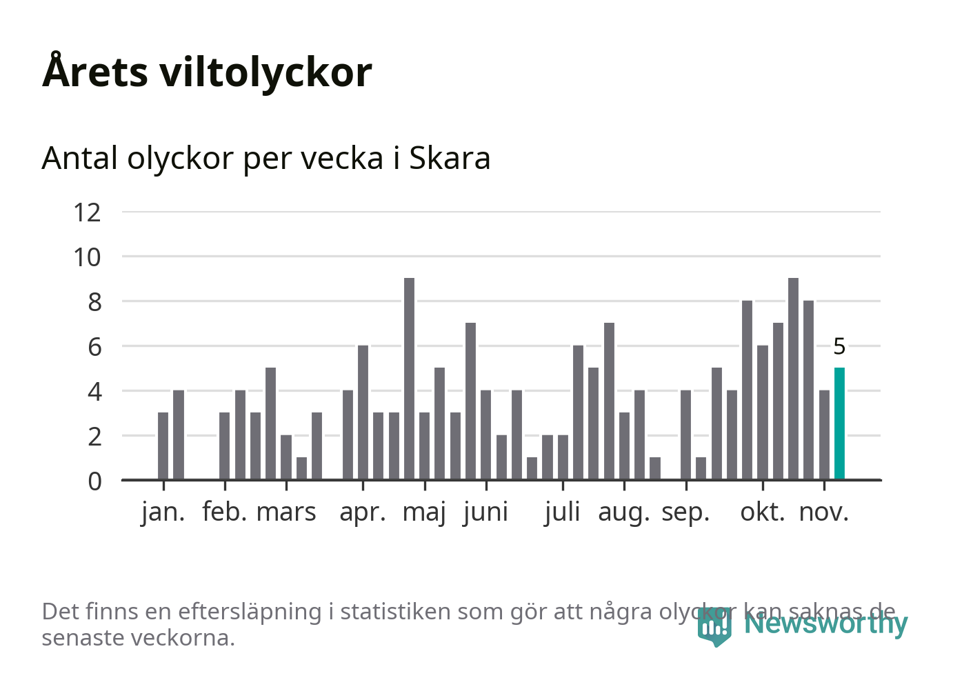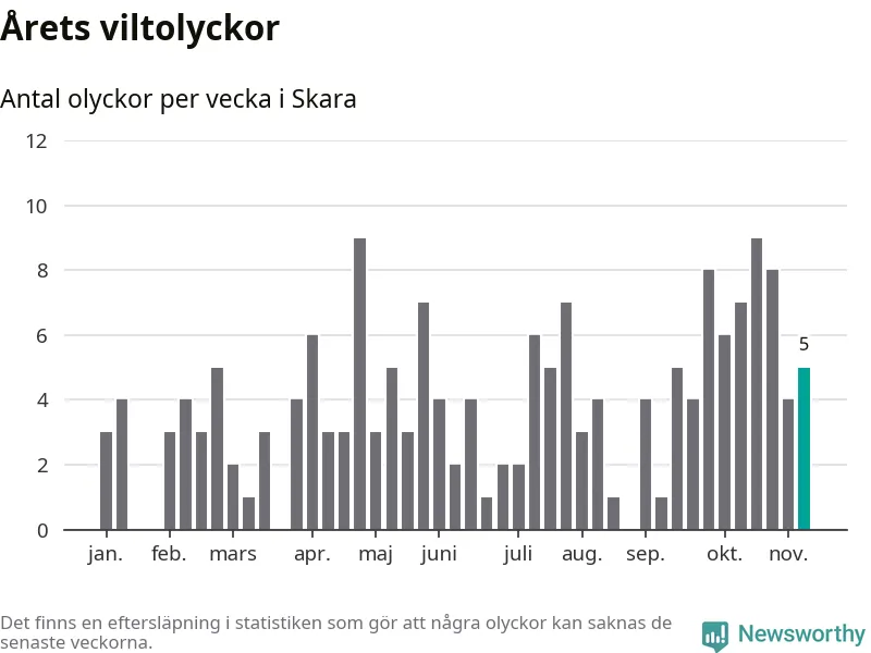 Hittills har fem viltolyckor rapporterats in i Skara kommun från vecka 46. Se listan här.