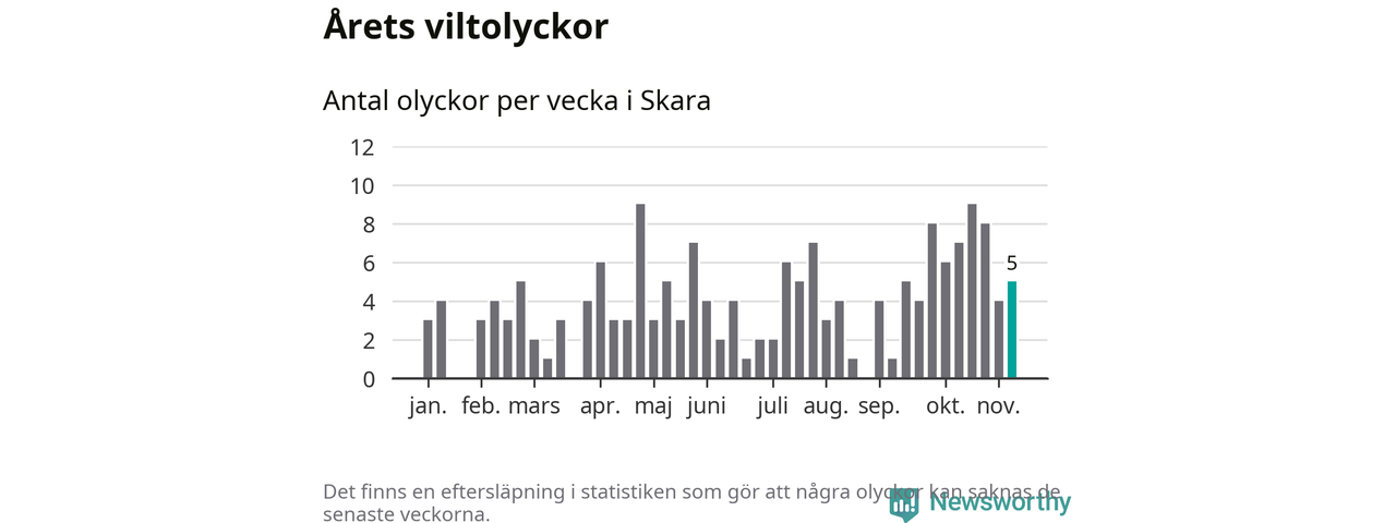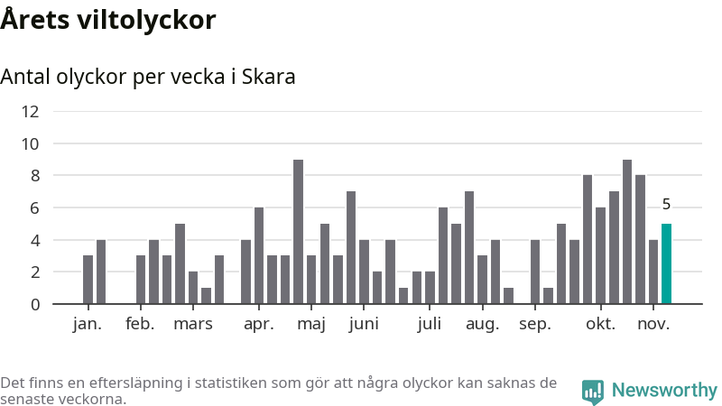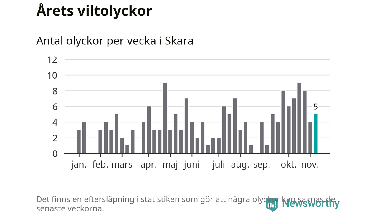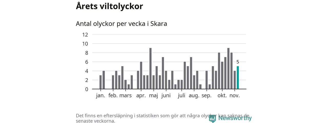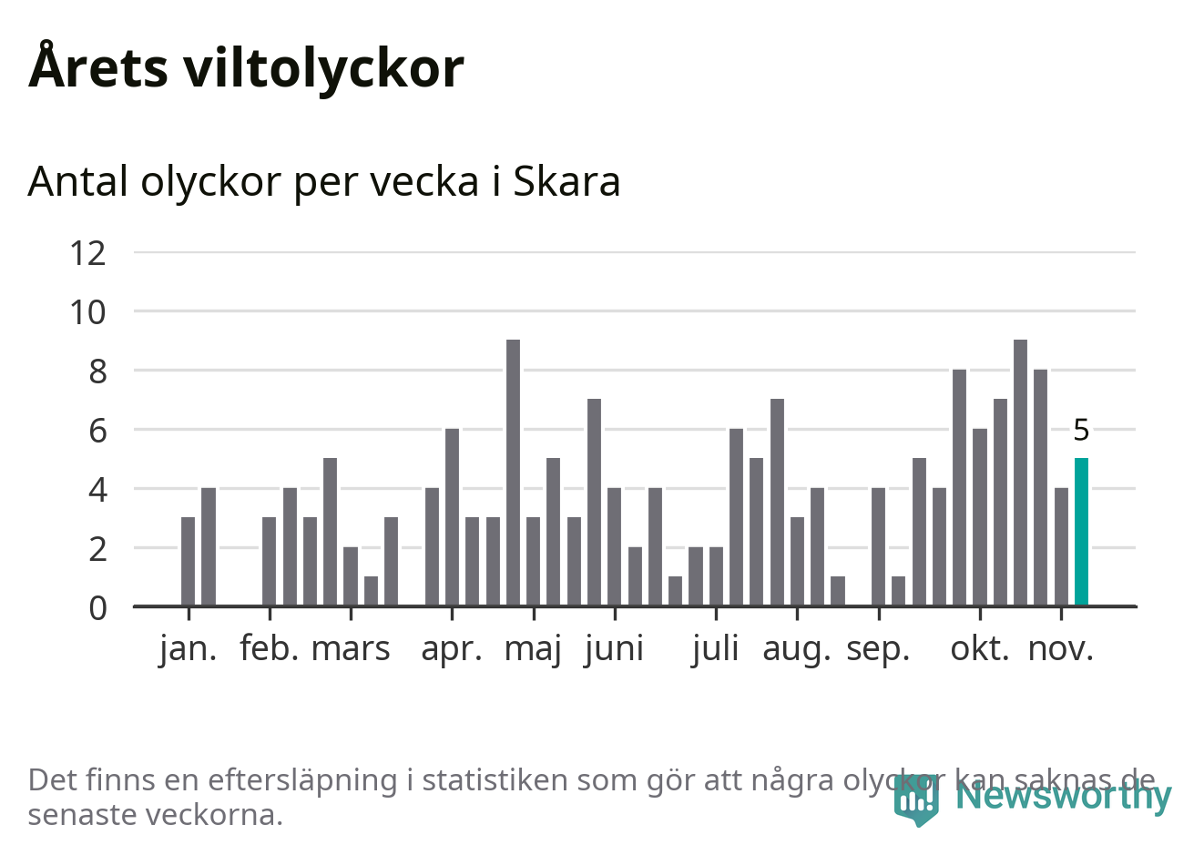 Hittills har fem viltolyckor rapporterats in i Skara kommun från vecka 46. Se listan här.