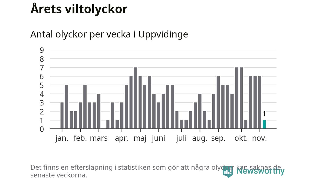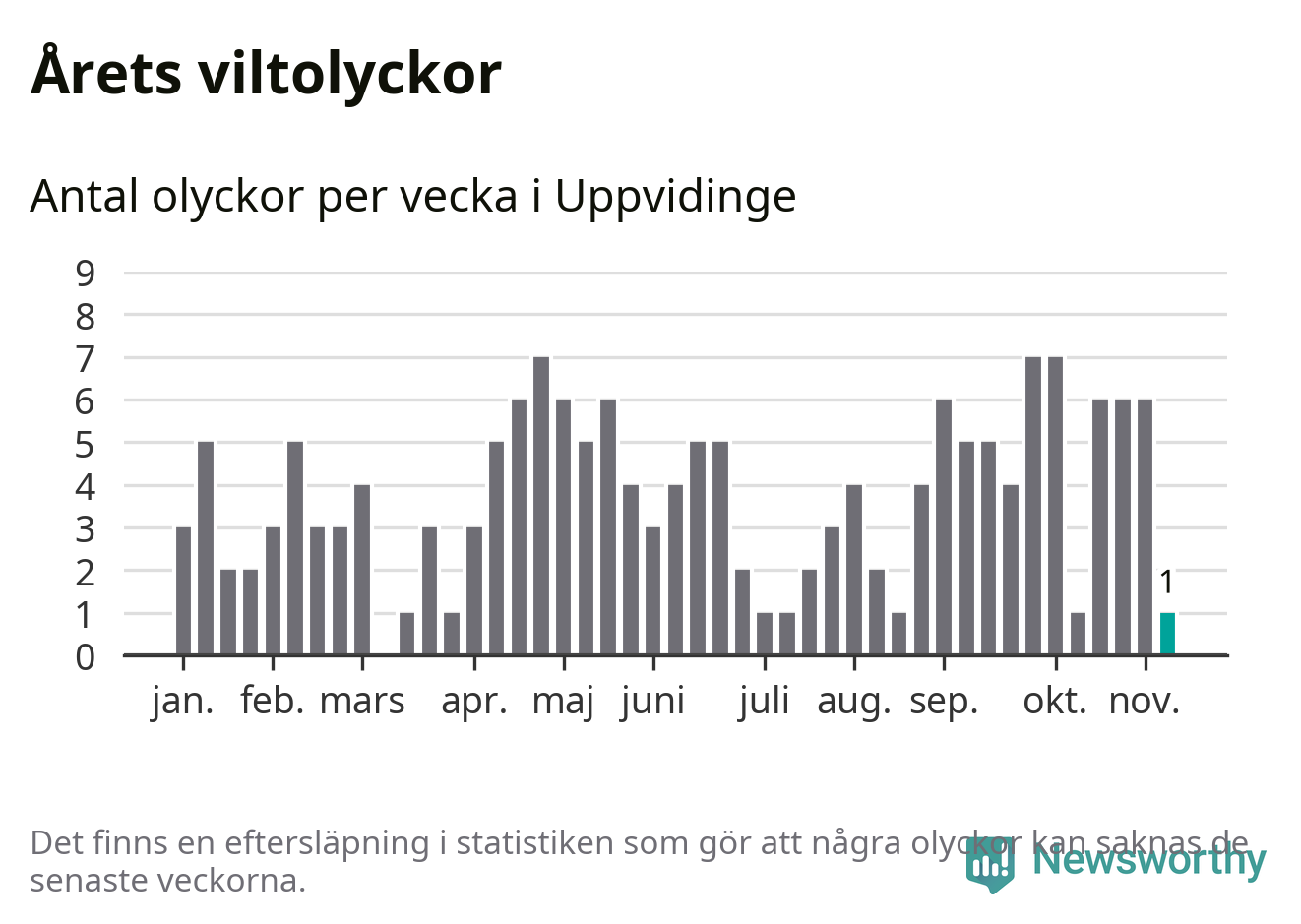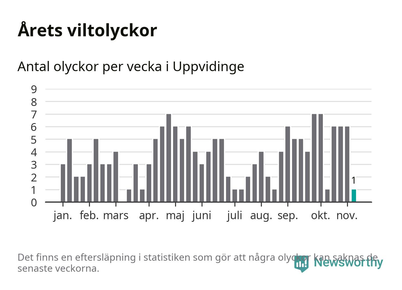 Från förra veckan (vecka 46) har hittills en viltolycka rapporterats in i Uppvidinge kommun.