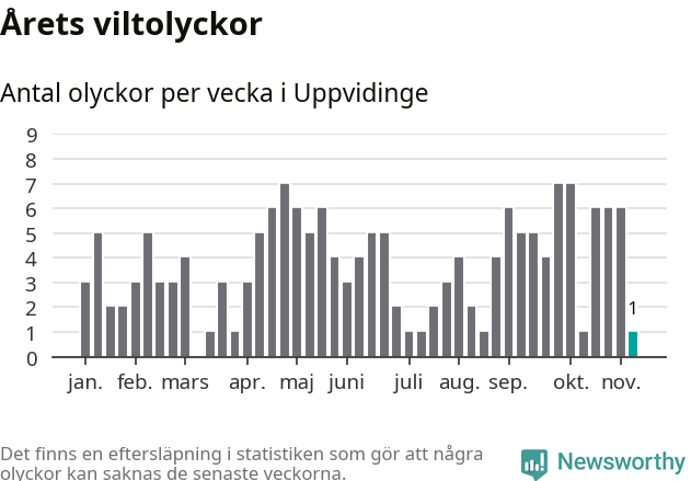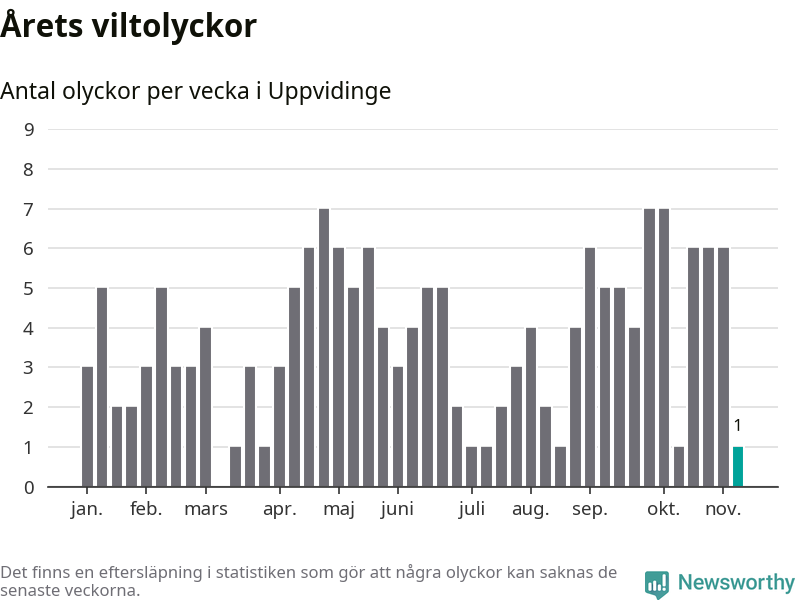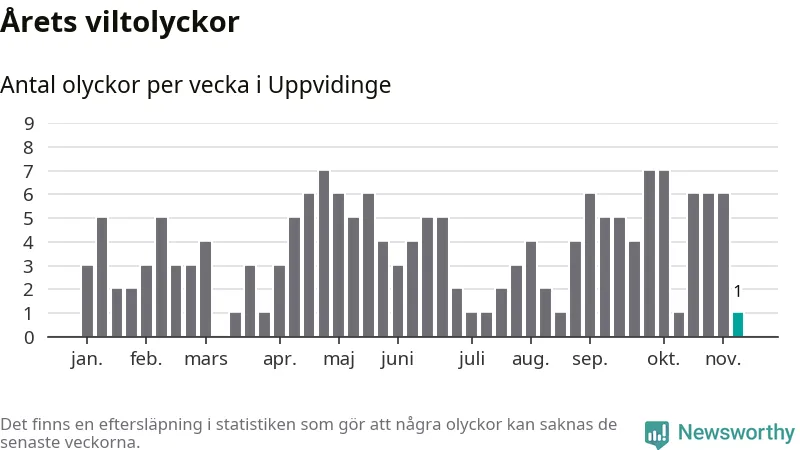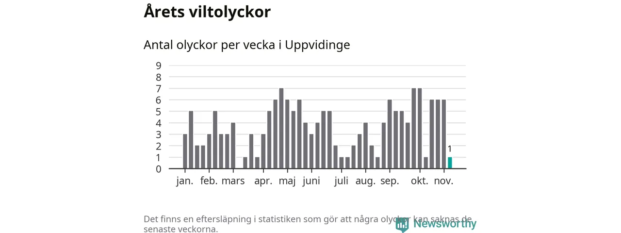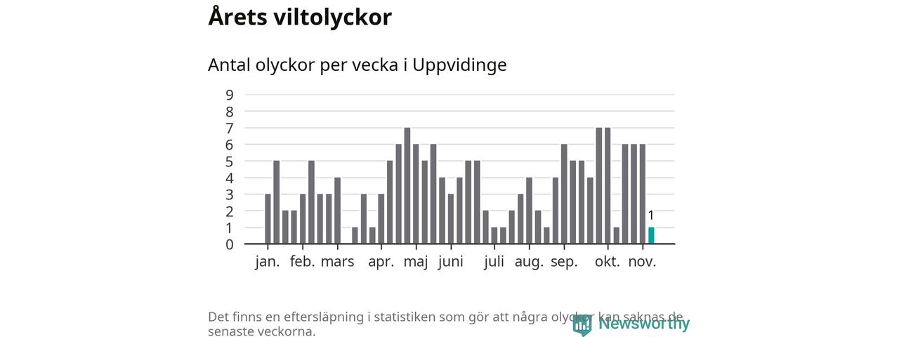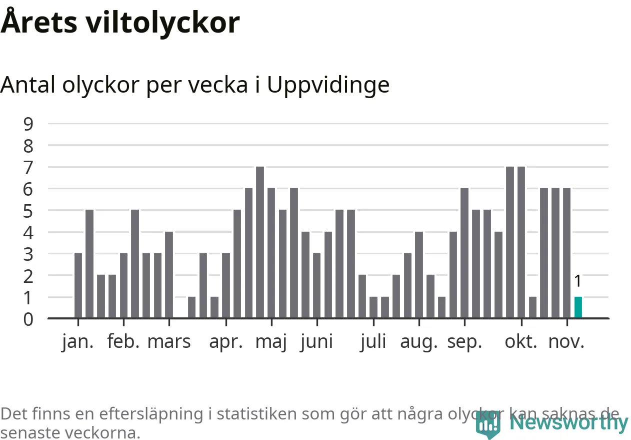 Från förra veckan (vecka 46) har hittills en viltolycka rapporterats in i Uppvidinge kommun.