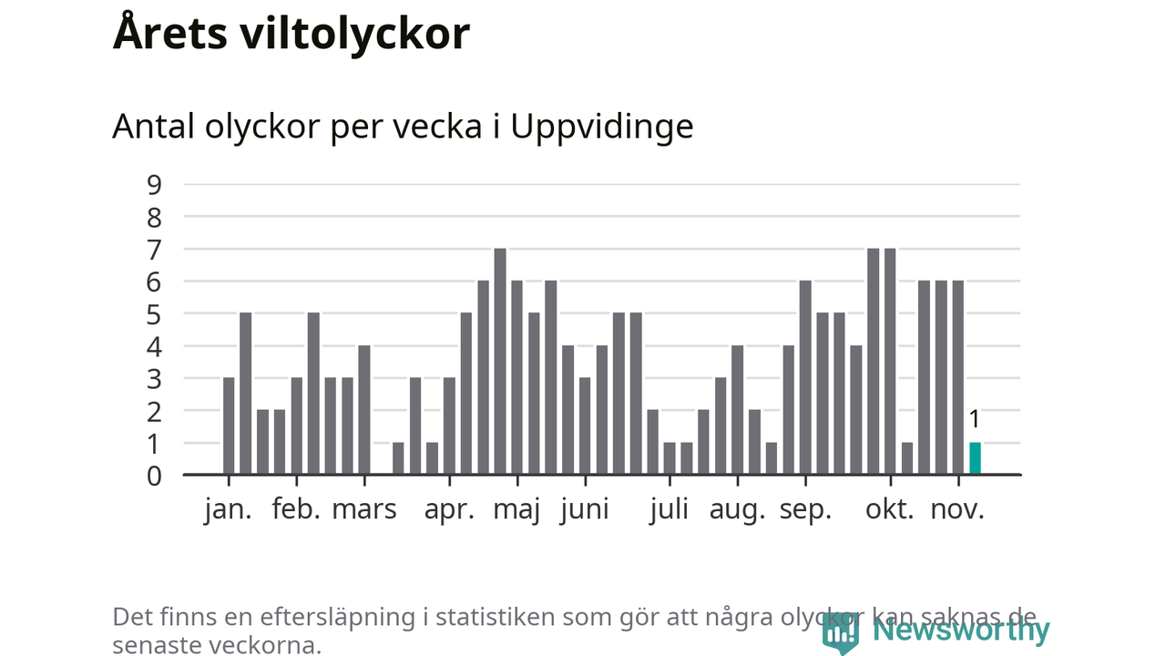 Totalt det här året har det inträffat 170 viltolyckor i kommunen. Det är mindre än genomsnittet för motsvarande period (omkring 211) de senaste tio åren.
