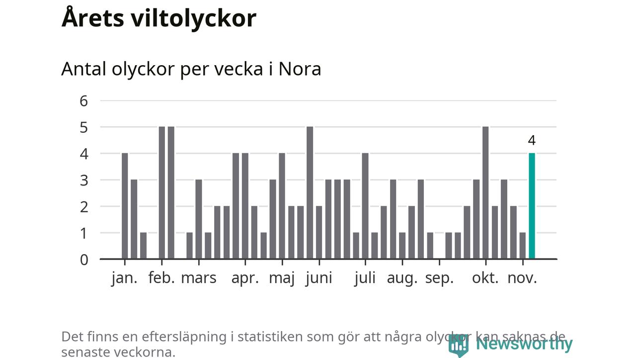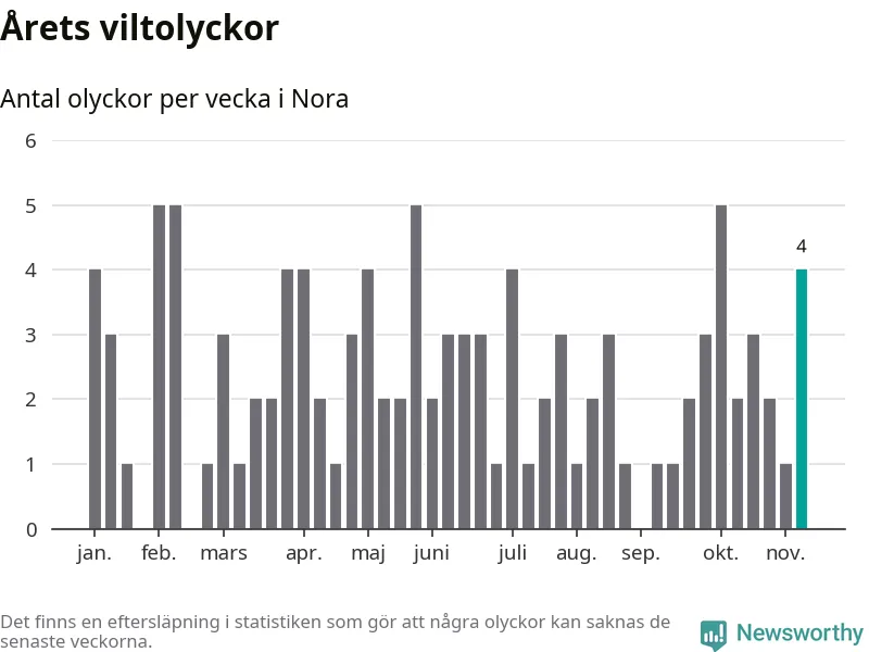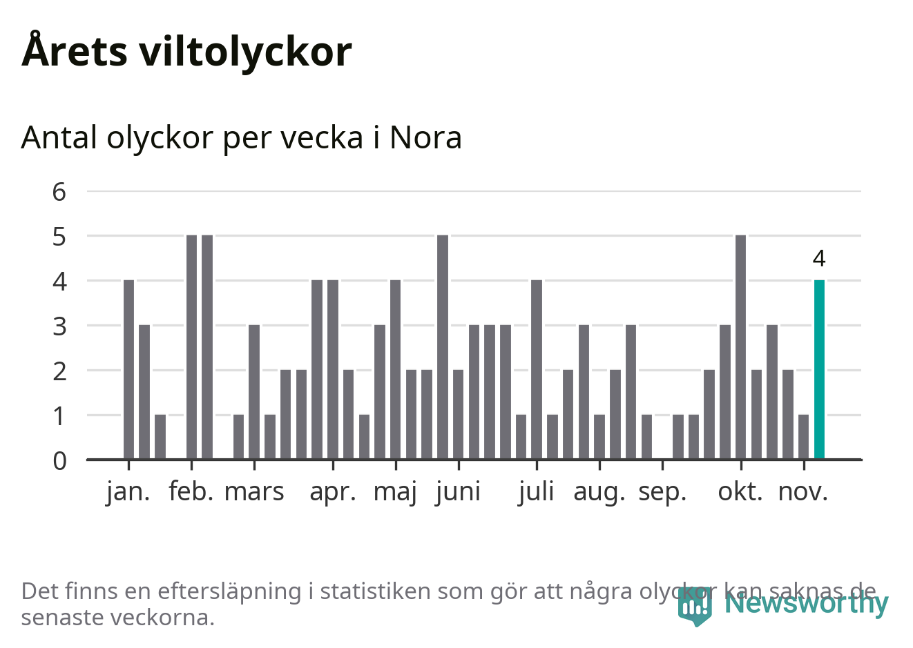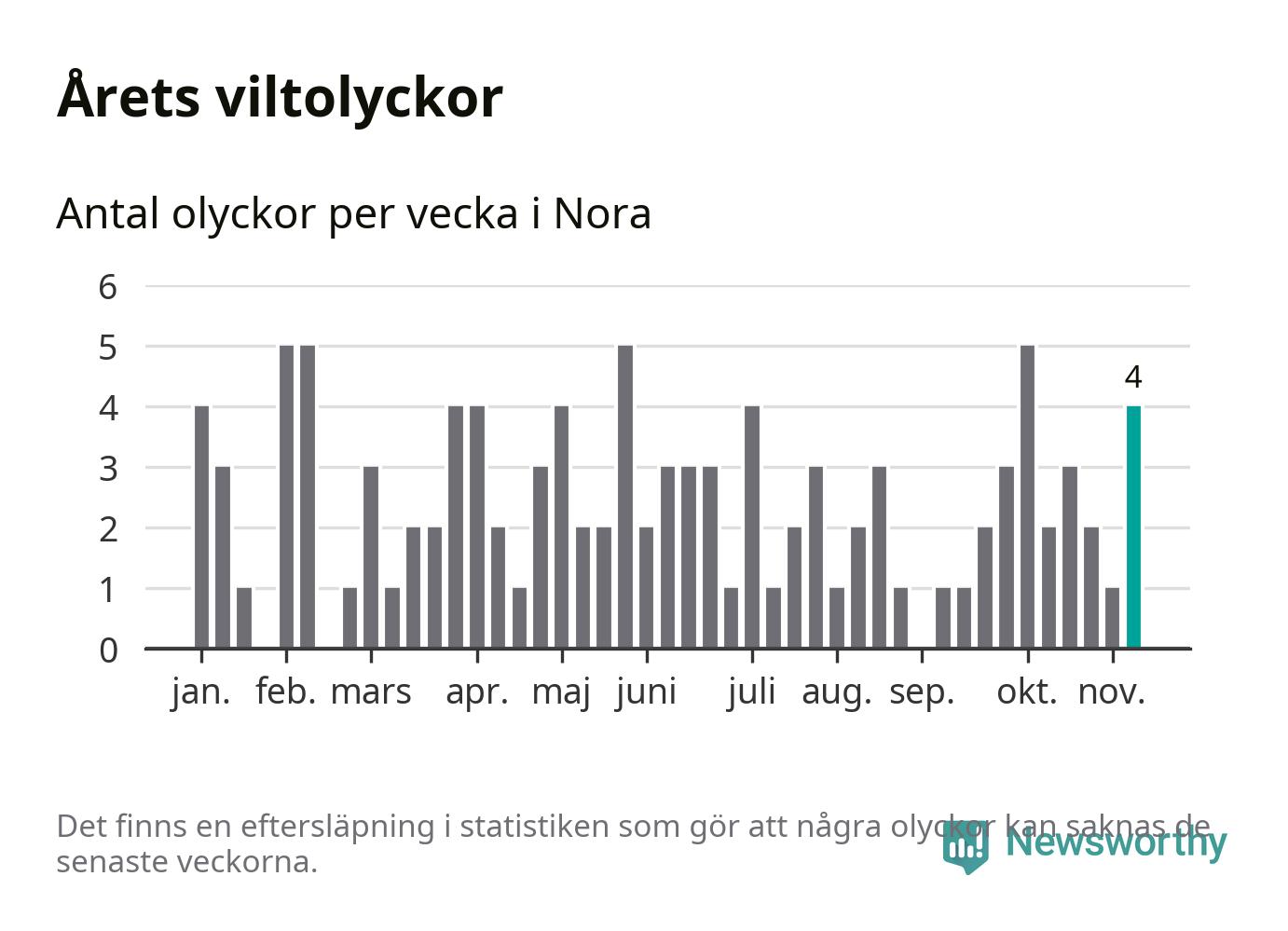 Hittills har fyra viltolyckor rapporterats in i Nora kommun från vecka 46. Se listan här.
