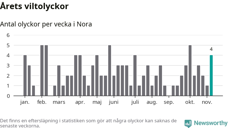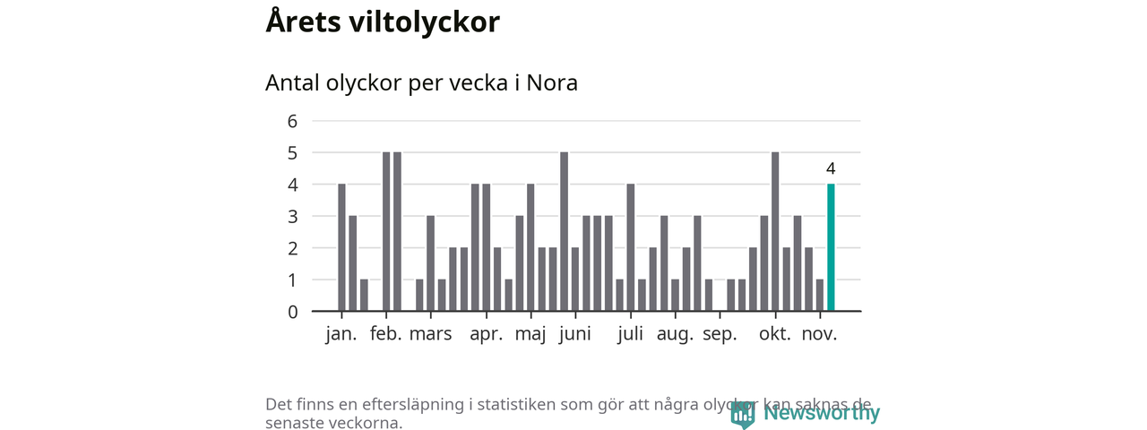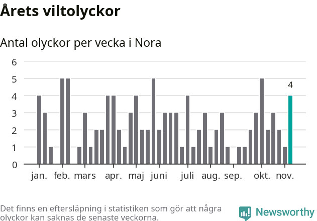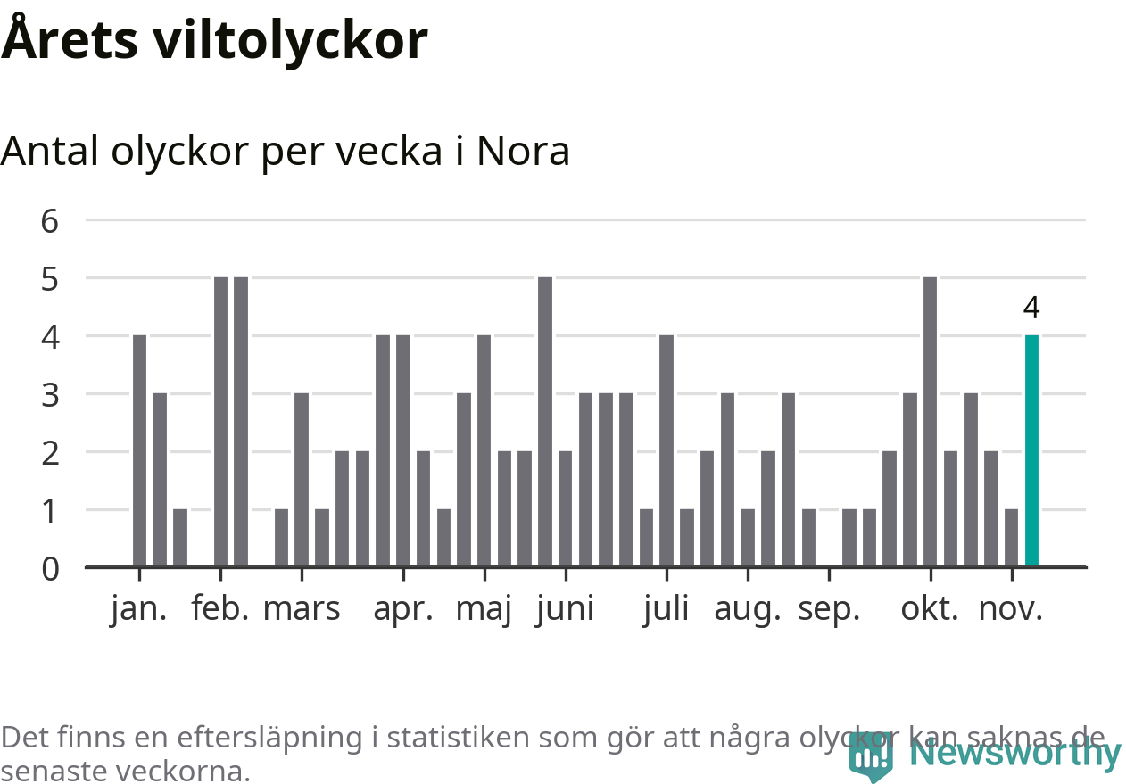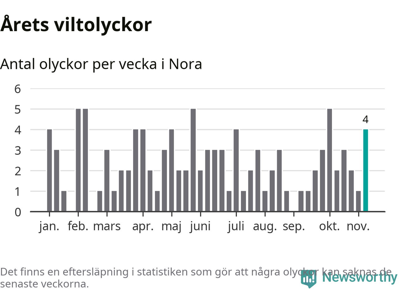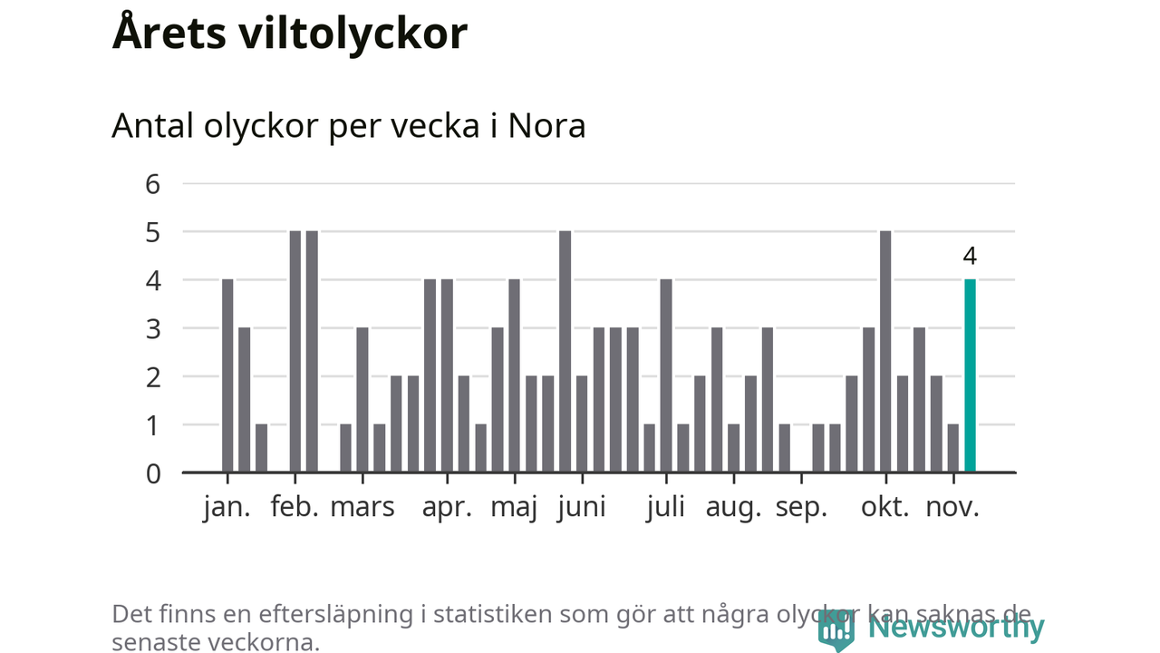 Hittills har fyra viltolyckor rapporterats in i Nora kommun från vecka 46. Se listan här.