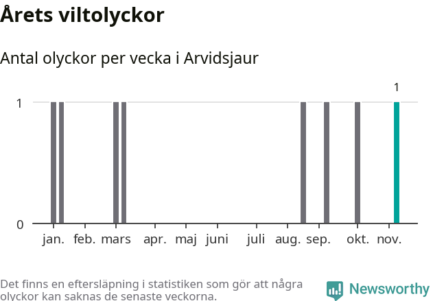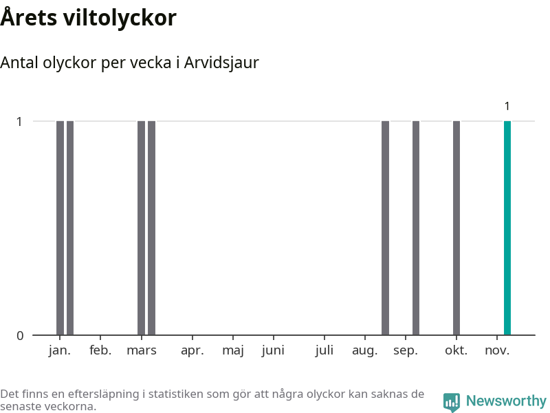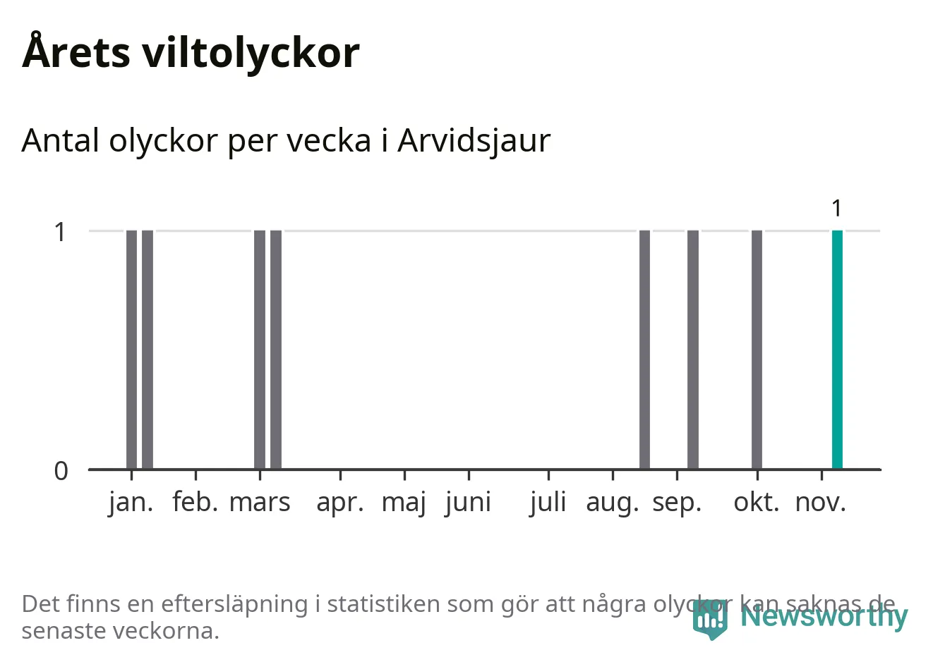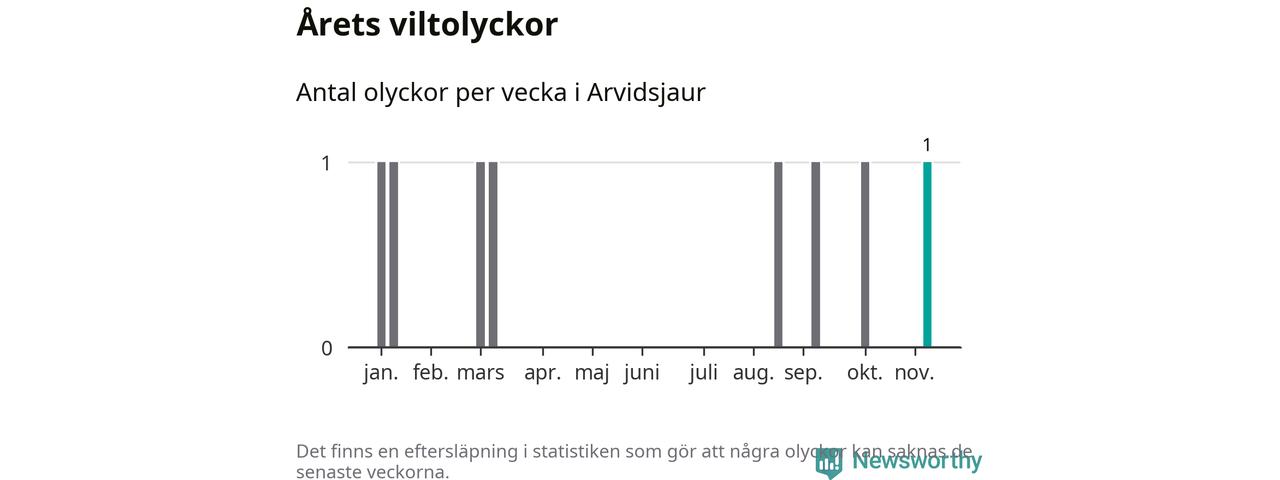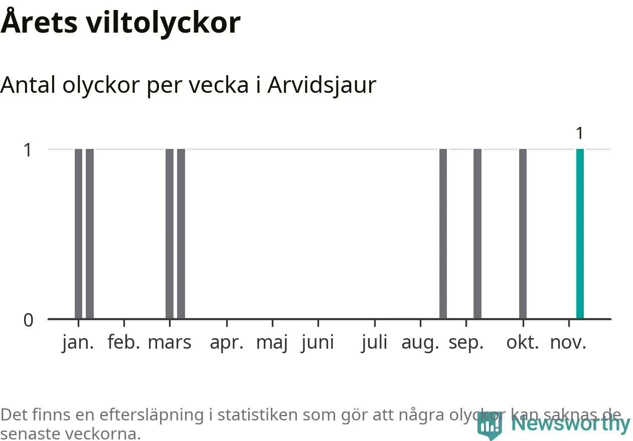 Från förra veckan (vecka 46) har hittills en viltolycka rapporterats in i Arvidsjaurs kommun.