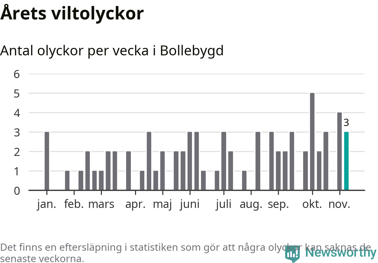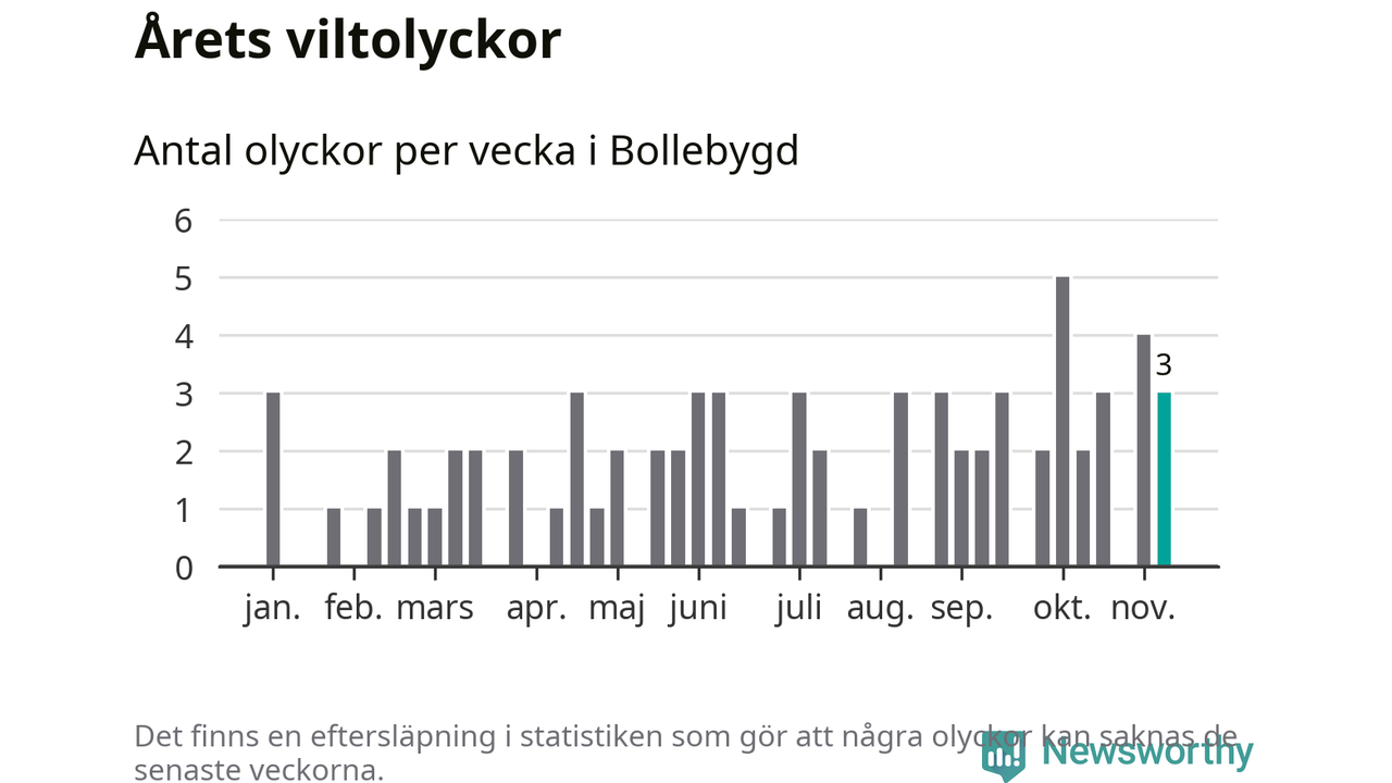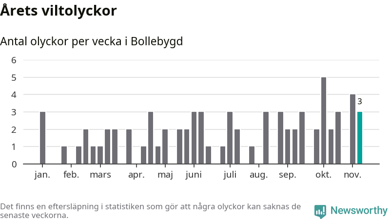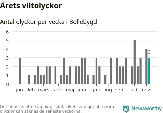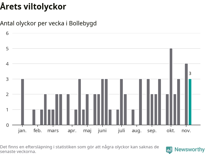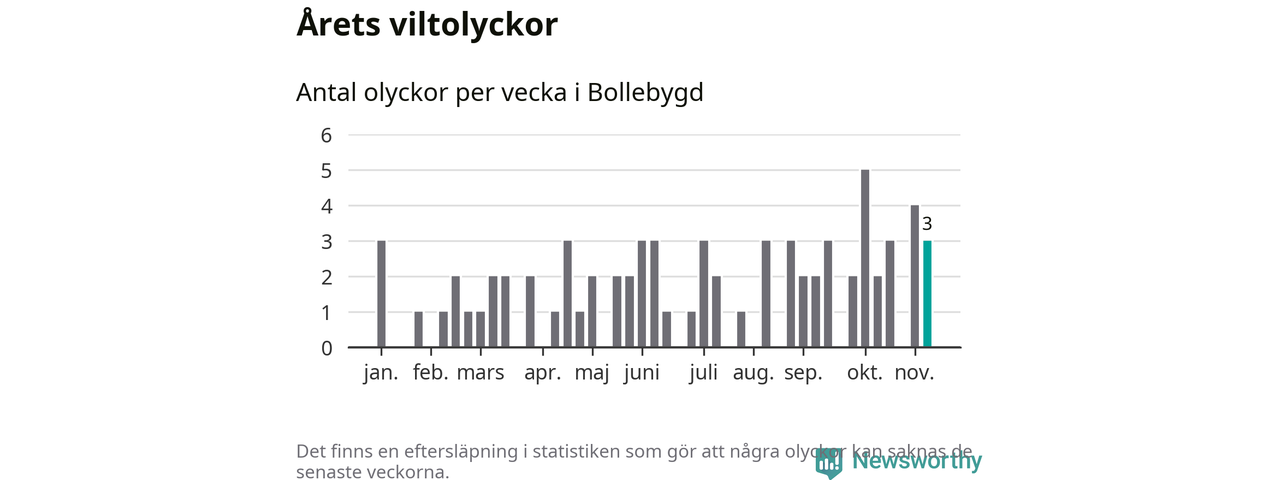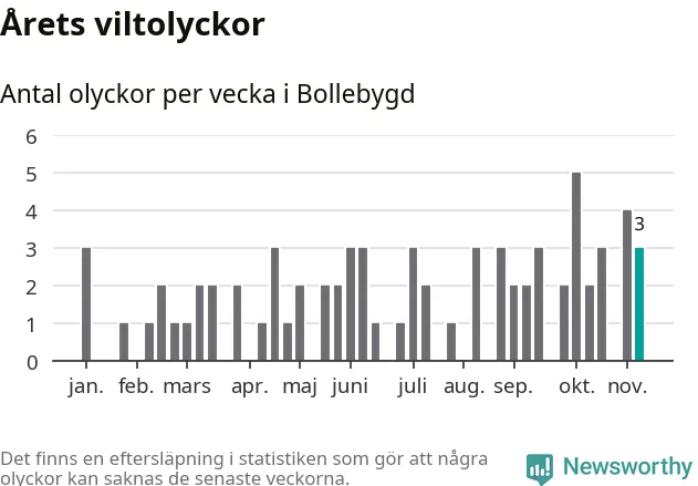 Hittills har tre viltolyckor rapporterats in i Bollebygds kommun från vecka 46. Se listan här.