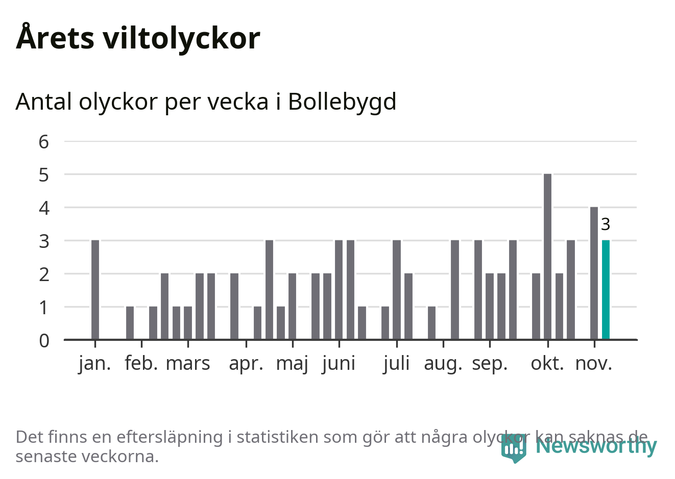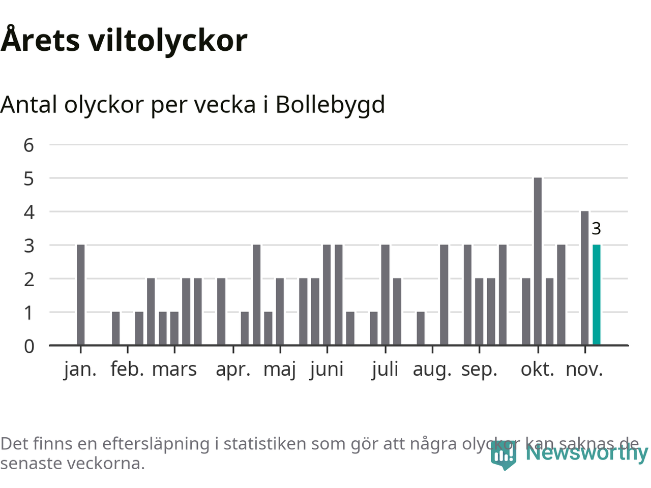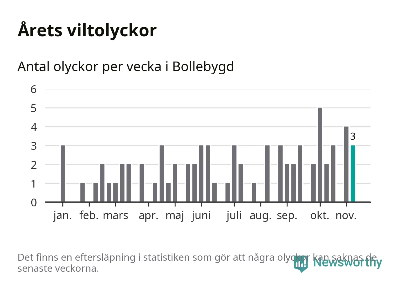 Hittills har tre viltolyckor rapporterats in i Bollebygds kommun från vecka 46. Se listan här.