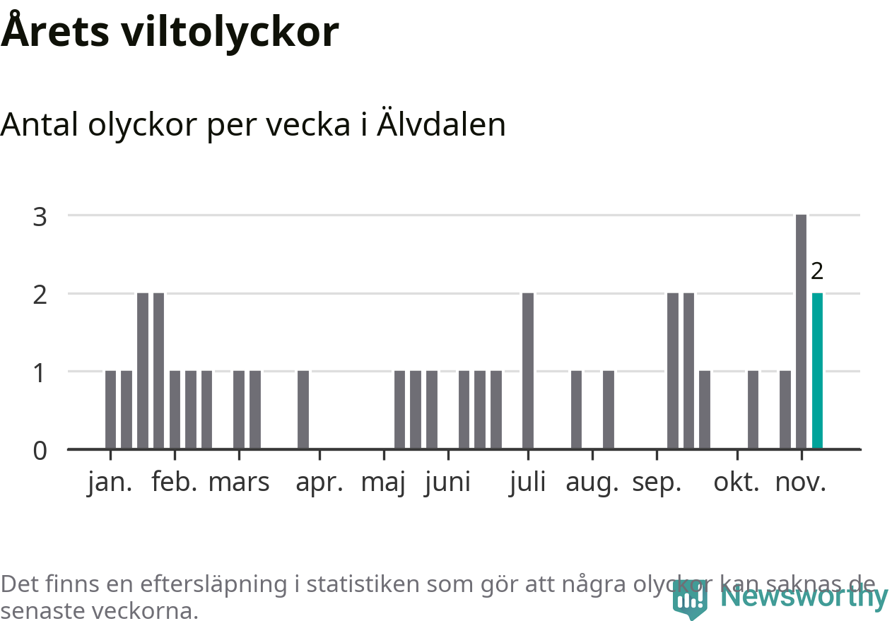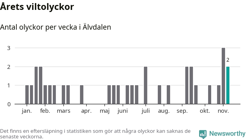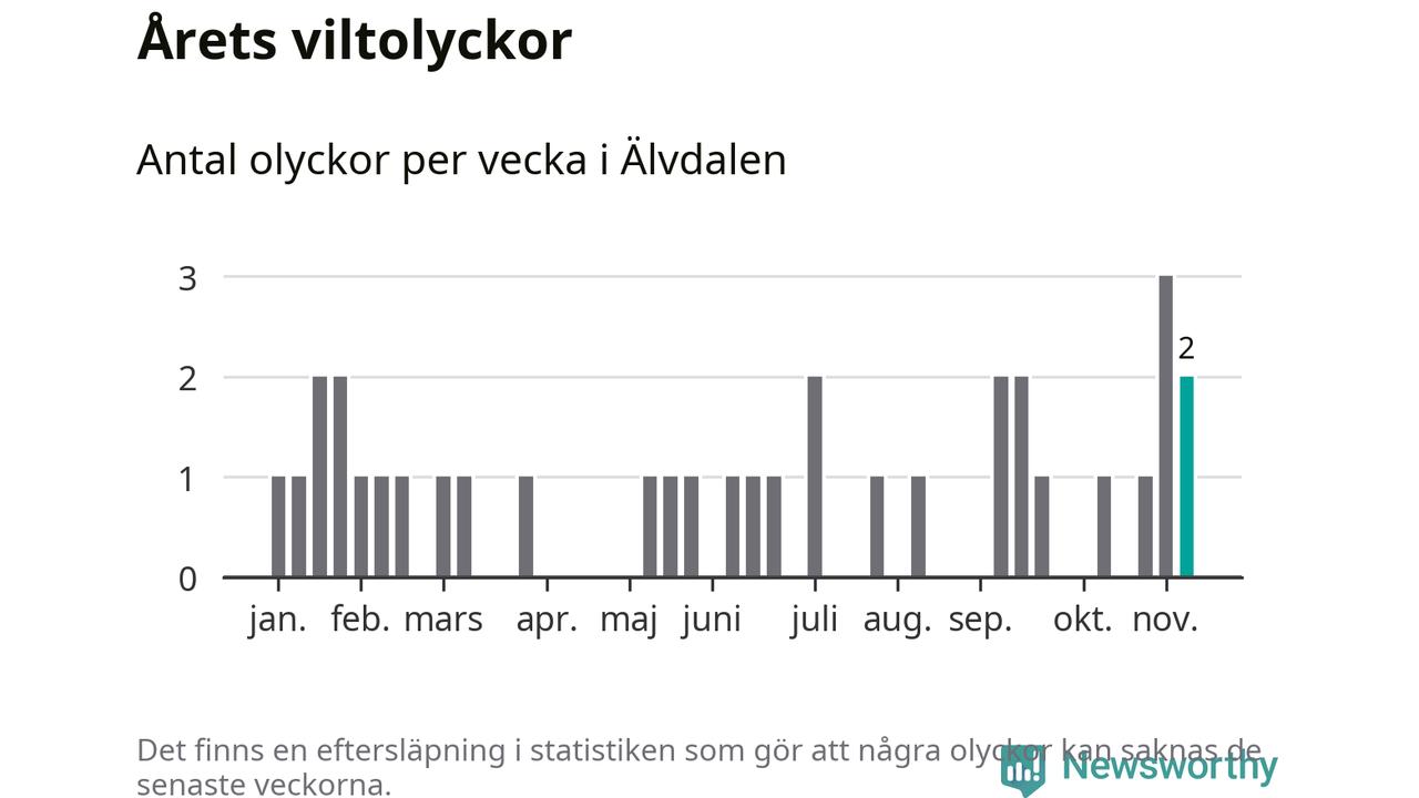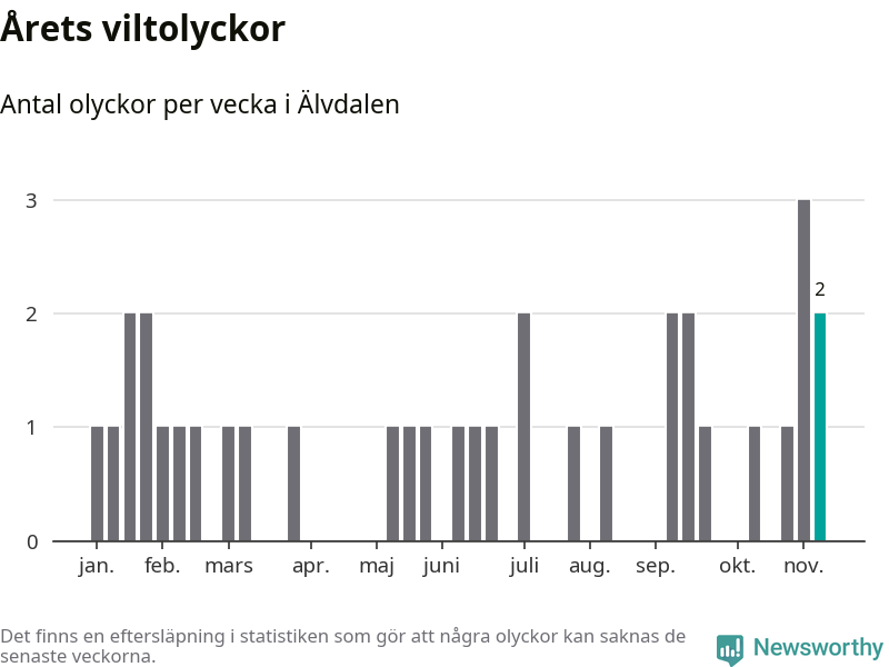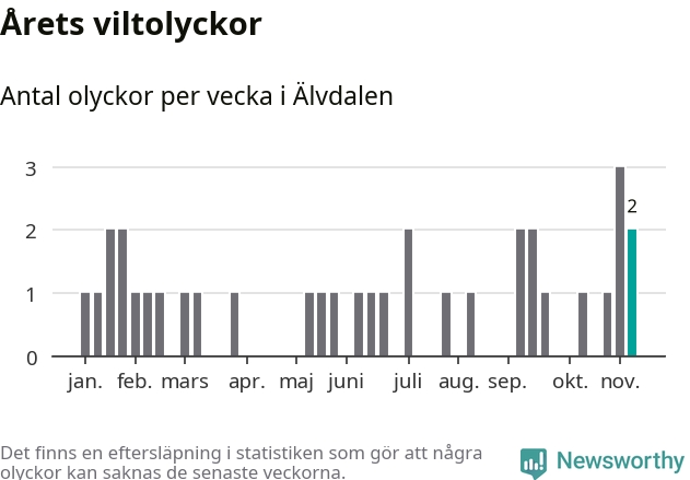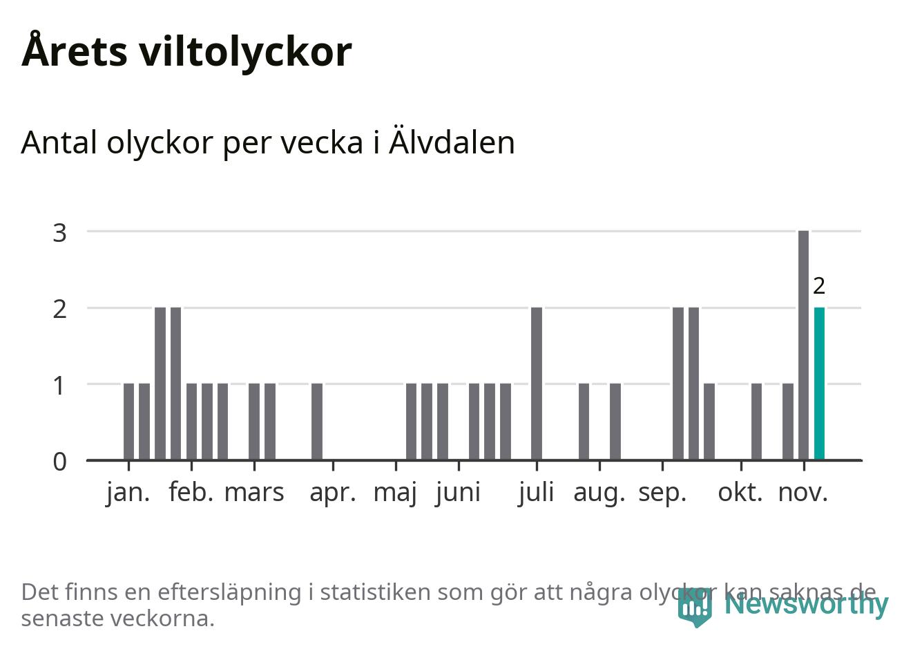 Hittills har två viltolyckor rapporterats in i Älvdalens kommun från vecka 46. Se listan här.