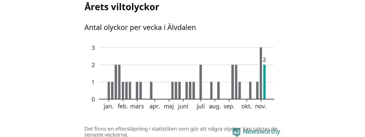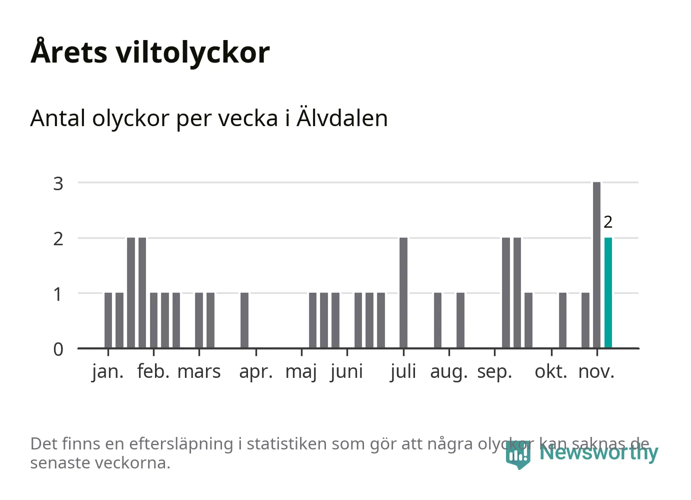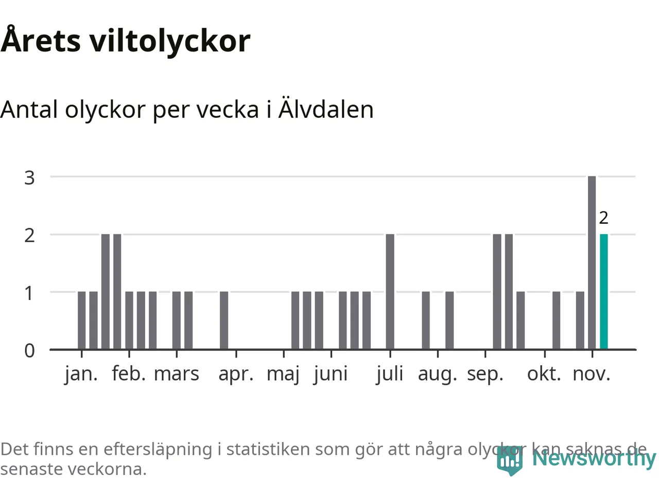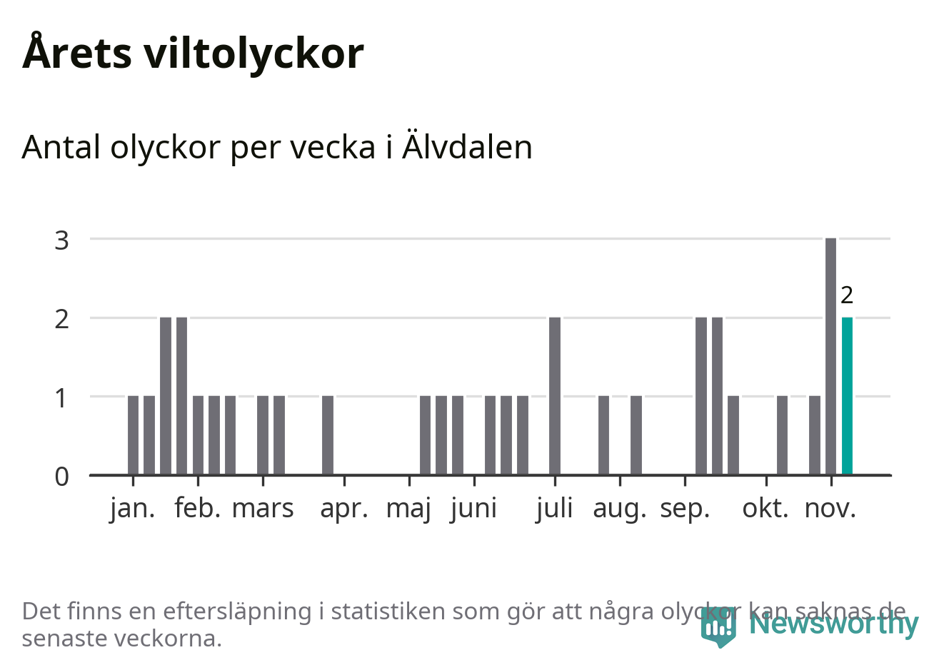 Hittills har två viltolyckor rapporterats in i Älvdalens kommun från vecka 46. Se listan här.