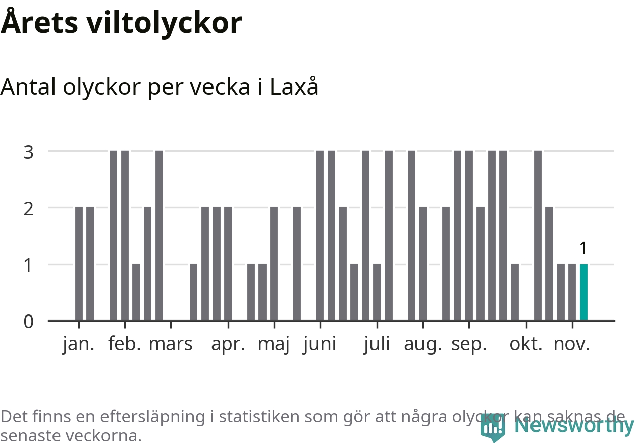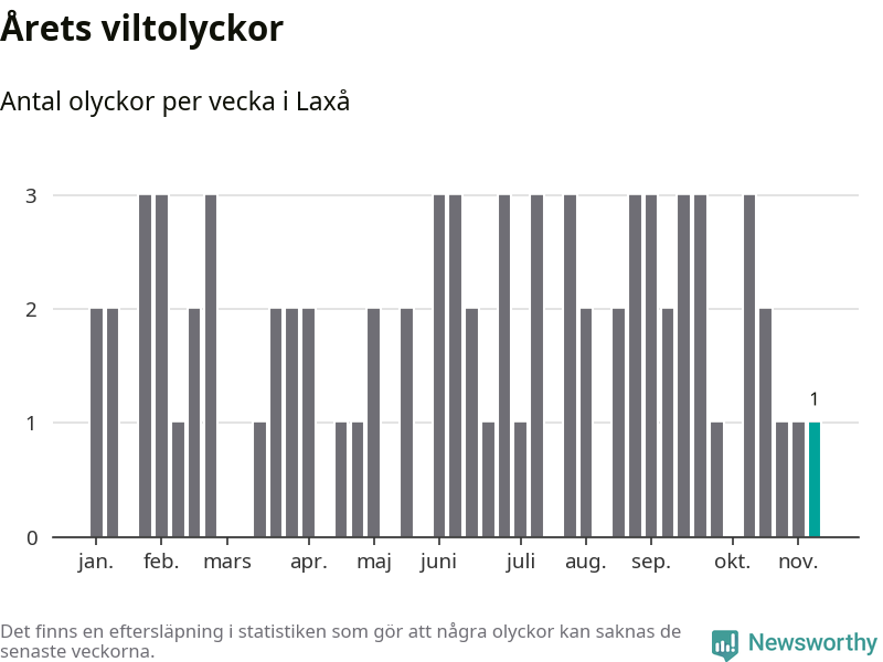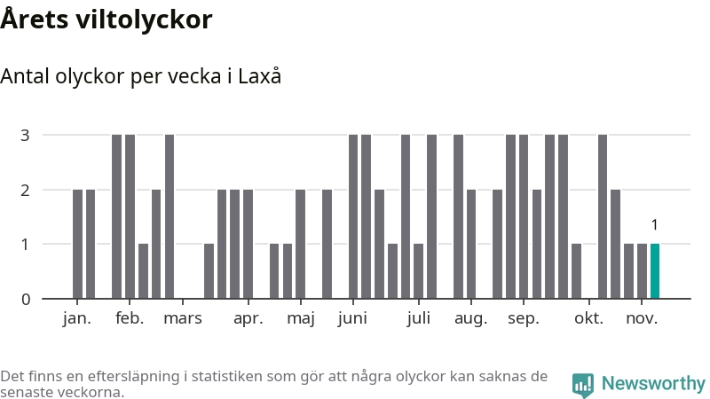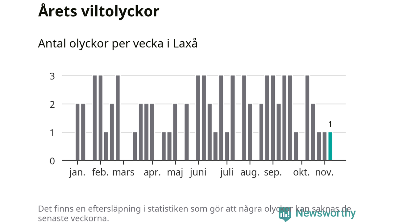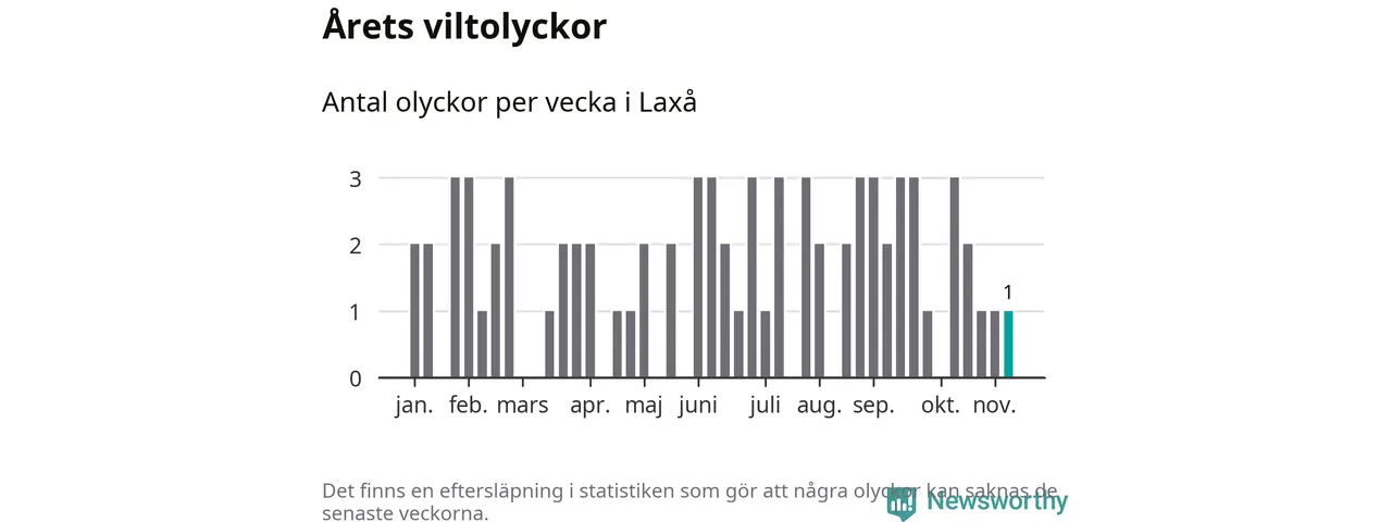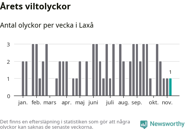 Från förra veckan (vecka 46) har hittills en viltolycka rapporterats in i Laxå kommun.