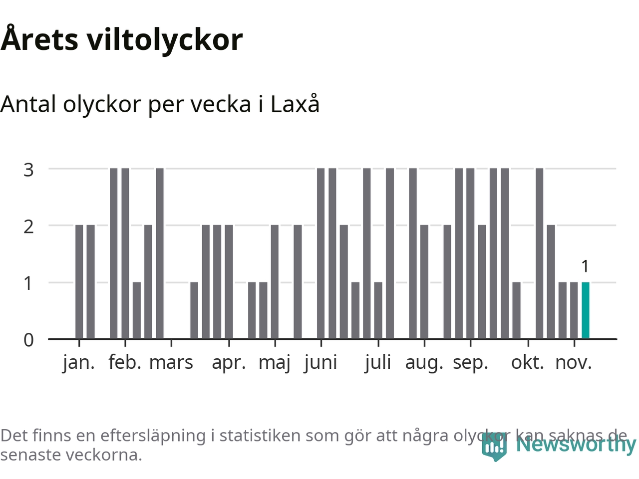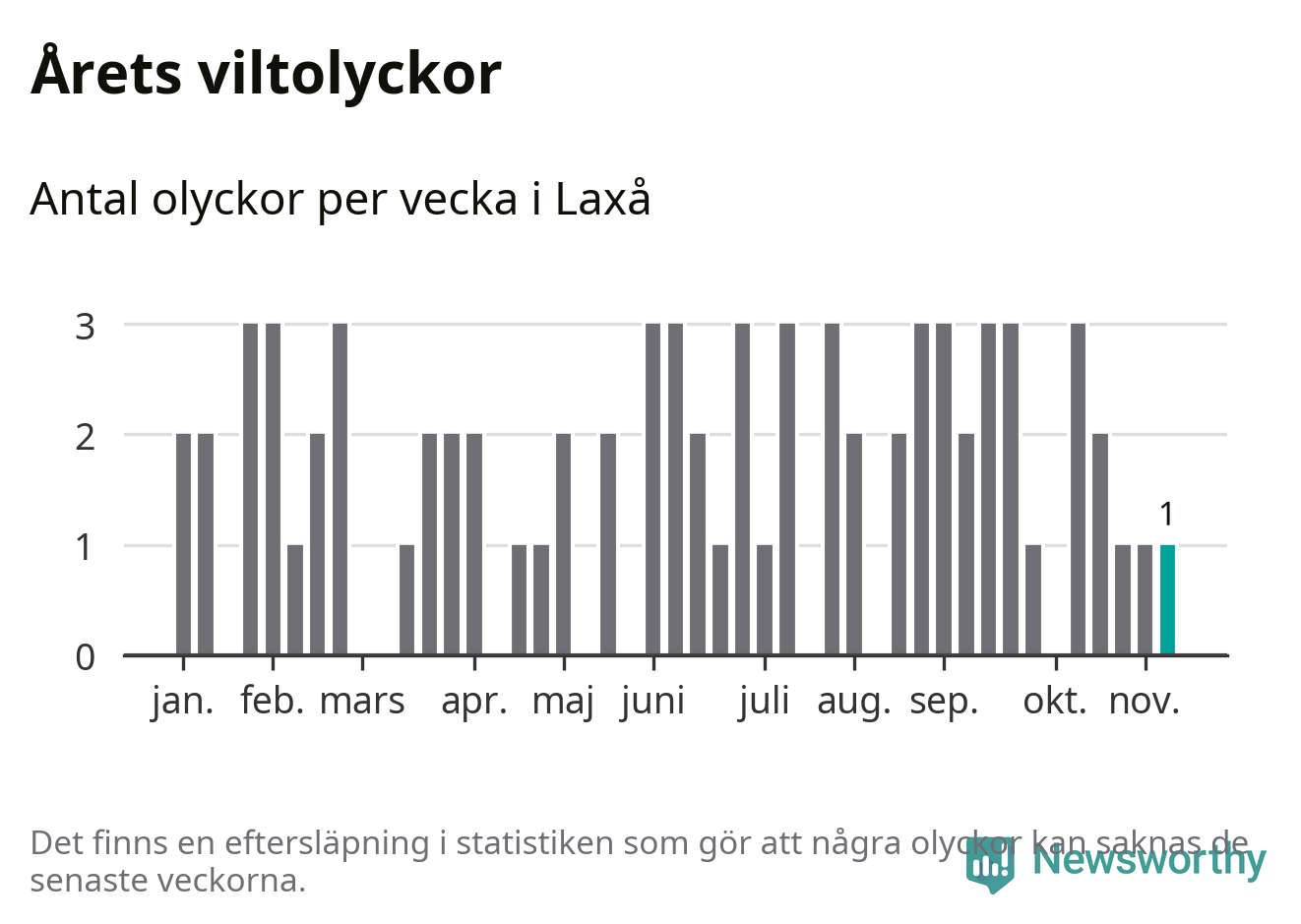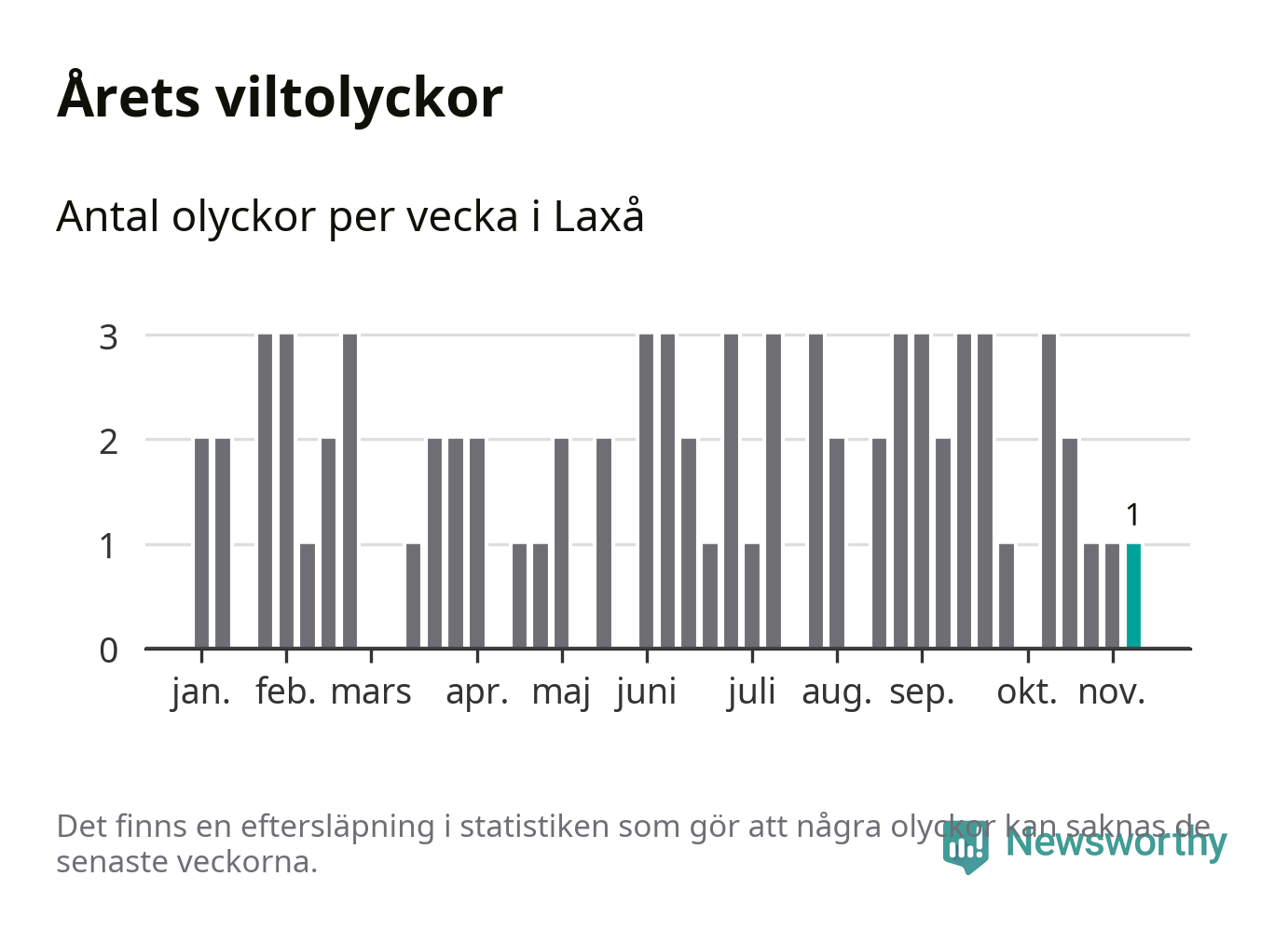 Från förra veckan (vecka 46) har hittills en viltolycka rapporterats in i Laxå kommun.