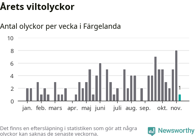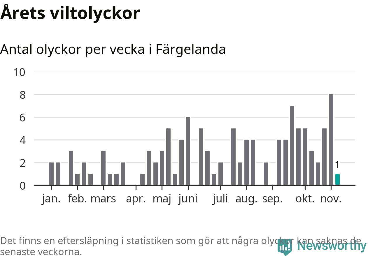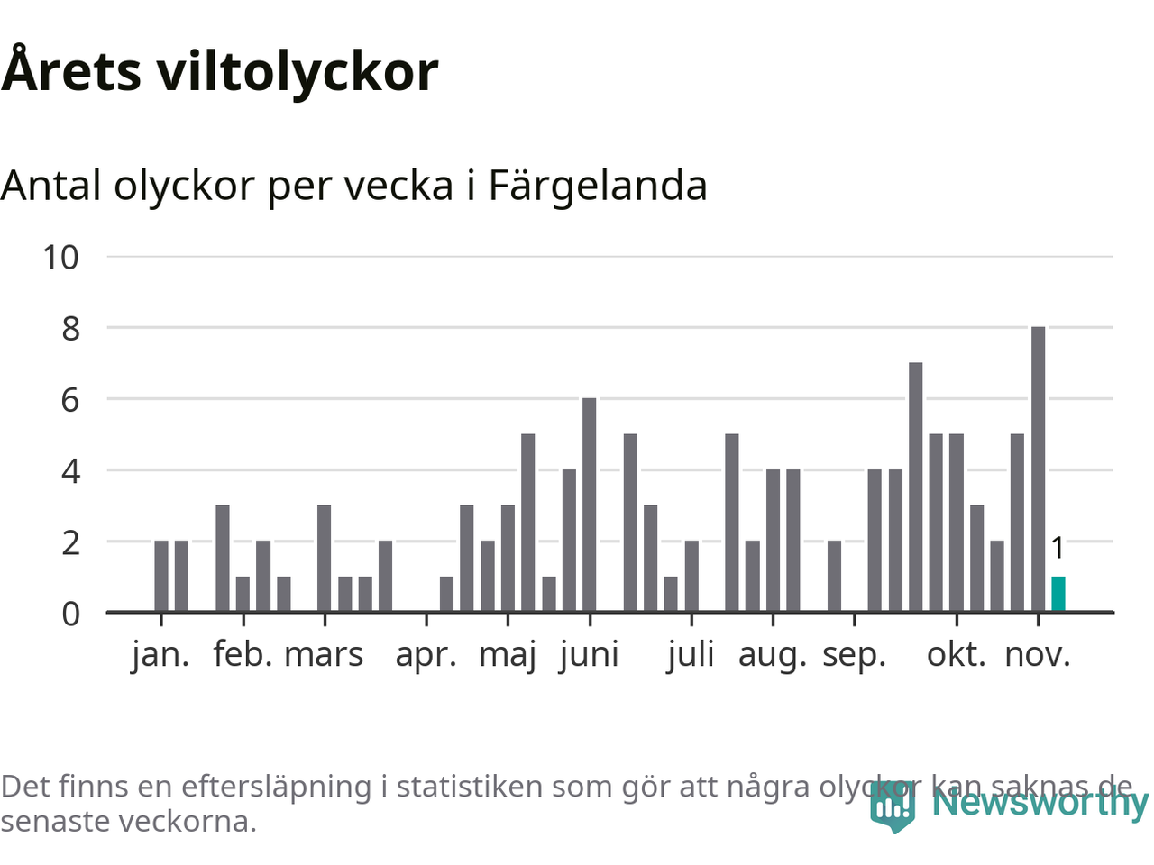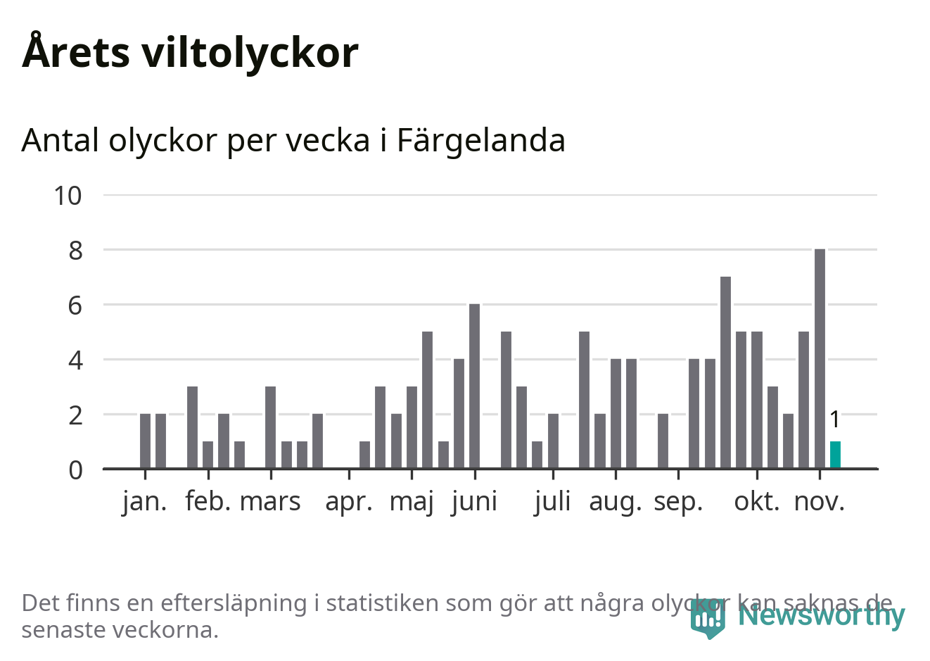 Från förra veckan (vecka 46) har hittills en viltolycka rapporterats in i Färgelanda kommun.