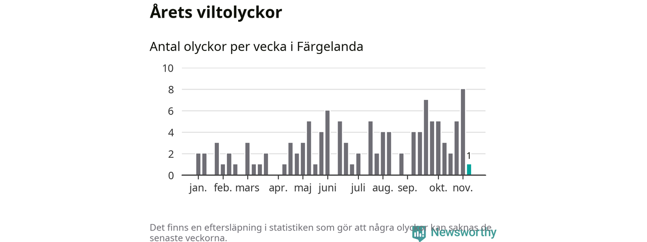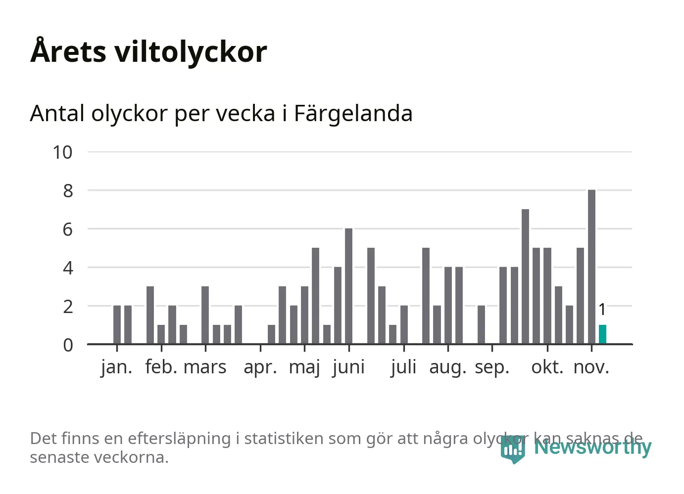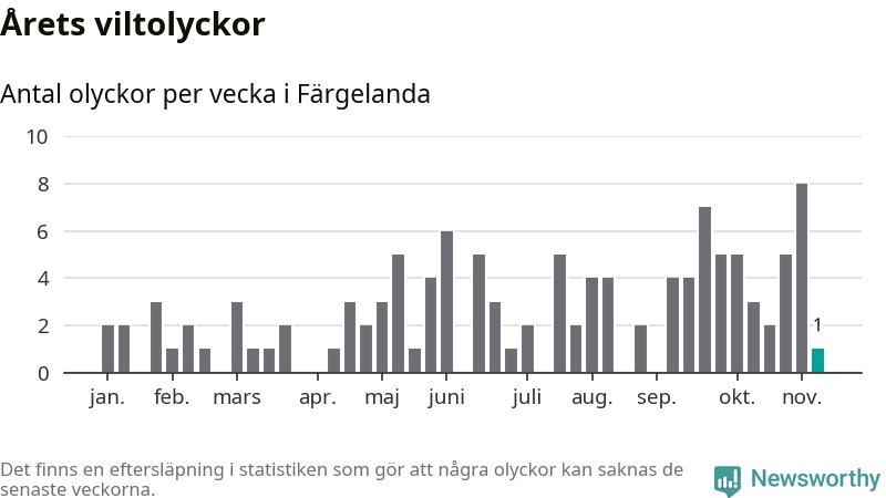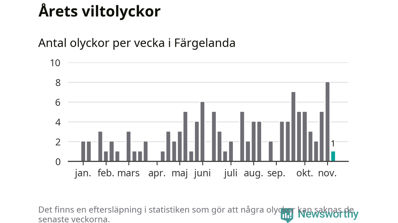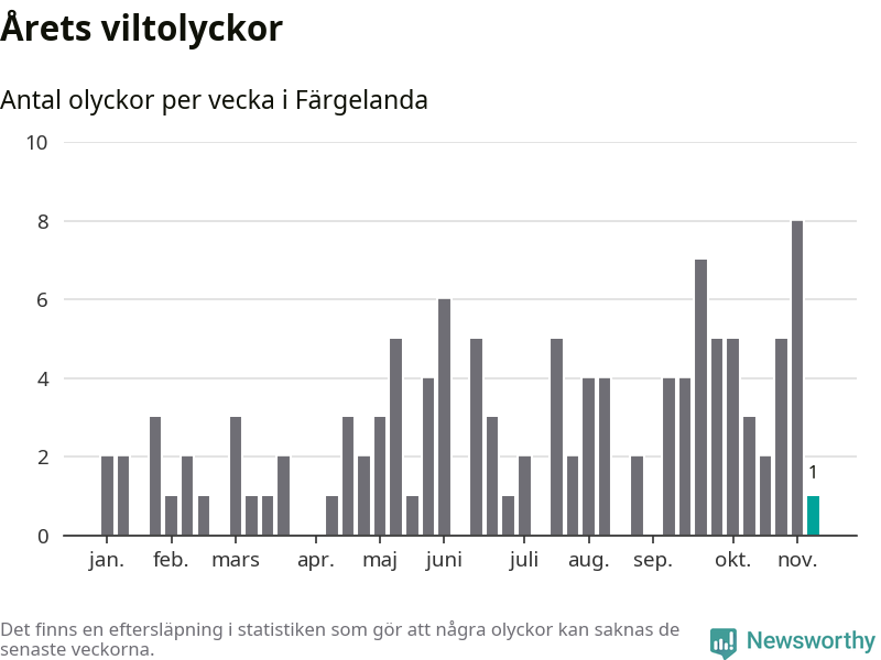 Från förra veckan (vecka 46) har hittills en viltolycka rapporterats in i Färgelanda kommun.