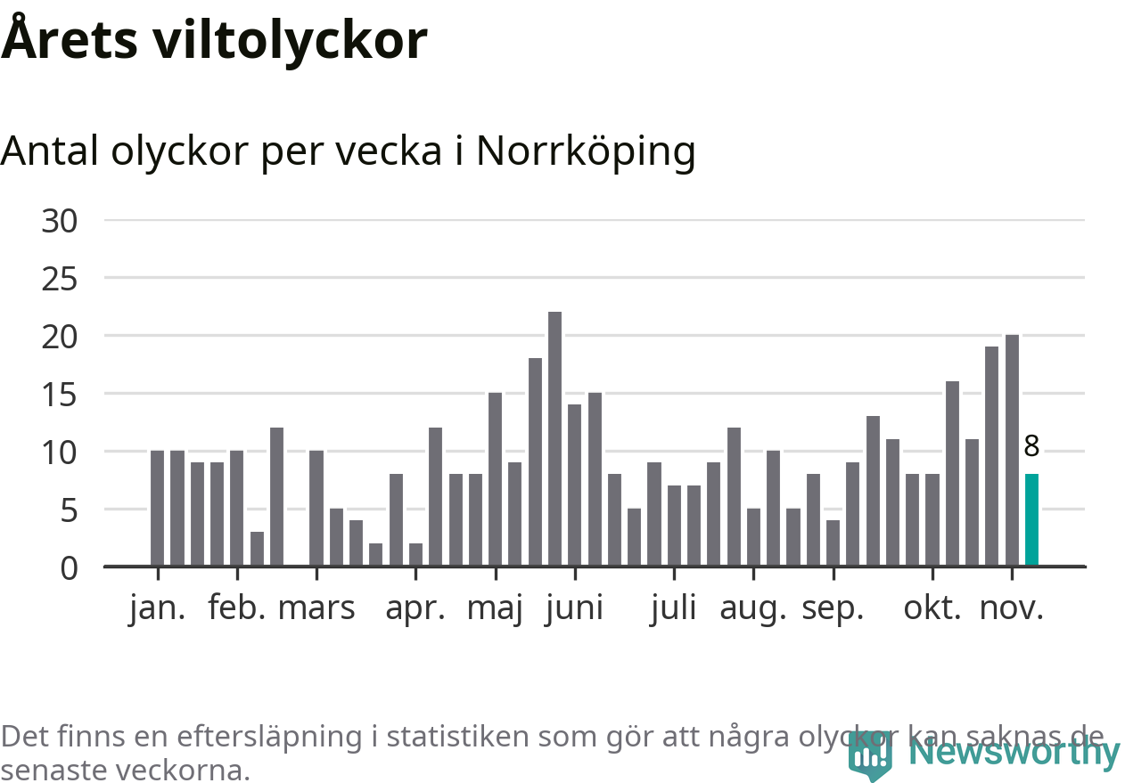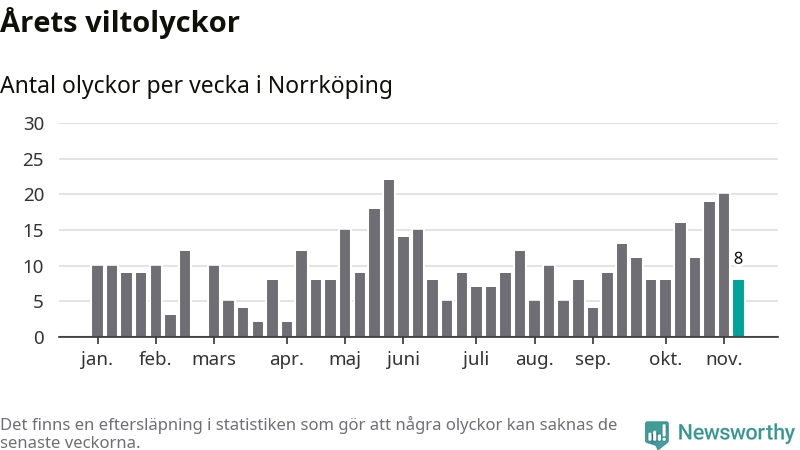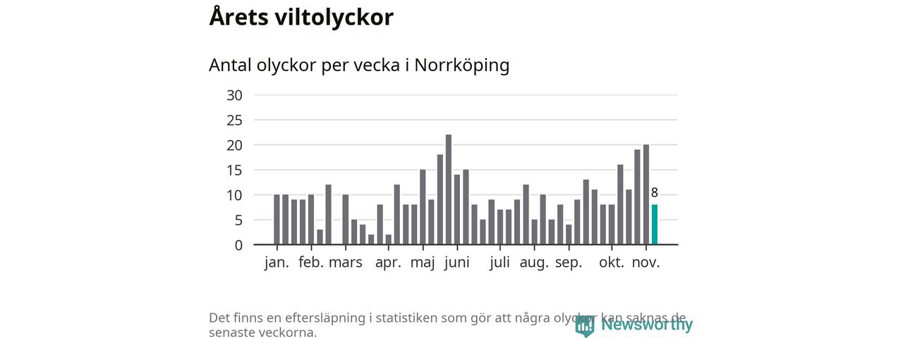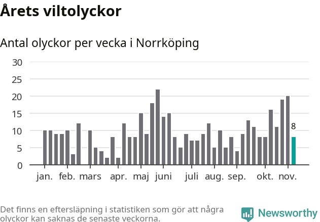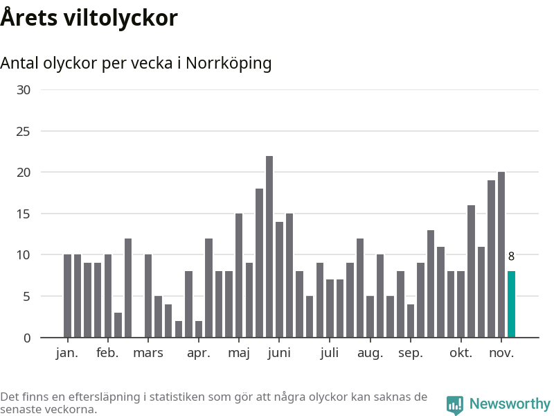 Hittills har åtta viltolyckor rapporterats in i Norrköpings kommun från vecka 46. Se listan här.