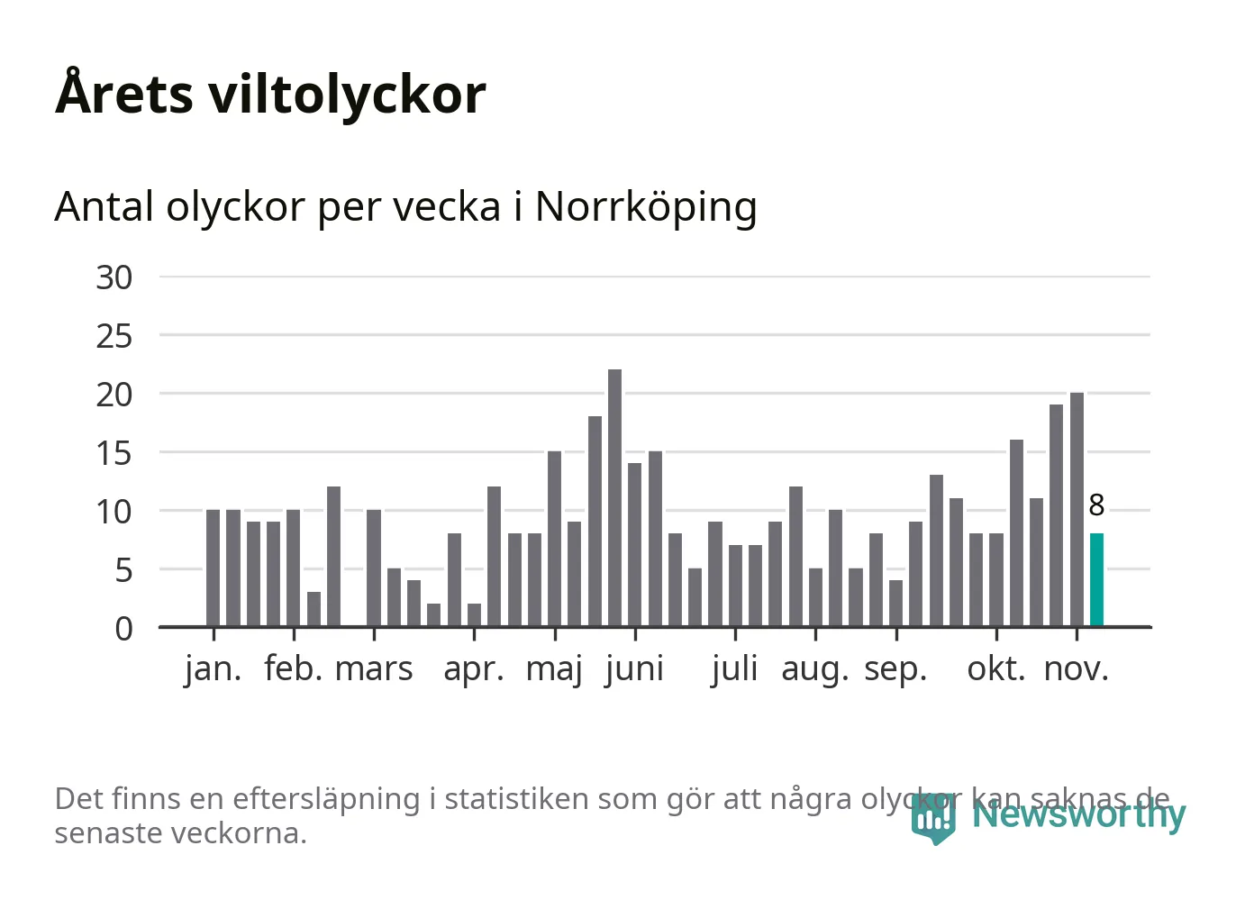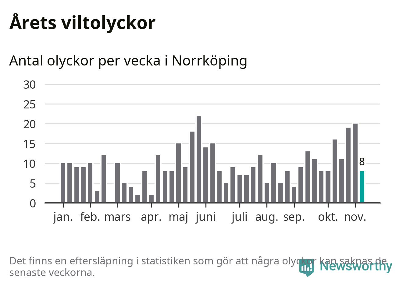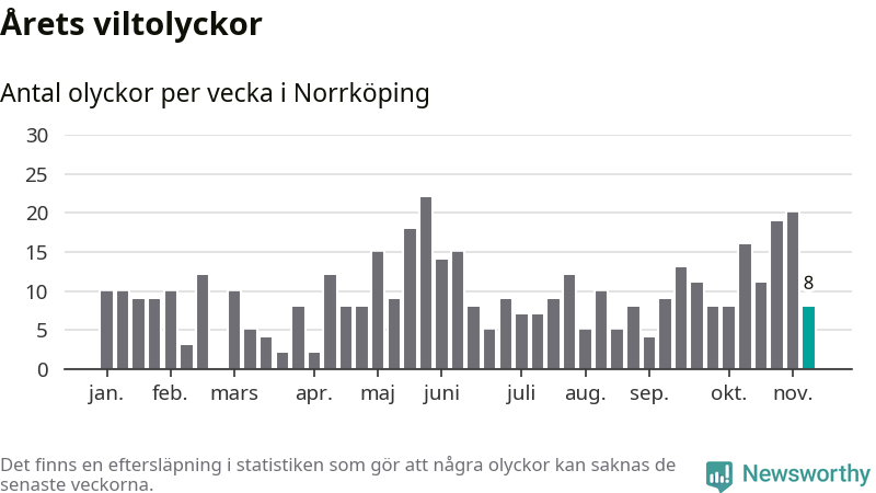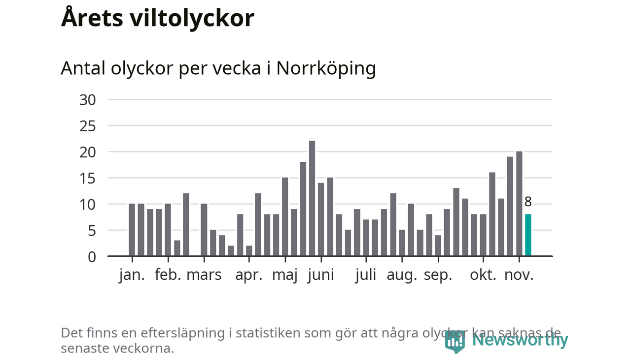 Hittills har åtta viltolyckor rapporterats in i Norrköpings kommun från vecka 46. Se listan här.