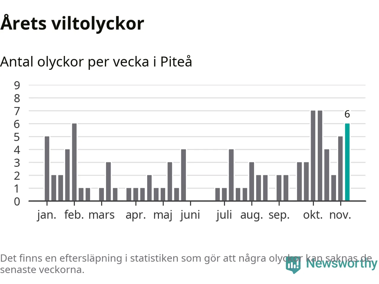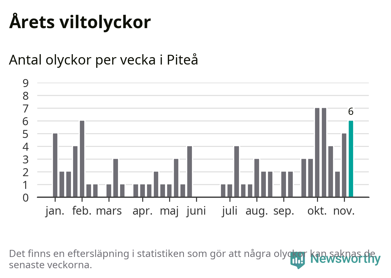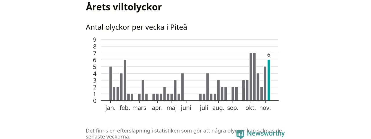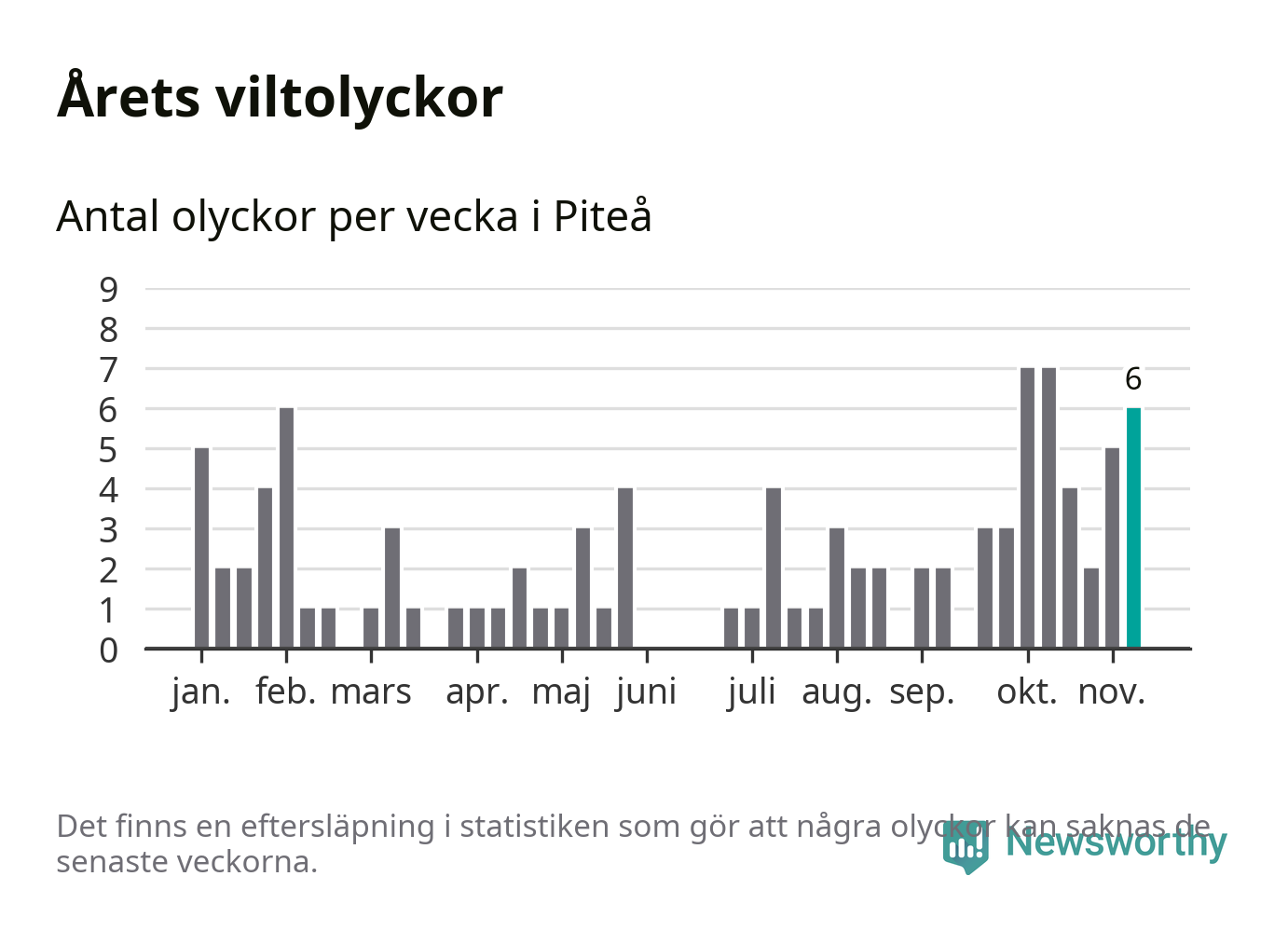 Hittills har sex viltolyckor rapporterats in i Piteå kommun från vecka 46. Se listan här.