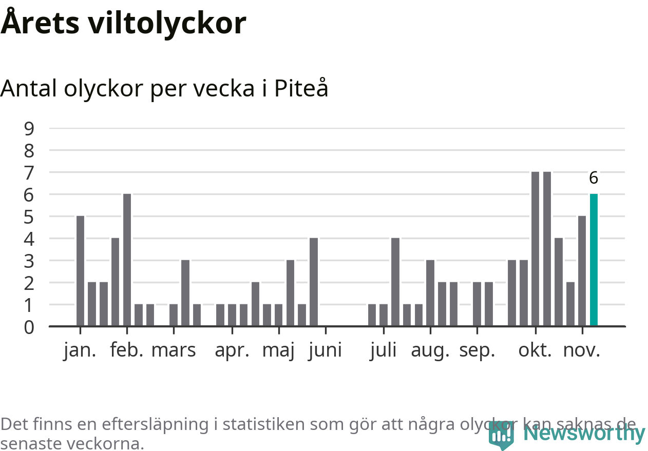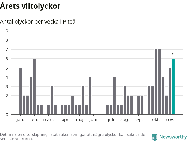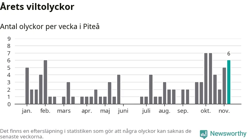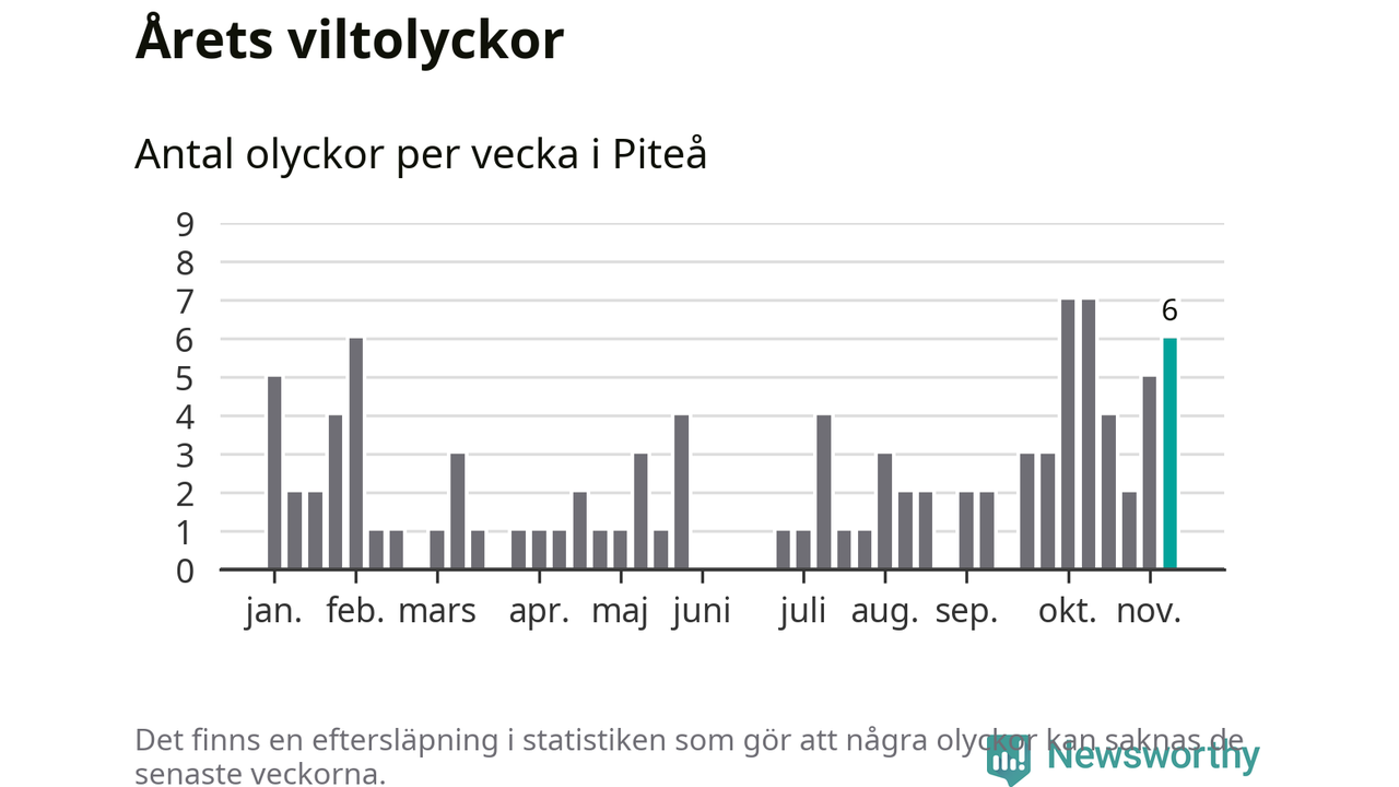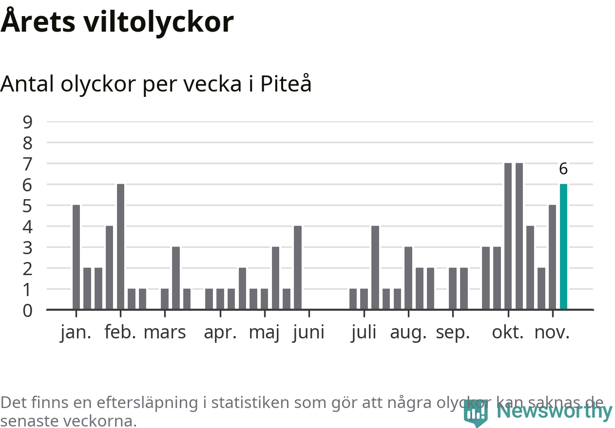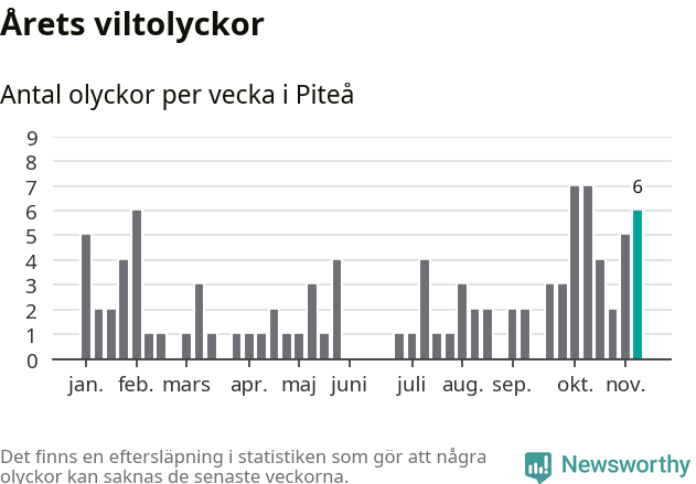 Hittills har sex viltolyckor rapporterats in i Piteå kommun från vecka 46. Se listan här.
