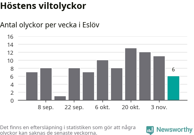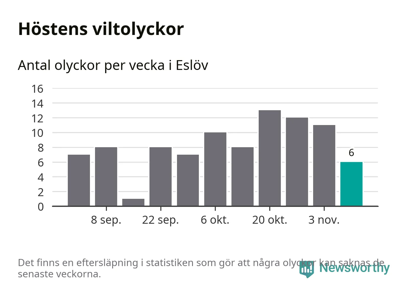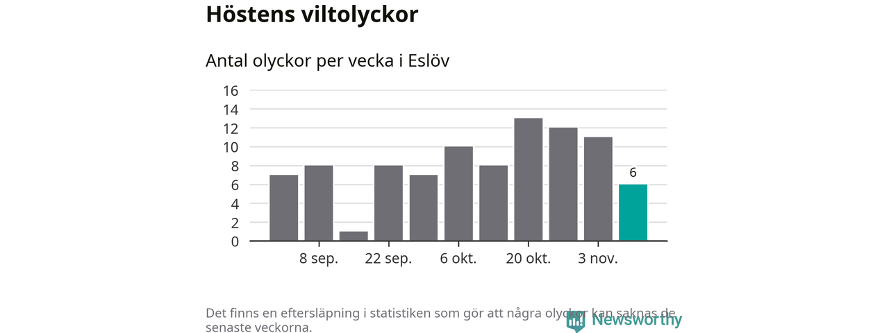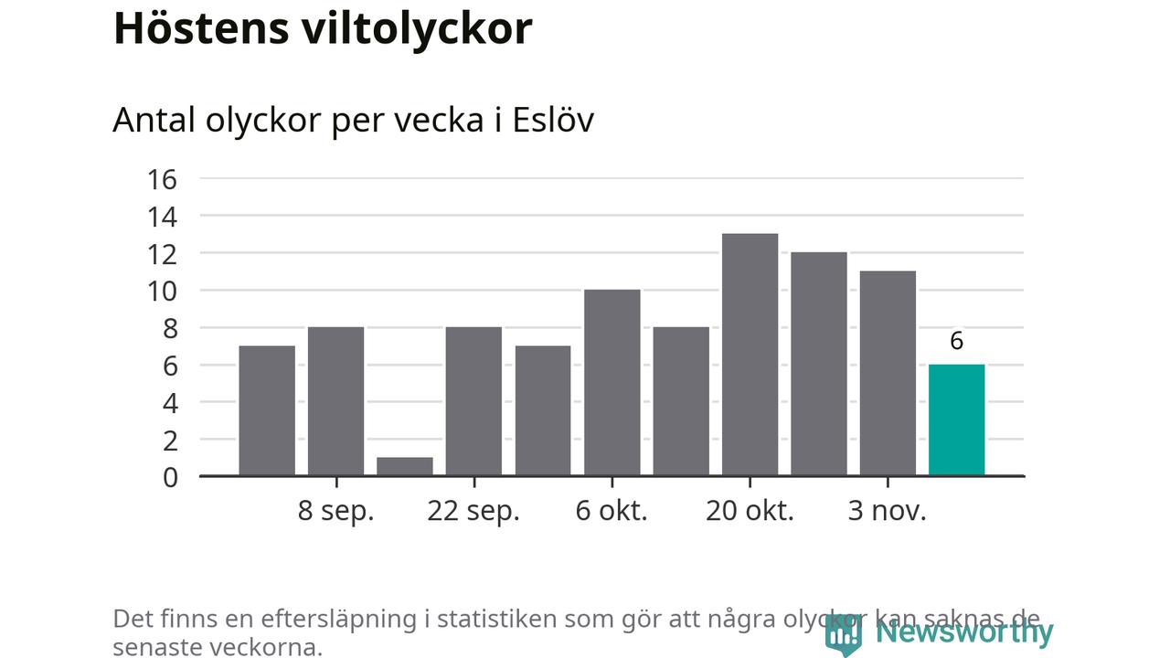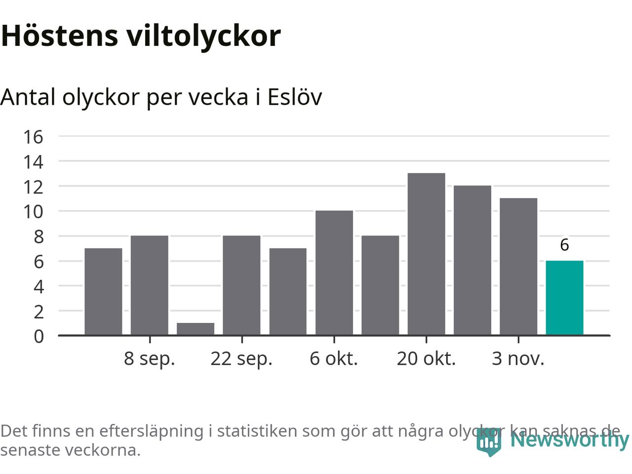 Under vecka 46 rapporterades sex viltolyckor in i Eslövs kommun. Därmed har det inträffat fler viltolyckor hittills den här hösten, än det brukar göra en hel genomsnittlig höst.