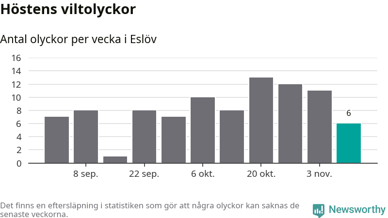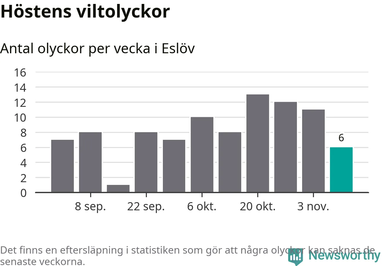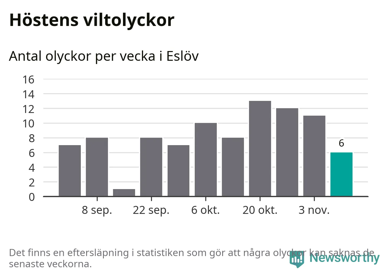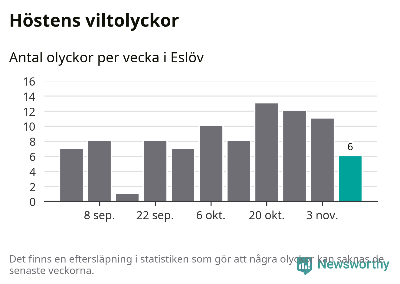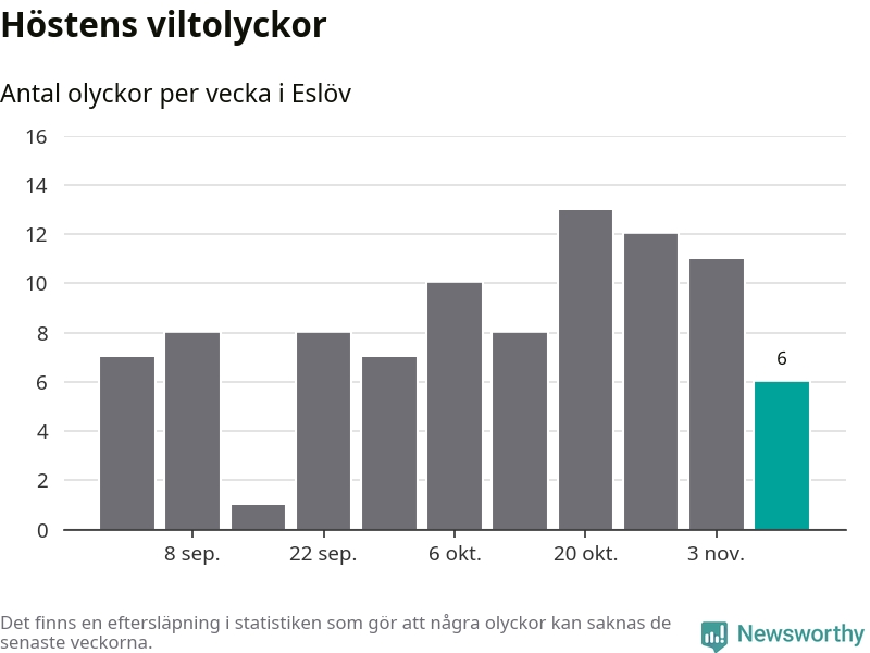 Under vecka 46 rapporterades sex viltolyckor in i Eslövs kommun. Därmed har det inträffat fler viltolyckor hittills den här hösten, än det brukar göra en hel genomsnittlig höst.
