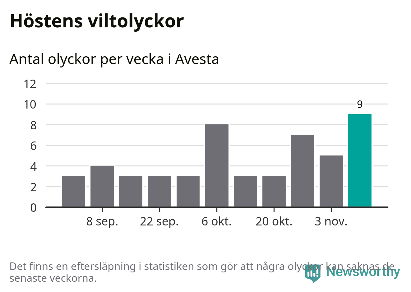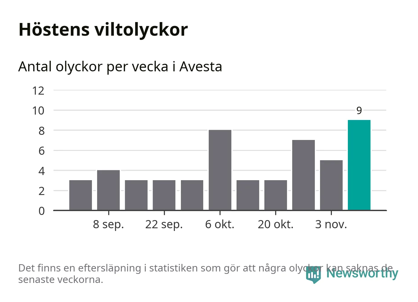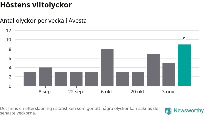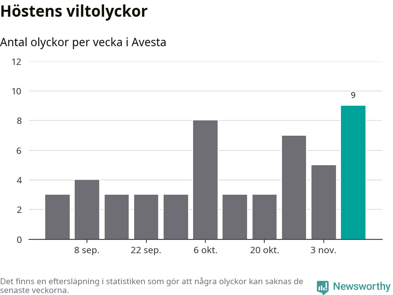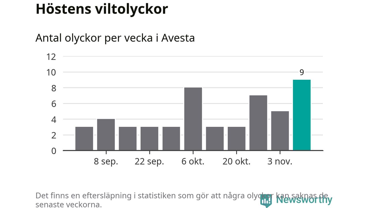 Under vecka 46 rapporterades nio viltolyckor in i Avesta kommun. Det är det största antalet på en vecka den här hösten.