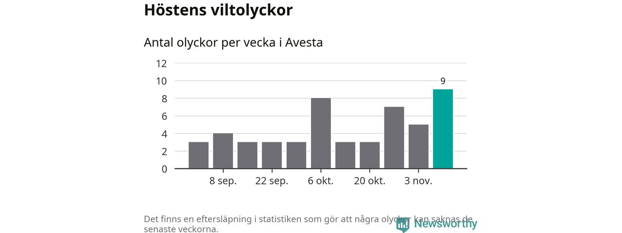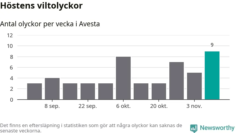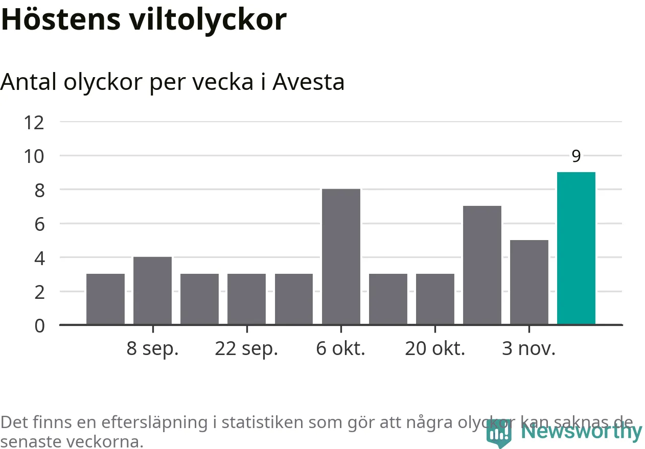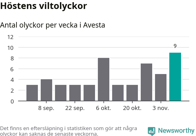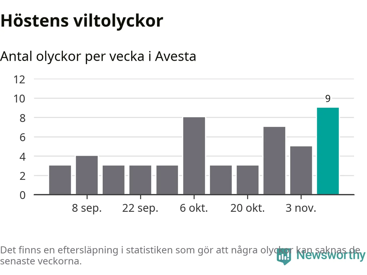 Under vecka 46 rapporterades nio viltolyckor in i Avesta kommun. Det är det största antalet på en vecka den här hösten.