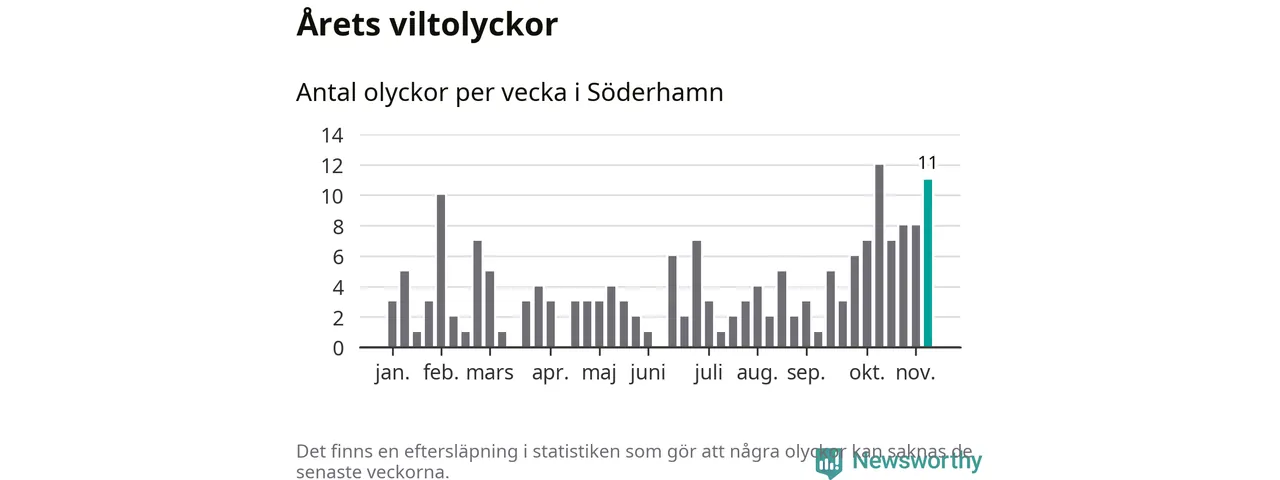 182 viltolyckor i kommunen. Det är mer än genomsnittet för motsvarande period (omkring 160) de senaste tio åren.